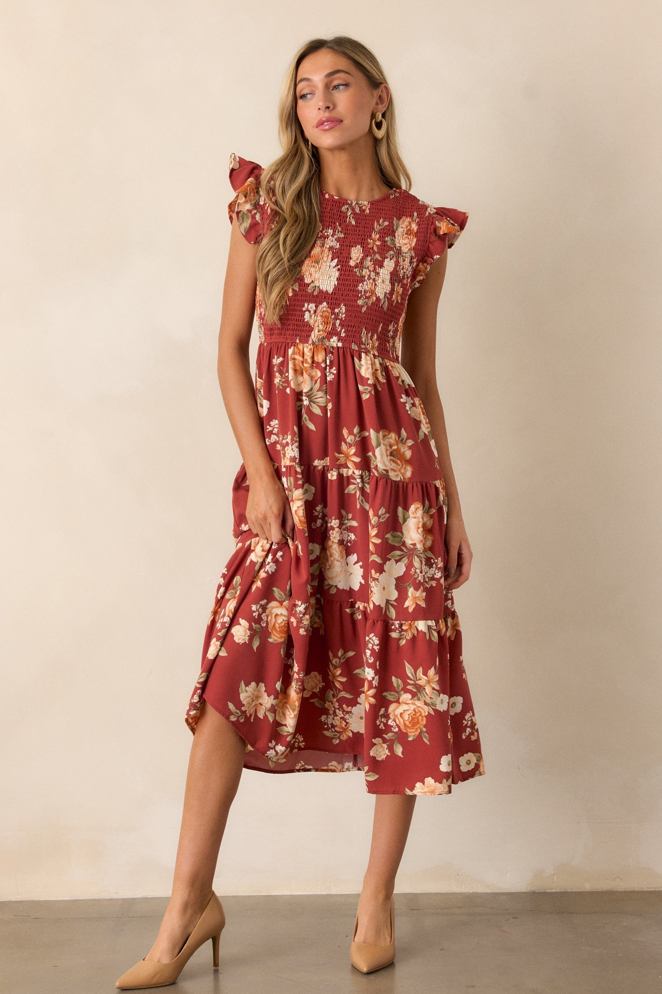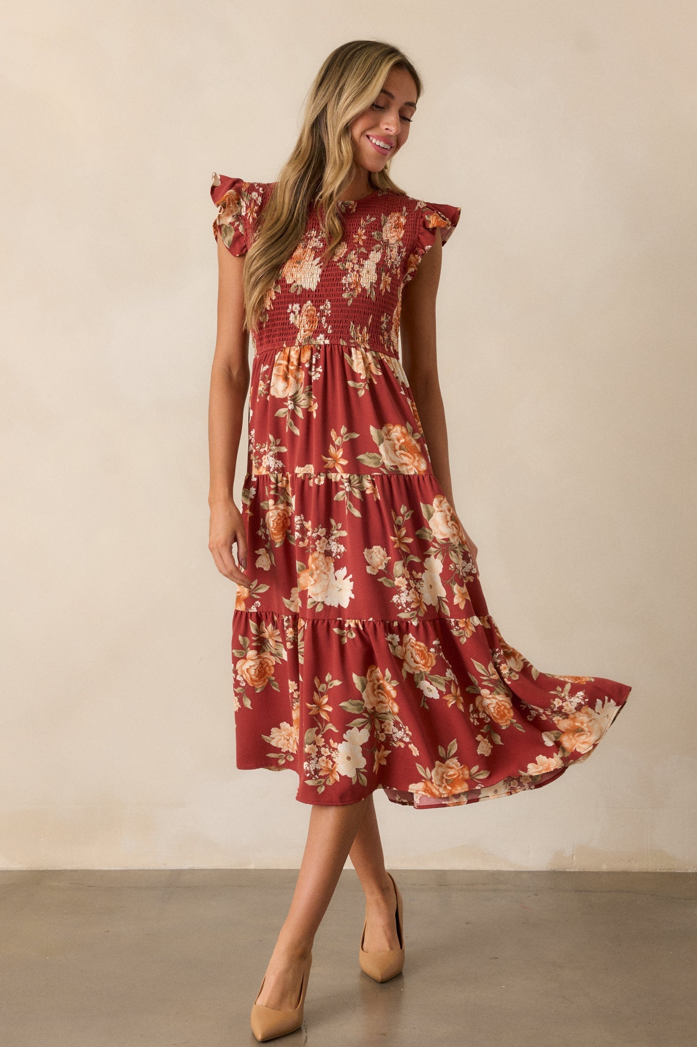 Get ready to turn heads in the Desert Dawn Midi Dress! This playful green floral dress features a midi length and a flowy silhouette, perfect for those hot summer days. With its vibrant colors and unique design, this dress will add a touch of fun to any wardrobe. Don't be surprised if you catch everyone's eye in this one! This red dress features a high neckline, a fully smocked bodice, a tiered design, short ruffle sleeves, a back button and loop closure and a flowing silhouette.