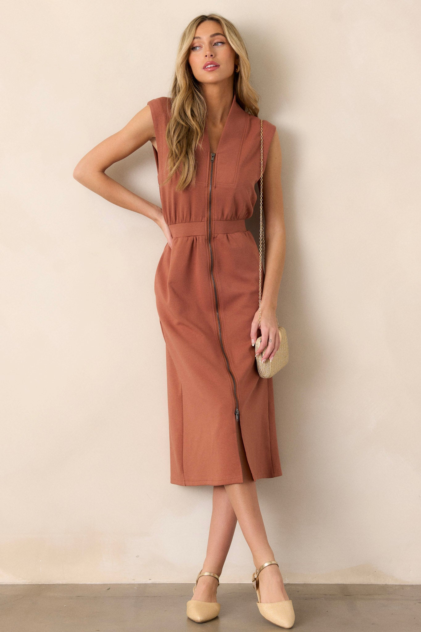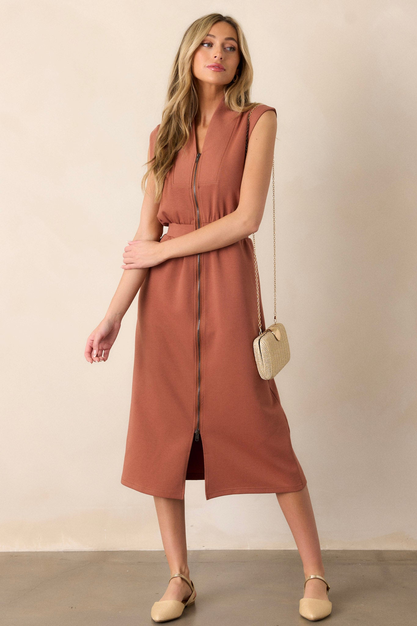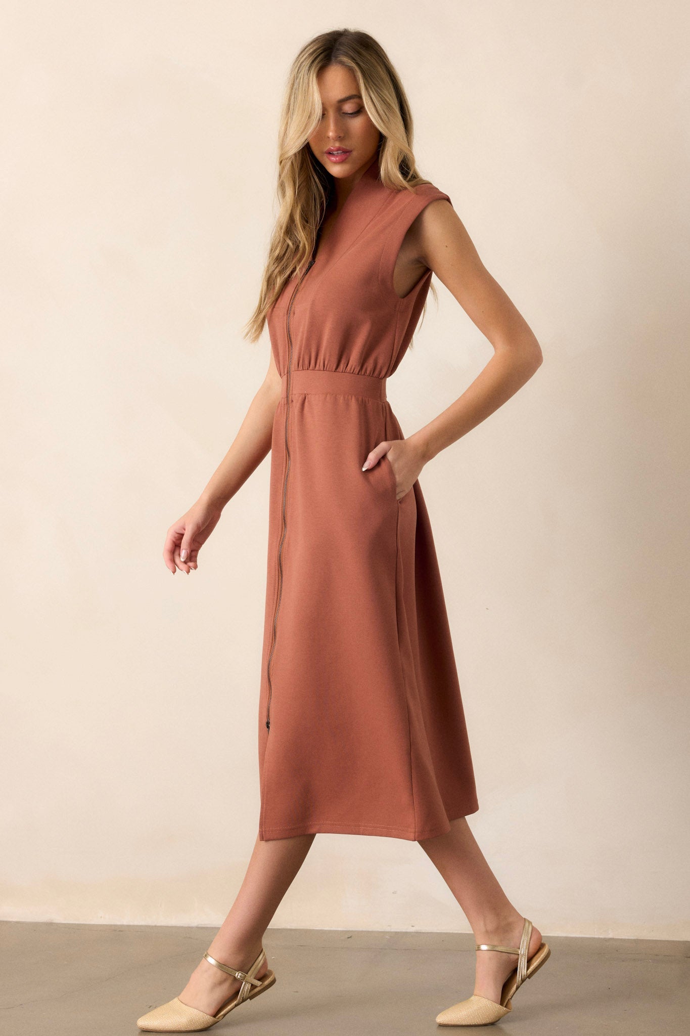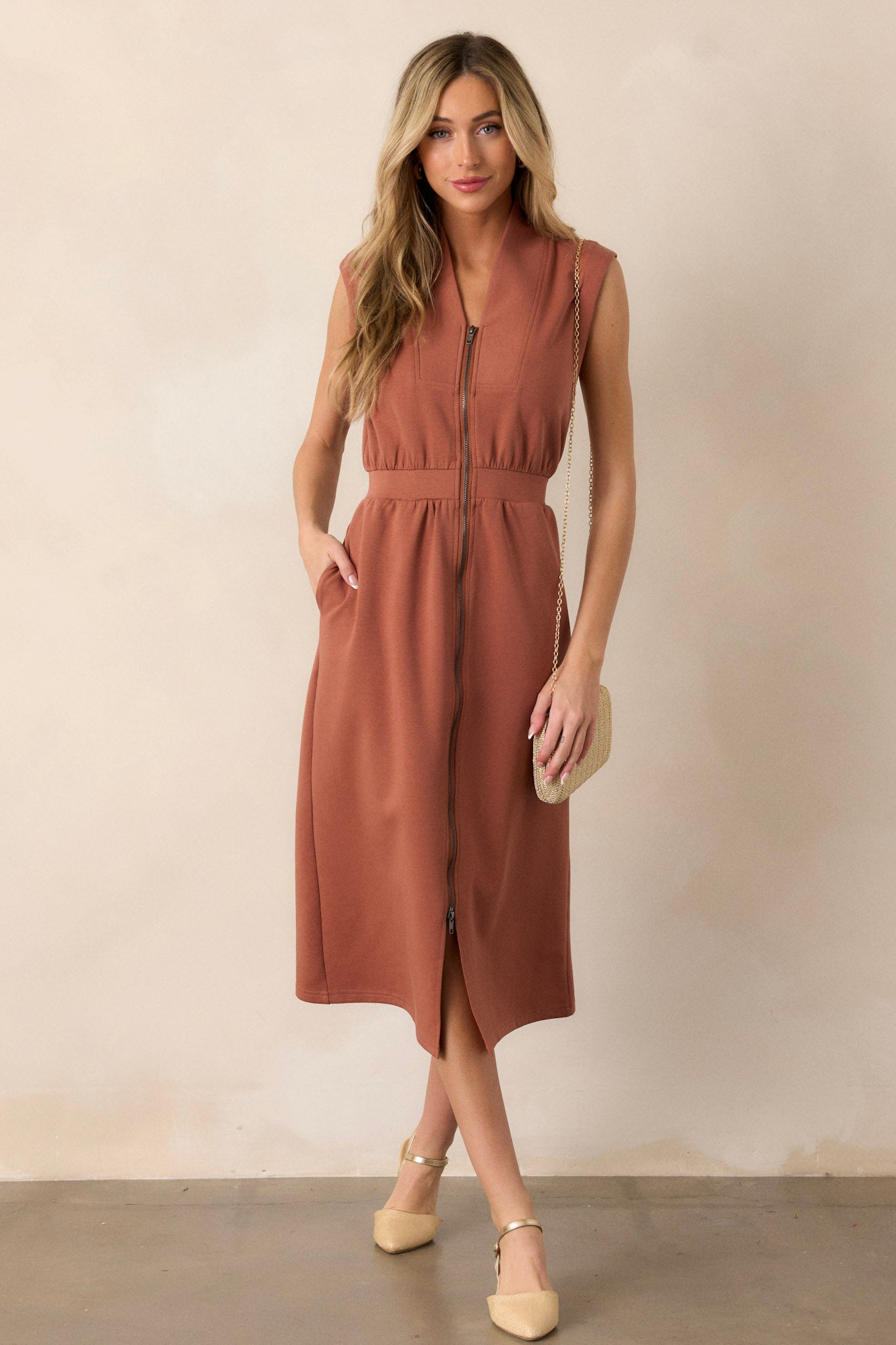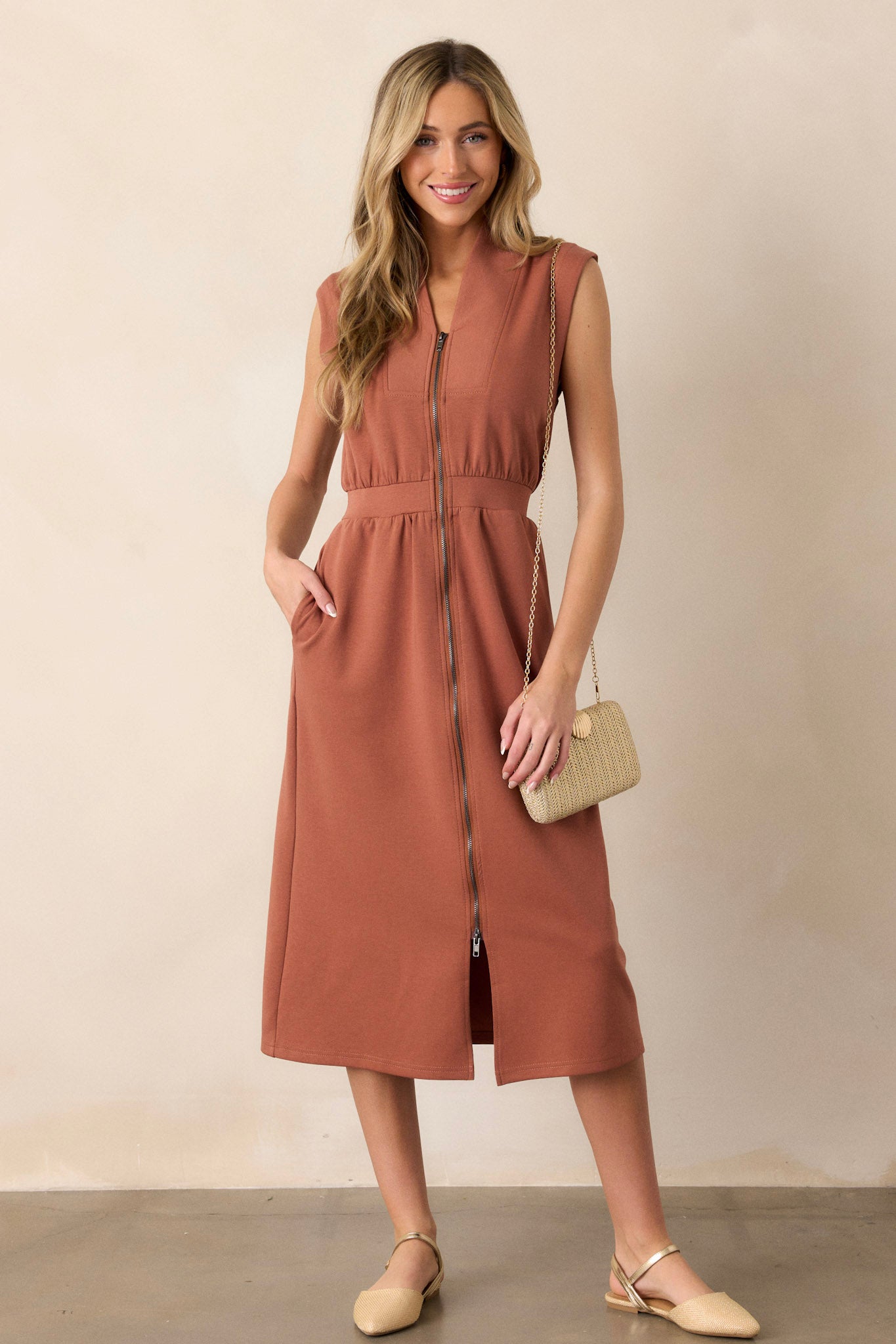 Stay cool and stylish in our Distant Sun Terracotta Sleeveless Midi Dress. Perfect for any occasion, this dress features a flowy design and sleeveless cut for ultimate comfort. The rich terracotta color will make you stand out while the midi length adds a touch of sophistication. This terracotta dress features a v-neckline, a slight collar, a functional full zip front, functional hip pockets, and a sleeveless design.