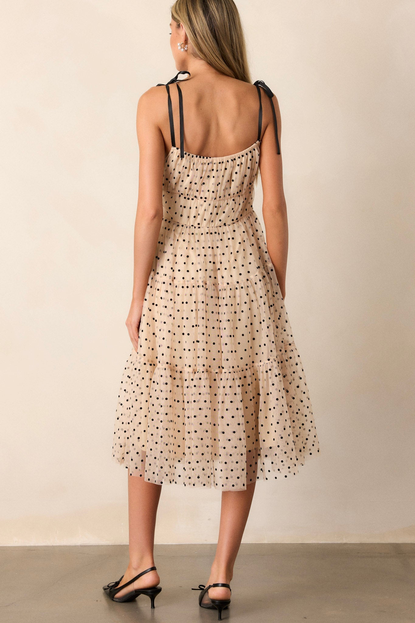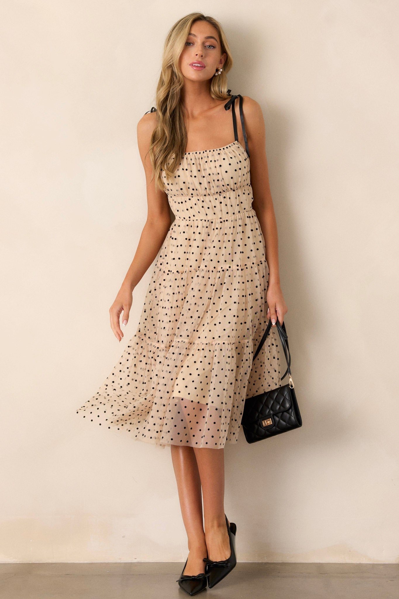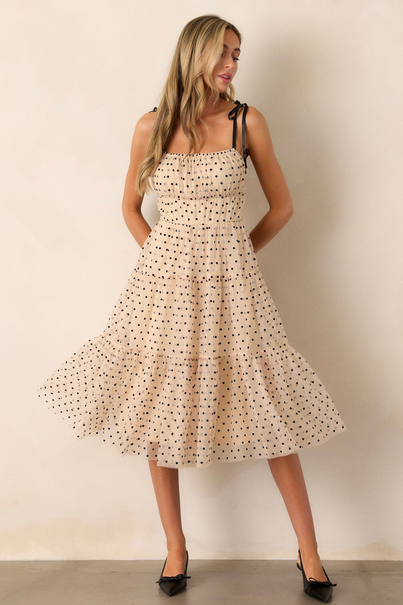 Get ready for a fun and flirty affair with this Beige Polka Dot Midi Dress! Featuring a playful polka dot design, this dress is sure to turn heads. Its midi length adds a touch of sophistication, while the dotted print adds a playful touch. Perfect for any special occasion, this dress will make you stand out in style! This beige midi dress features a square neckline, thin self-tie straps, an elastic waistline, tiers, black polka dots, and tulle.
