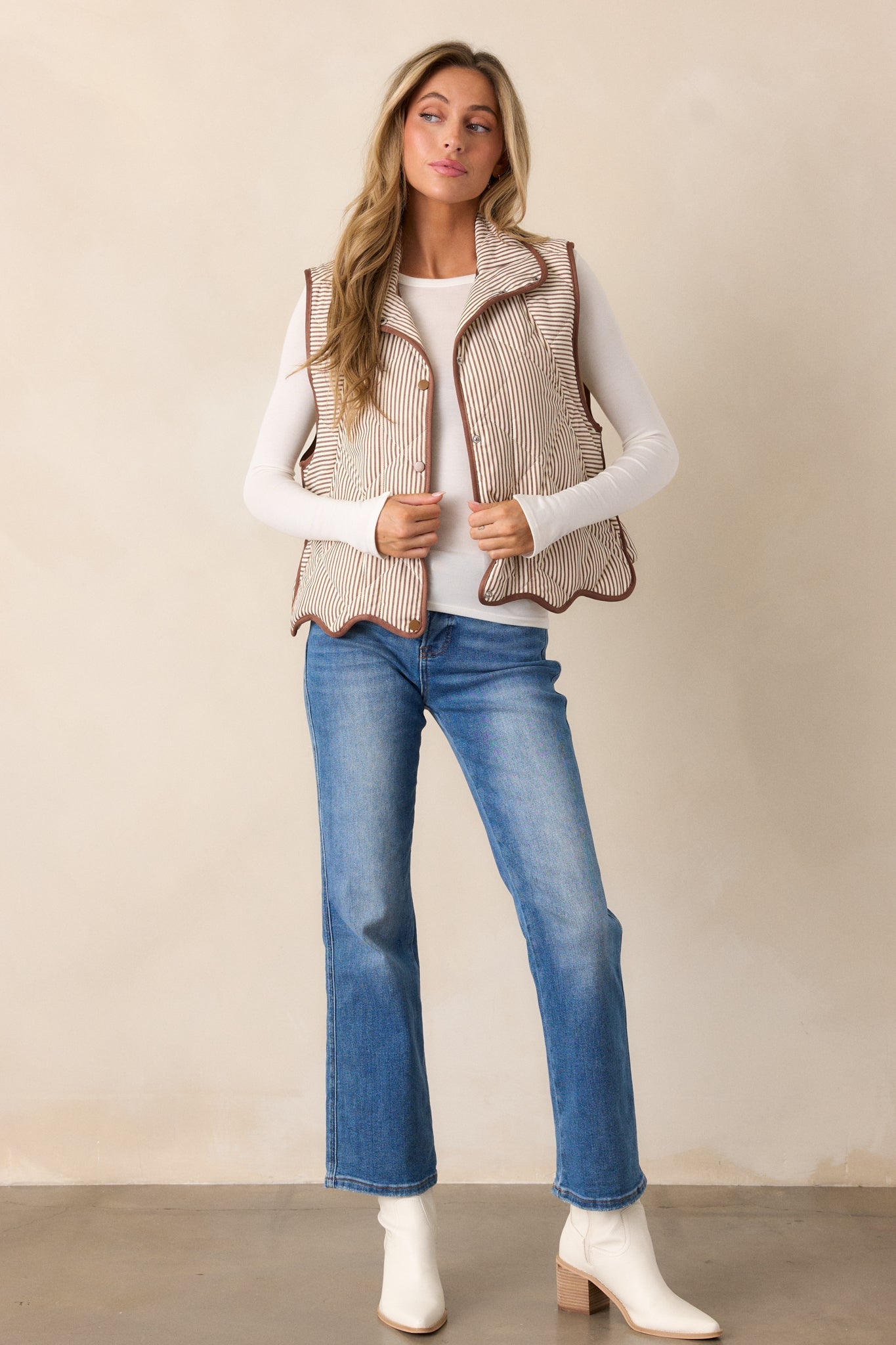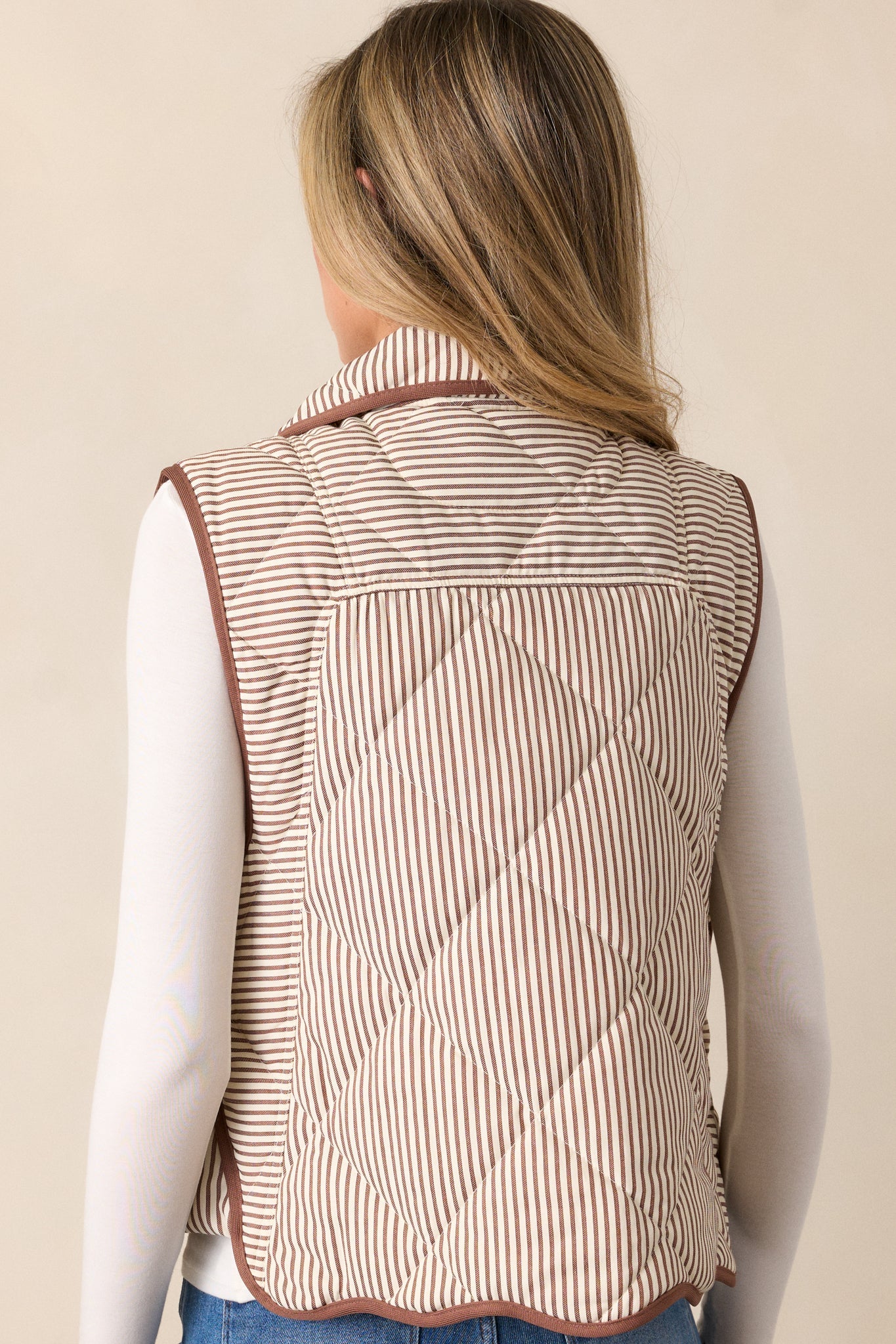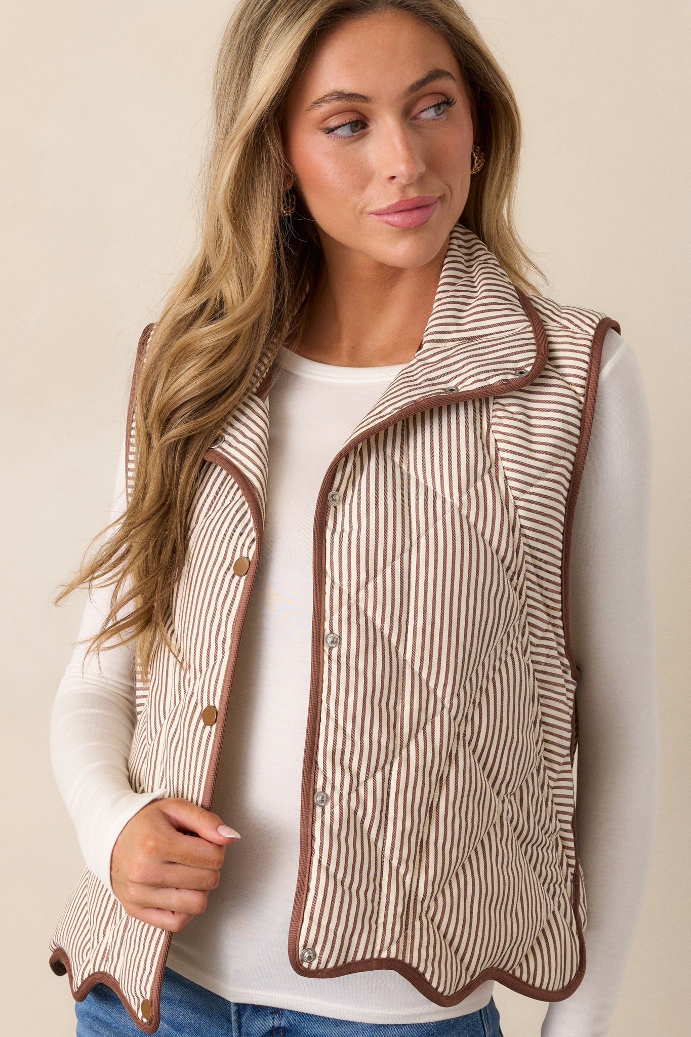 Introducing our Drifting Branches Chocolate Stripe Quilted Vest. Stay warm and stylish with this quilted vest, with a unique green stripe design and comfortable fit. Perfect for any outdoor adventure or cozy day, this vest is a must-have addition to your wardrobe. This chocolate vest features a collared neckline, button front with snap buttons, quilted pattern with stripe detailing throughout, brown knit hems and wavy bottom seam.