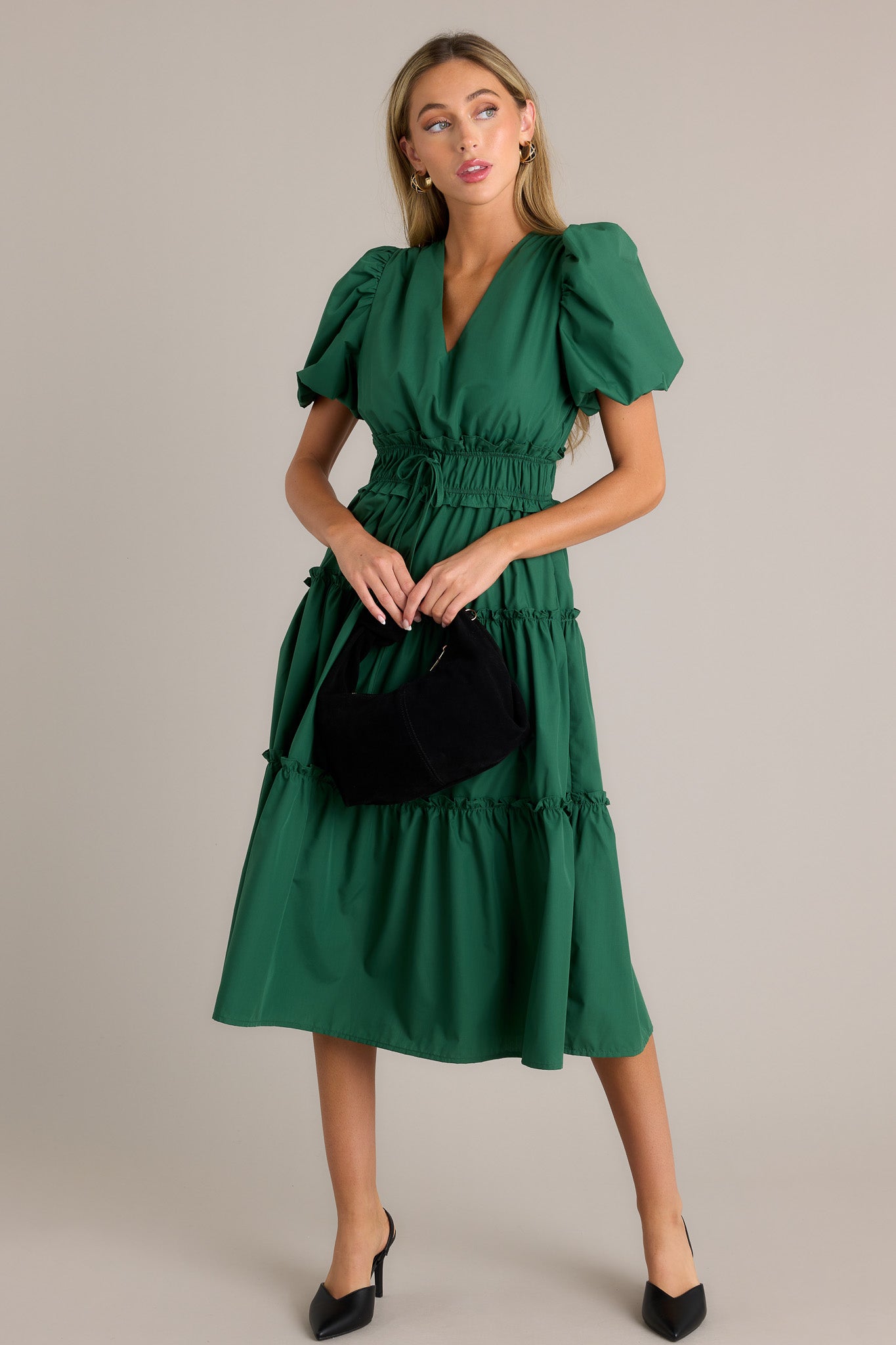 "Look effortlessly chic in our Easily Understood Hunter Green Puff Sleeve Midi Dress! Its puffy sleeves add a touch of whimsy, while the midi length keeps things classy. Perfect for any occasion, this dress is both stylish and comfortable. This green midi dress features a v-neckline, a ruffled elastic waistband, self-tie waist features, functional hip pockets, a tiered design, and short puffed sleeves.