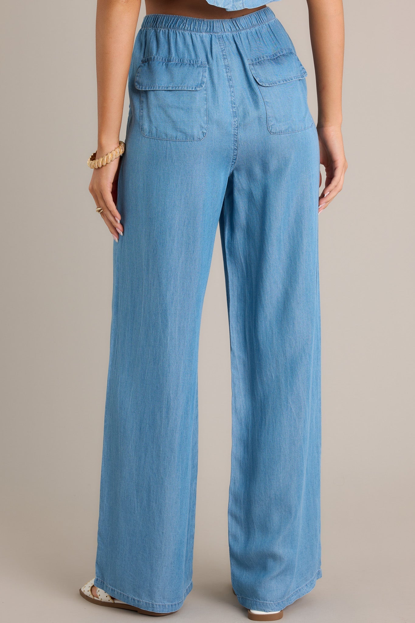 Introducing the Easy Living Chambray Drawstring Pants! Enjoy effortless comfort with these light and breathable pants, perfect for any laid-back occasion. The drawstring waist adds a touch of casual charm, making lounging even more enjoyable. Say goodbye to restrictive clothing and hello to comfort! These chambray pants feature an elastic waist band, a self tied drawstring, functional front & back pockets, and a wide leg.