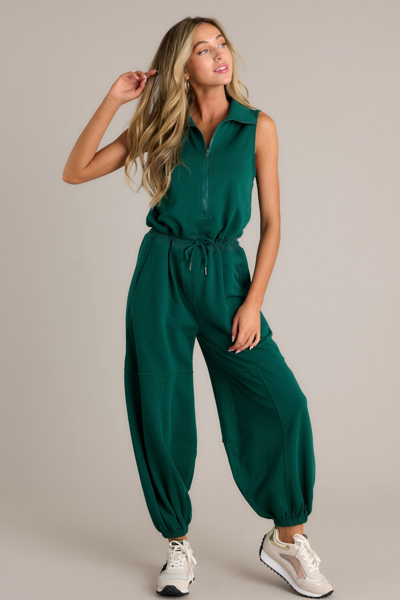 Get ready to jump into effortless luxury with our Zip Front Hunter Green Jumpsuit! With a flattering fit and easy zip closure, this jumpsuit offers both style and convenience. Perfect for any casual day, this jumpsuit will have you feeling chic and comfortable. This green jumpsuit features a collared neckline, a functional zipper front, a self-tie drawstring waist, functional hip pockets, elastic cuffed ankles, and a sleeveless design.