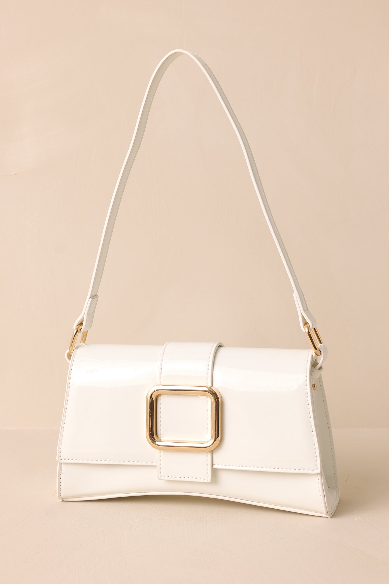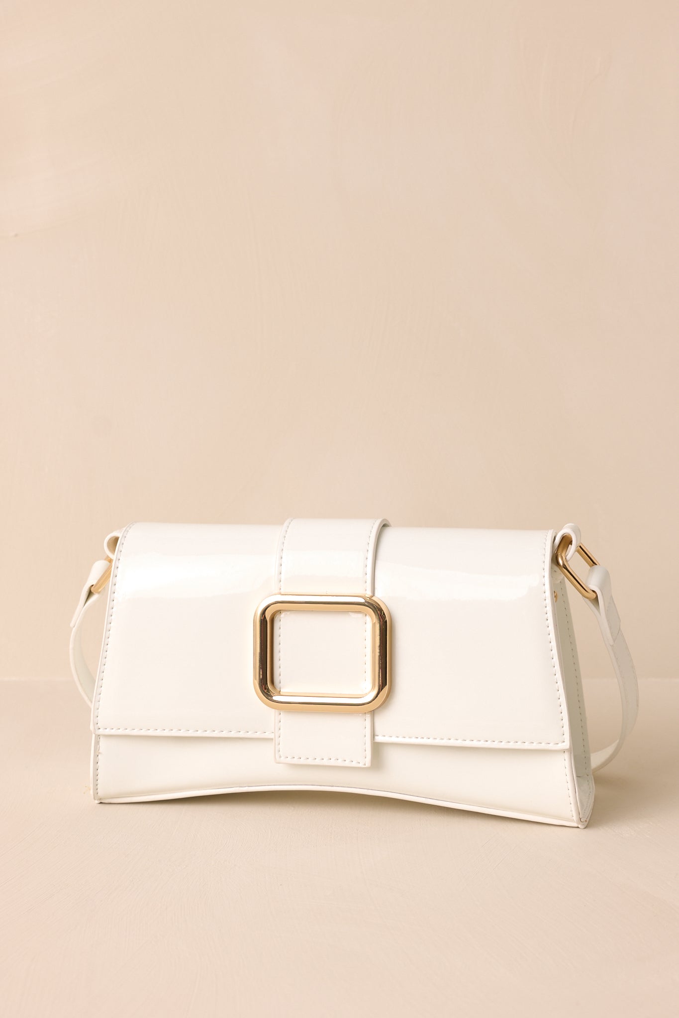 Carry sophistication with the Elegant Allure Ivory Glossy Handbag. Its sleek design and high shine finish make it a chic addition to any outfit. With enough space for all your essentials, this handbag combines style and practicality. Step out in style with this must-have accessory! This handbag features a gold rectangular buckle, two snap clasps, interchangeable straps and a glossy chic design.