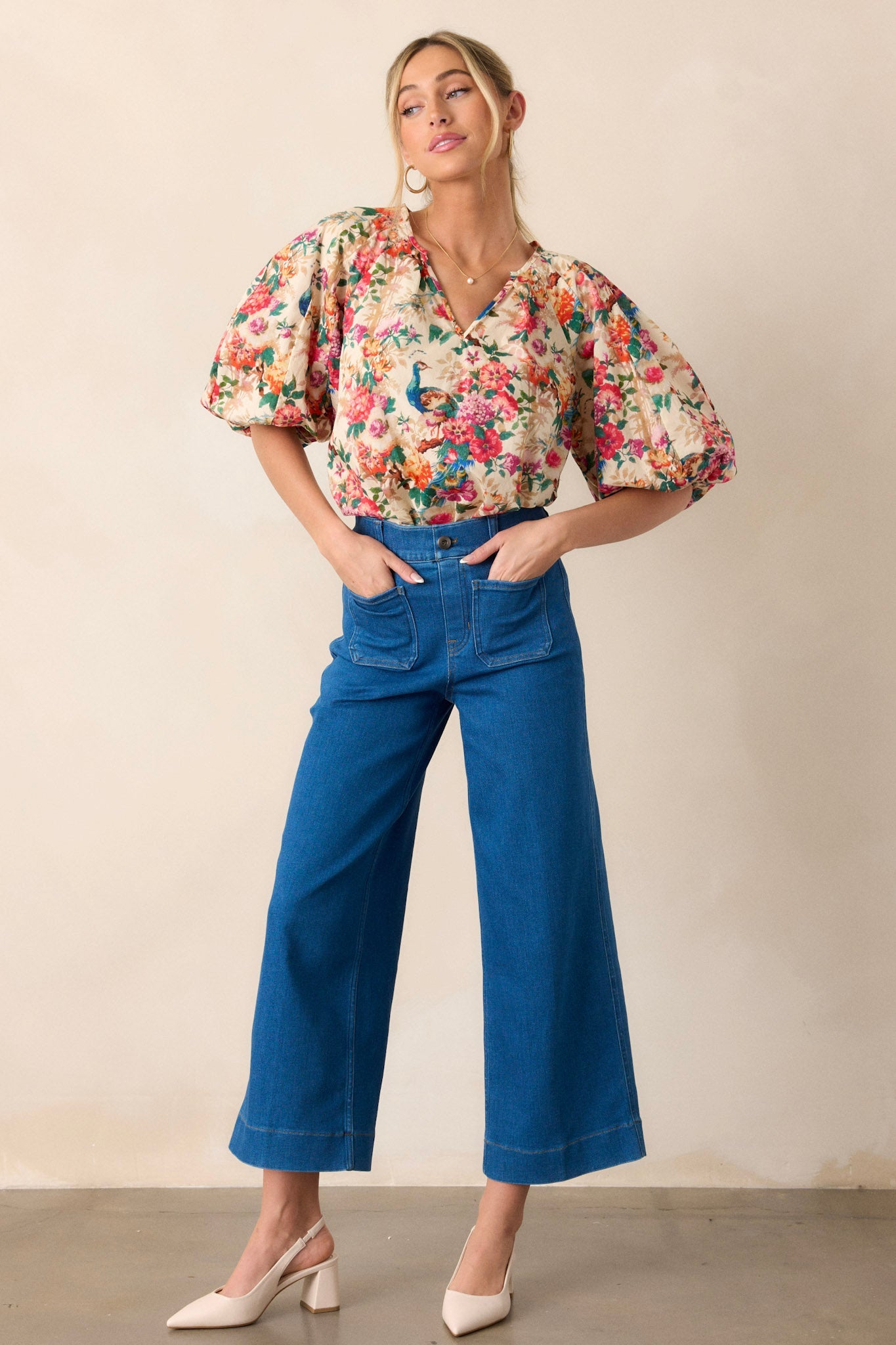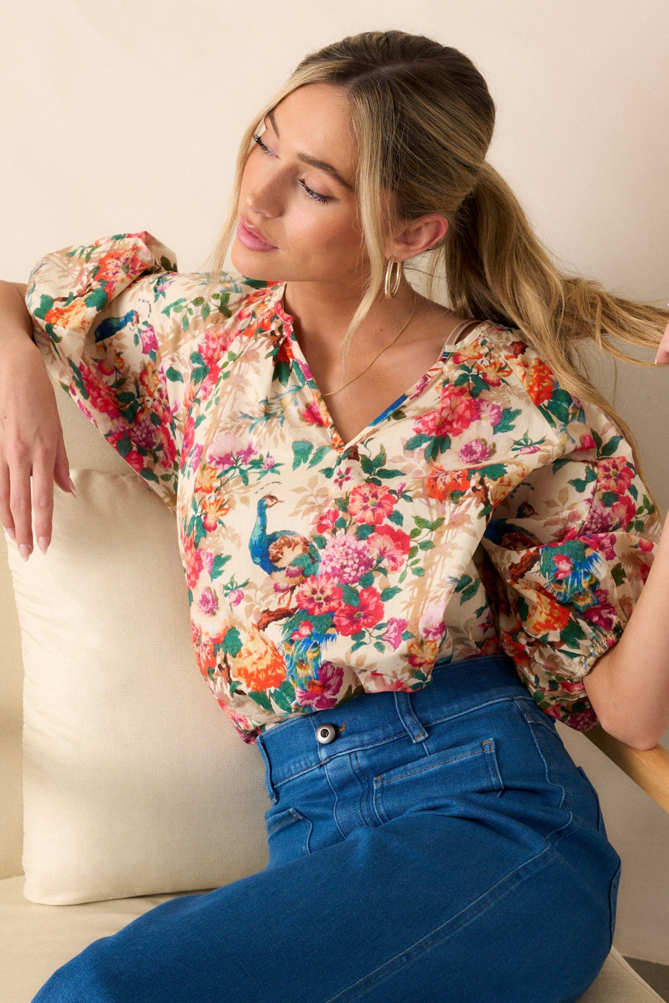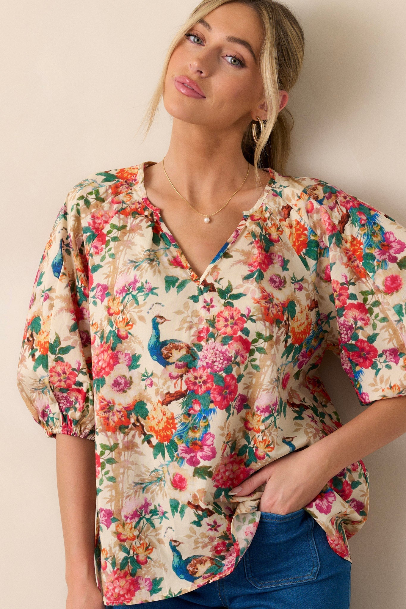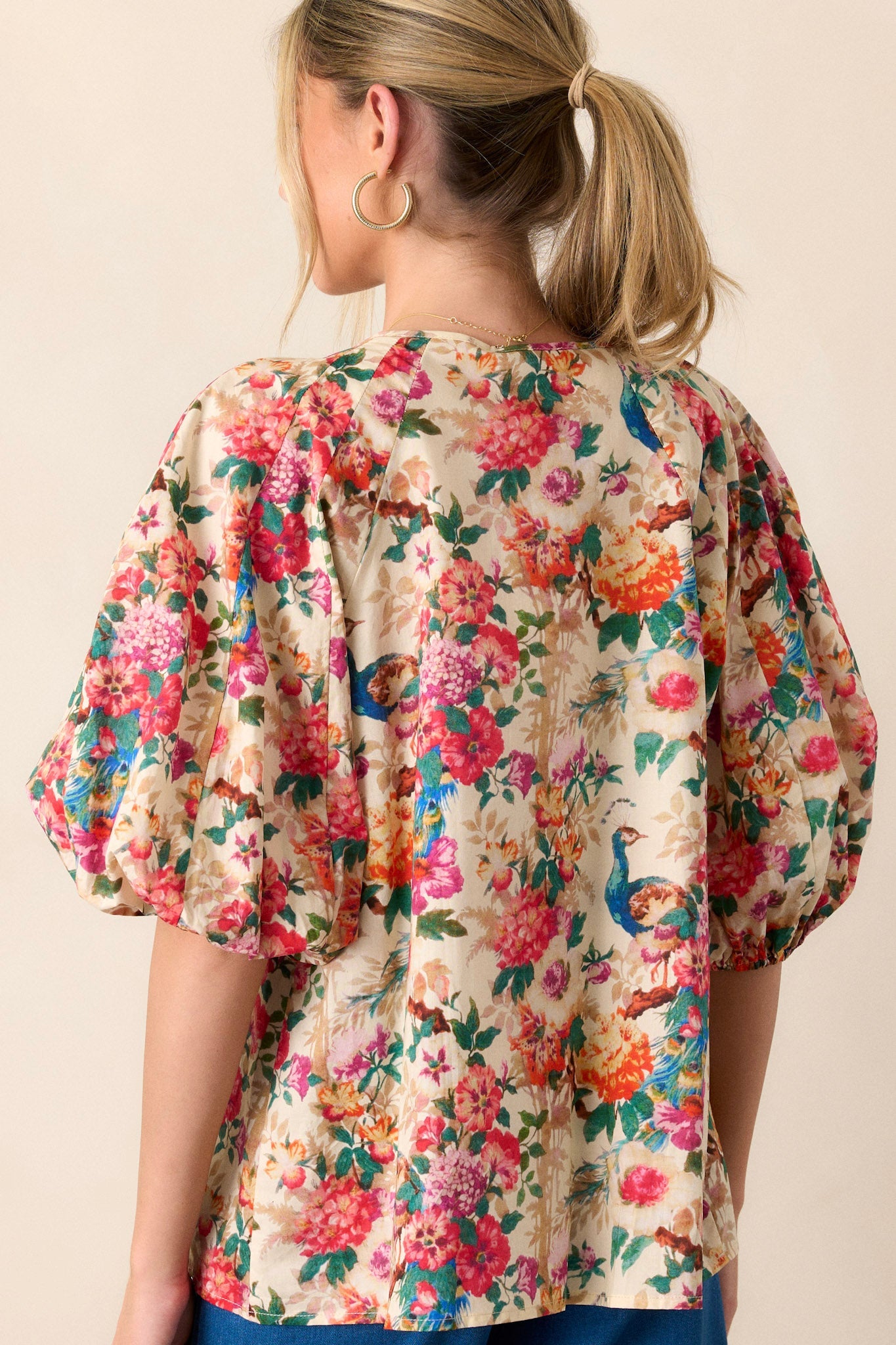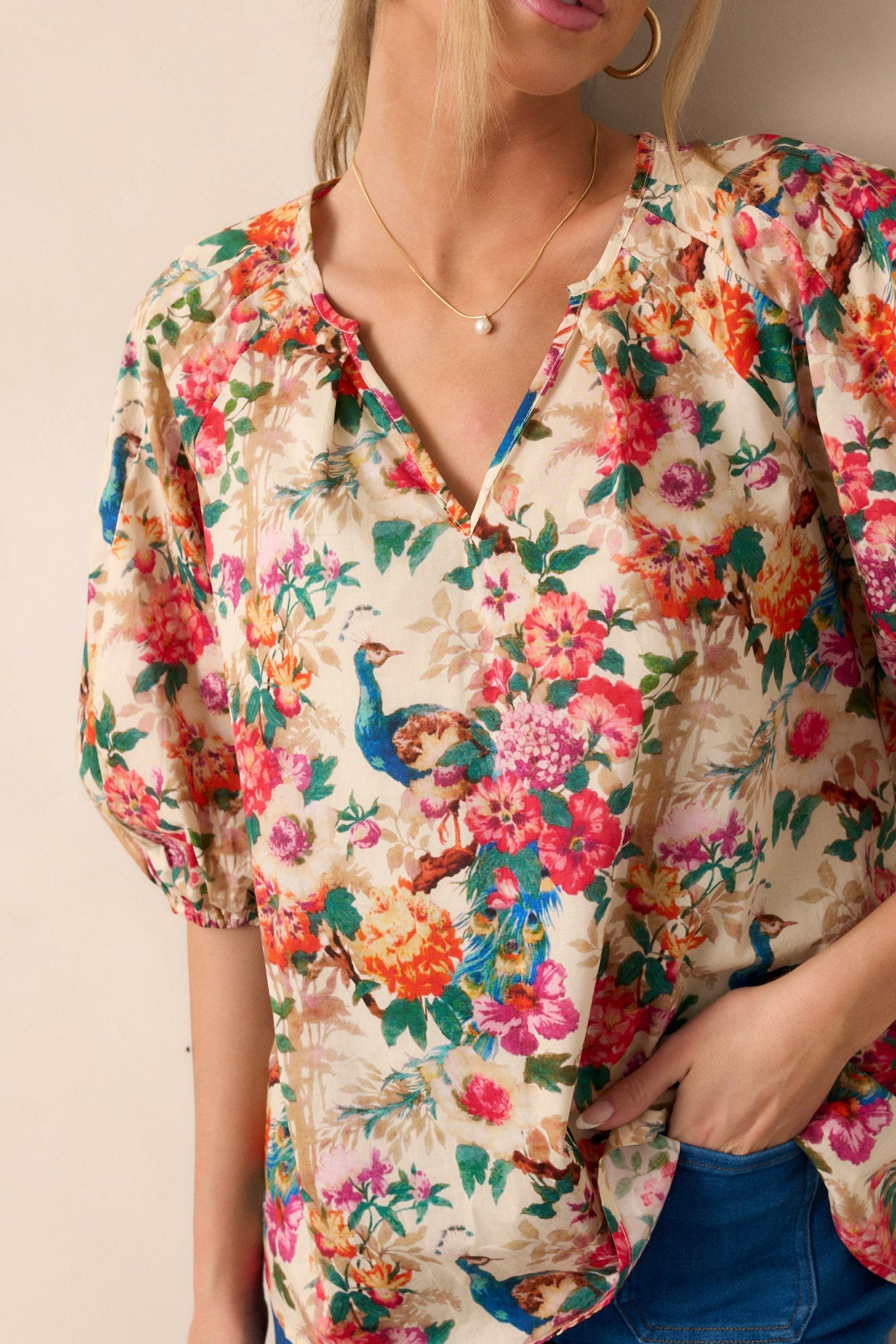Introducing the Elegant Garden 100% Cotton Ivory Puff Sleeve Top: a perfect blend of elegance and comfort. This ivory half sleeve blouse features a beautiful floral print, adding a touch of femininity to any outfit. Made with soft, breathable fabric, it's ideal for warmer weather. Upgrade your wardrobe with this versatile and stylish piece. This ivory floral blouse features a v-neckline, a relaxed fit, and elastic puff sleeves.