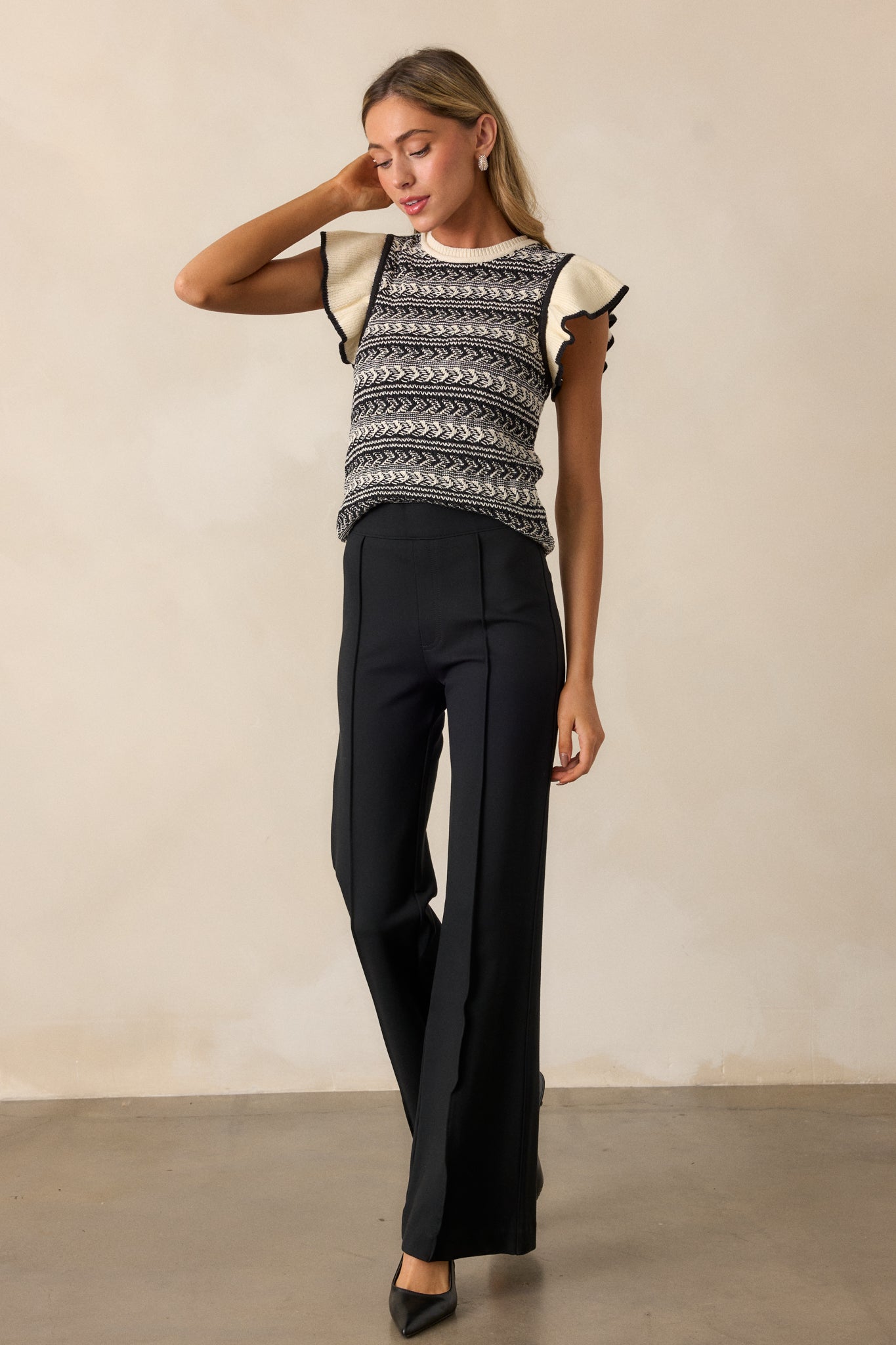 Get cozy and chic with our Elegant Vintage Black Chevron Sweater Top! This top features a stylish chevron pattern in classic black, perfect for adding a touch of sophistication to any outfit. The soft and warm fabric will keep you comfortable all day long. Don't sacrifice style for comfort with this must-have sweater top. This black sweater top features a cream rounded neck, a black and white horizontal chevron pattern, a ribbed hemline, and short flutter sleeves with a black trim.