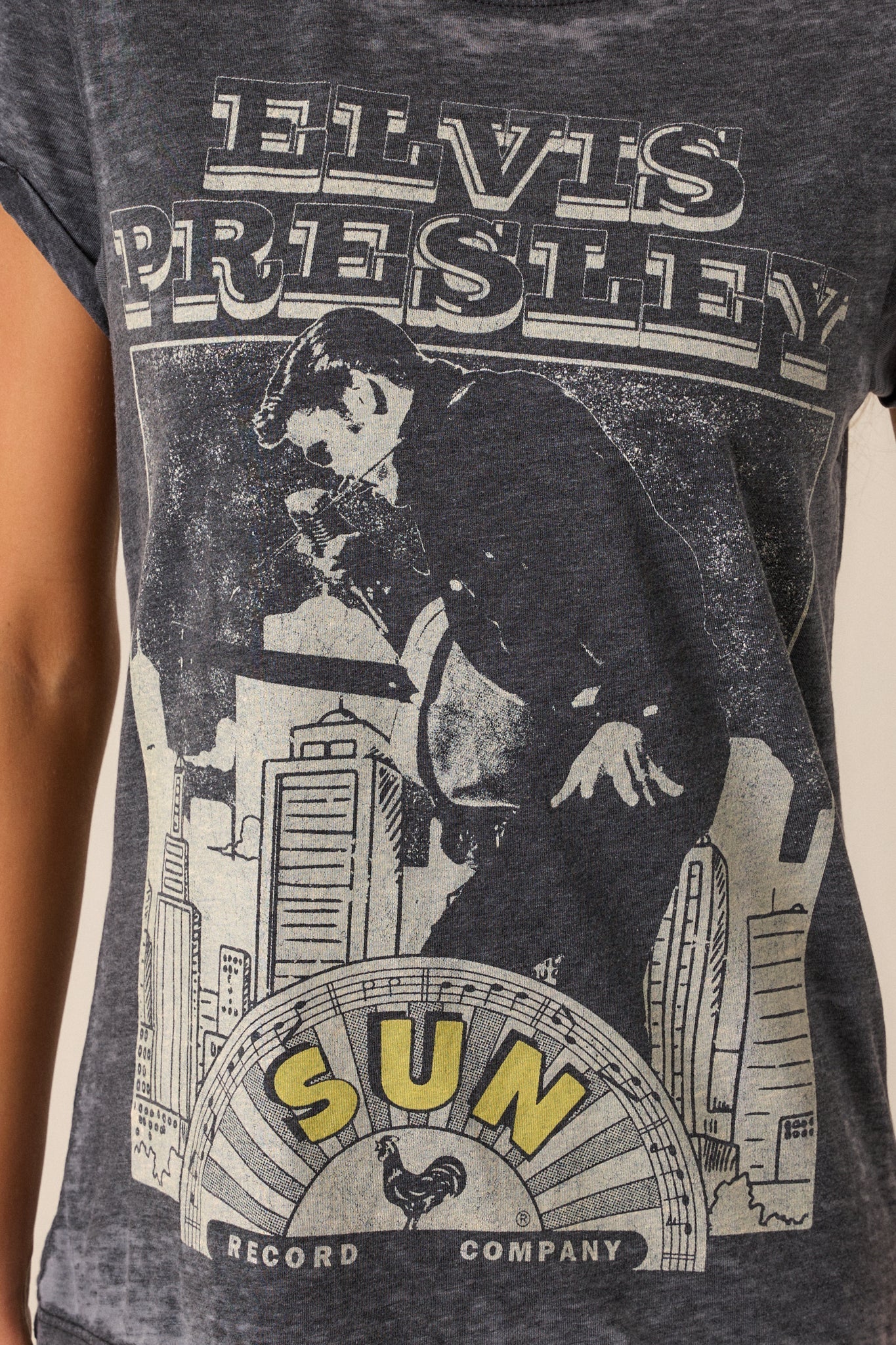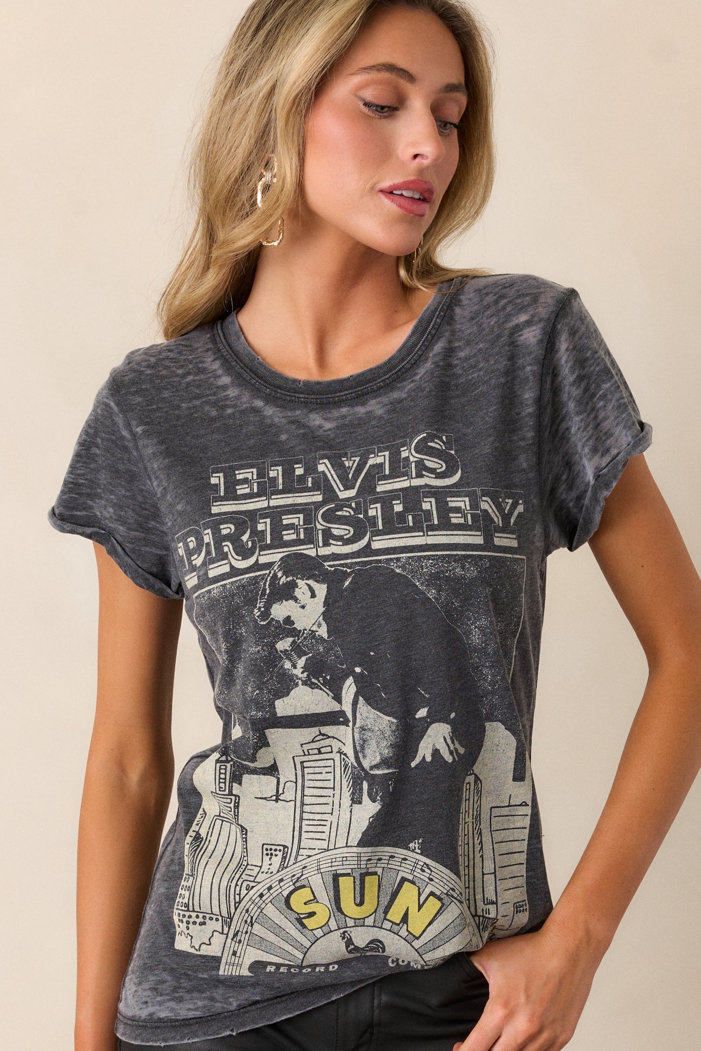 Get ready to rock and roll in style with our Elvis Presley Charcoal Acid Wash Tee. This stylish tee features a unique acid wash design and soft charcoal fabric for a vintage look and comfortable feel. Show off your love for the King of Rock and Roll with this must-have addition to your wardrobe. This charcoal tee features a crew neckline, Elvis Presley Design, acid wash detailing, distressed hem, and short cuffed sleeves.