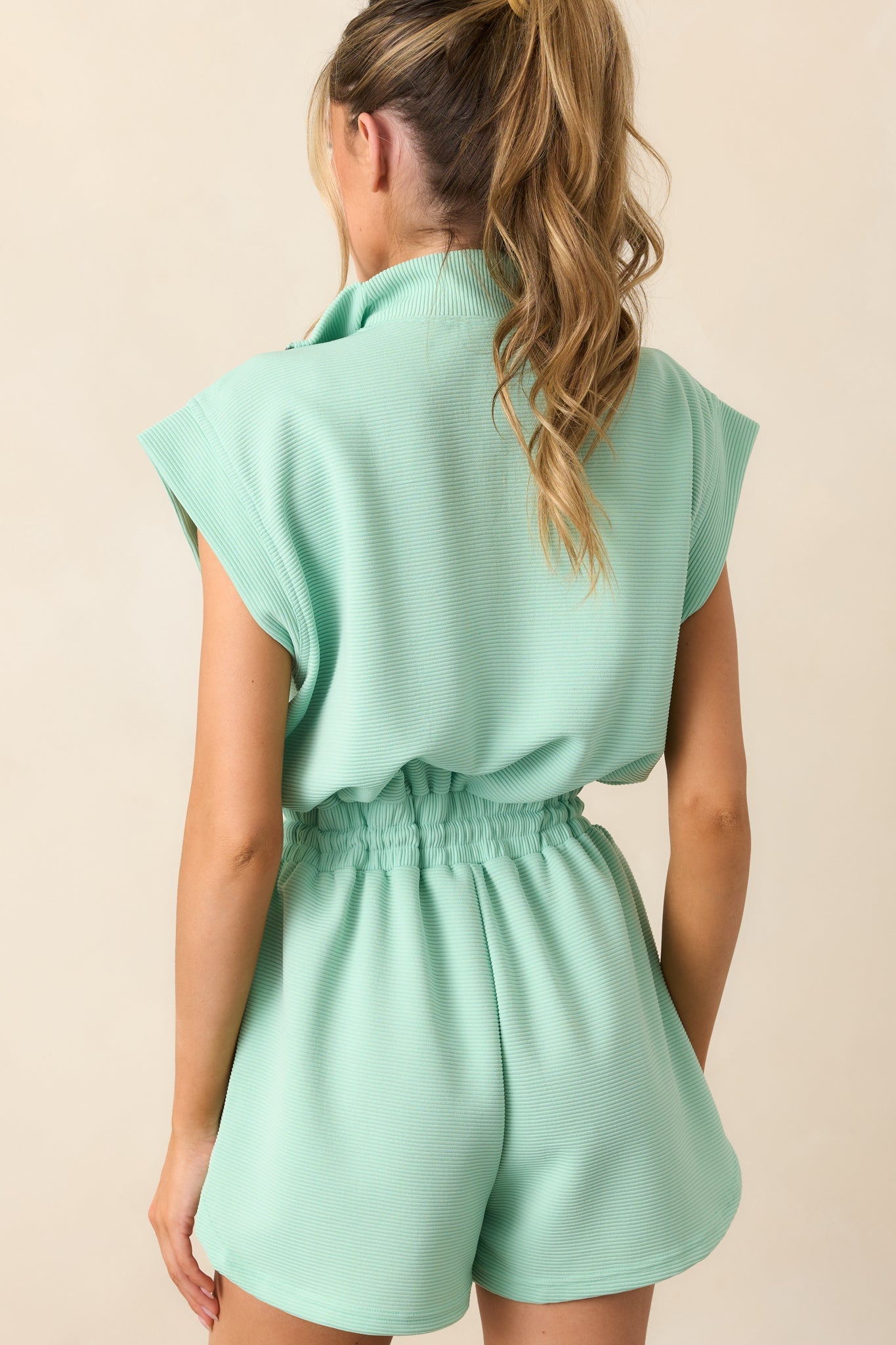 Look effortlessly stylish with our Embrace Today Mint Green Half Zip Romper - the perfect balance of casual and chic. Embrace comfort and fashion with this quirky romper, designed for the modern and playful individual. This mint romper features a folded collar neckline, a functional zip bodice, an elastic waistband, a self-tie drawstring, functional hip pockets, wide cap sleeves, and a ribbed texture.