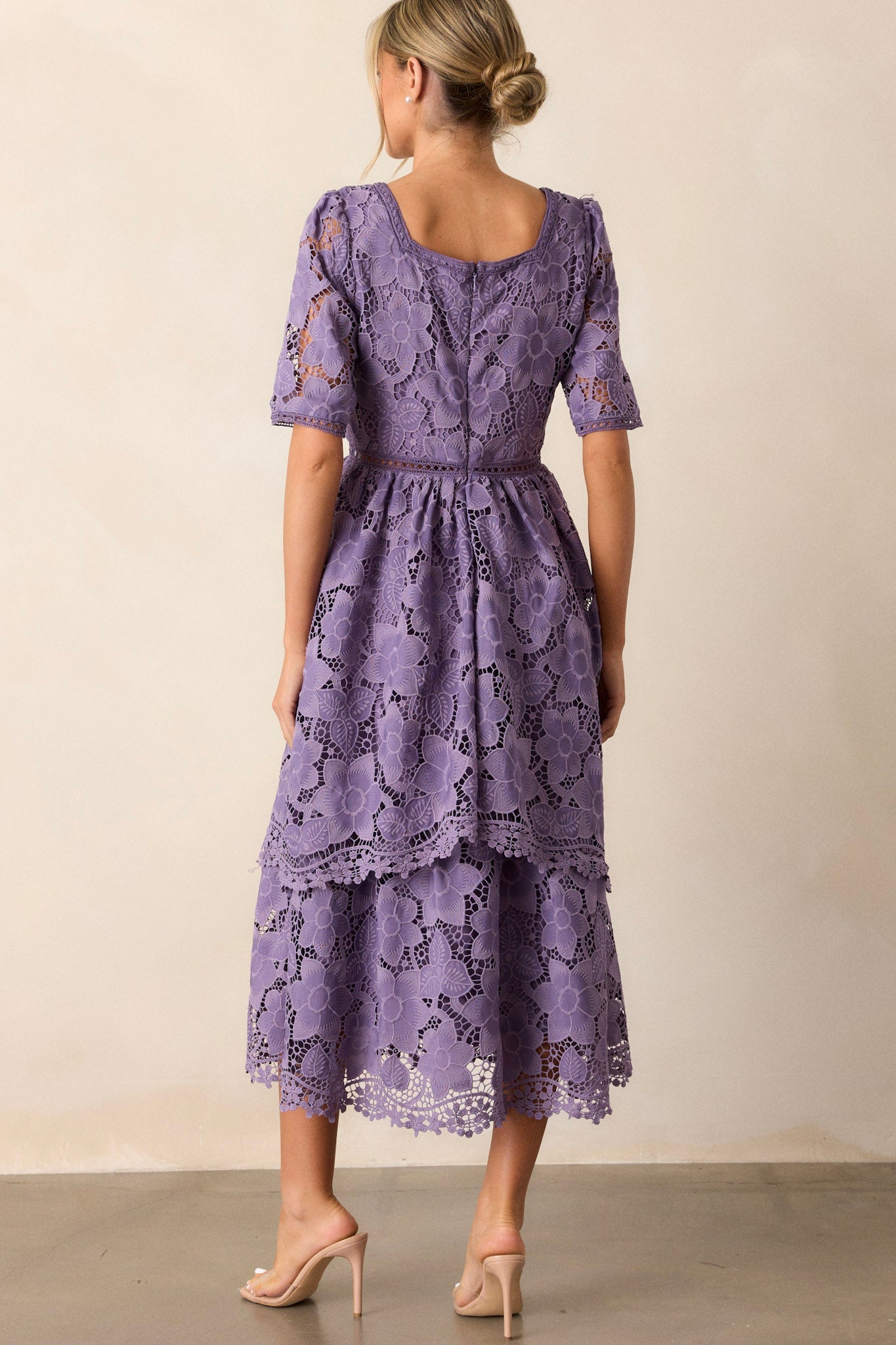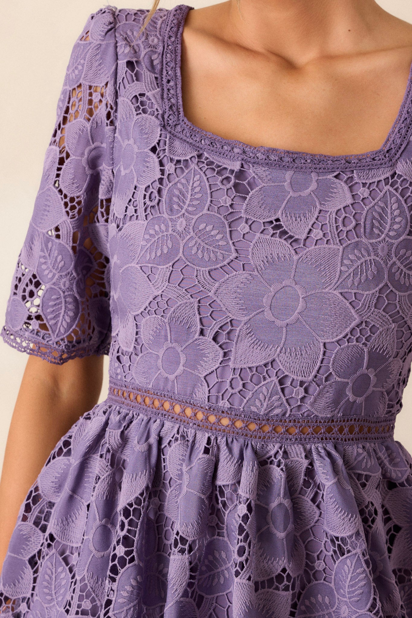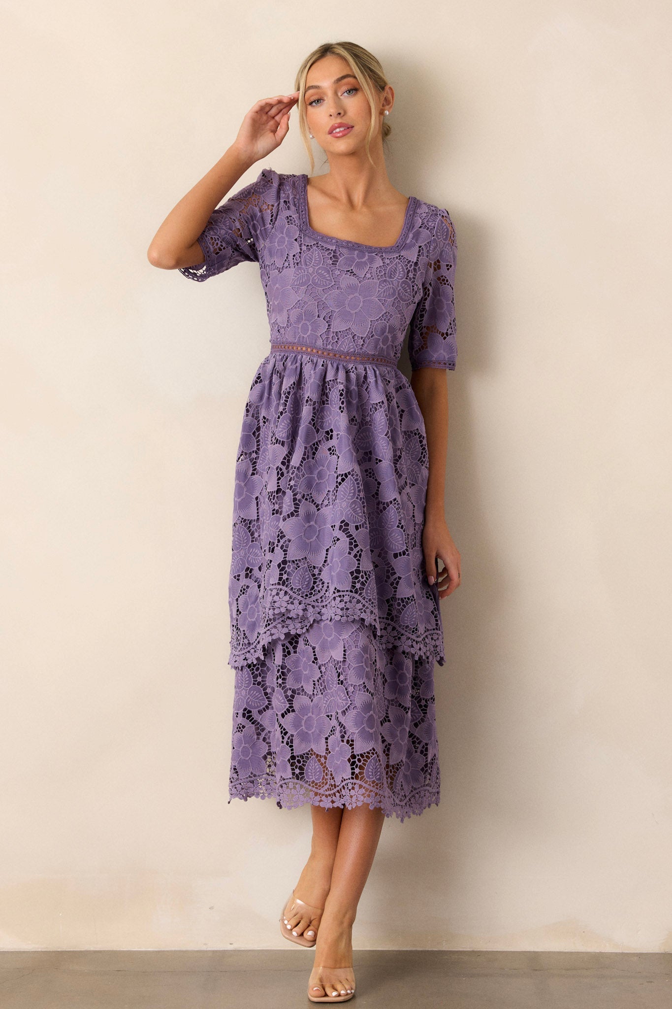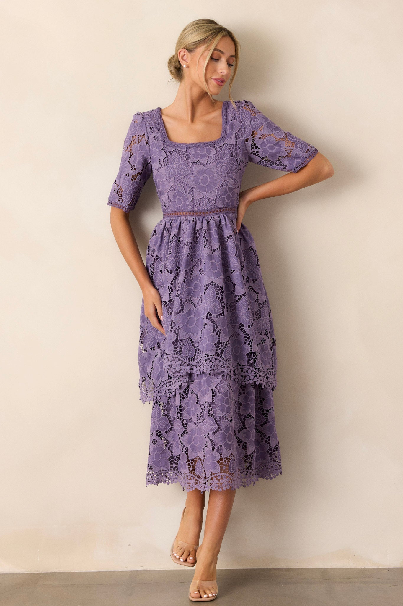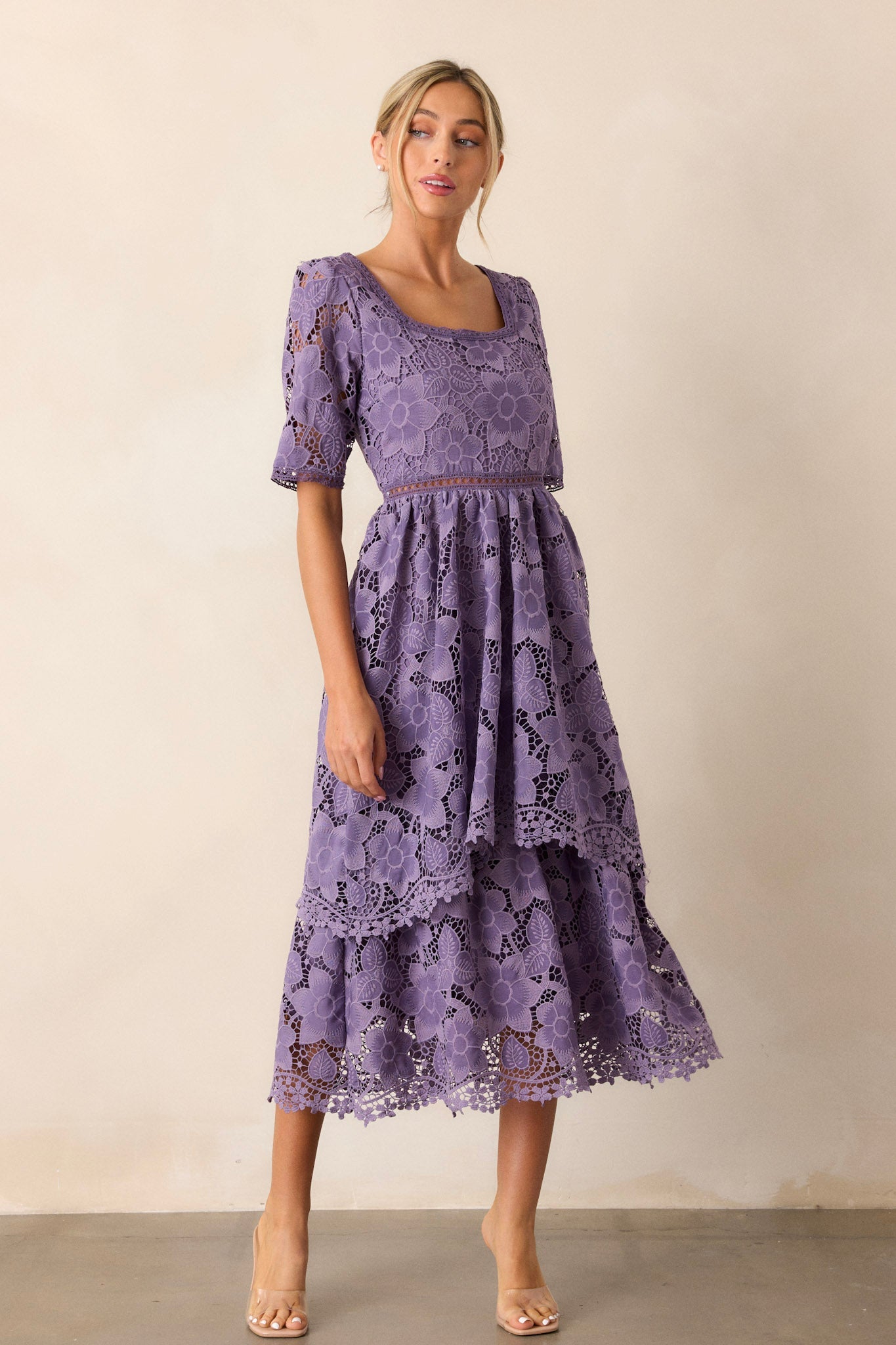 Bring a touch of romance to your wardrobe with our Eternal Romance Lilac Floral Embroidered Midi Dress. The delicate floral embroidery adds a feminine touch to this midi dress, making it perfect for any special occasion. Its lightweight and flowy fabric ensures both comfort and elegance, so you can dance the night away with confidence. Upgrade your style with this timeless and beautiful dress. This lilac dress features a square neckline, a lace floral design, a lace cutout waist design, a tiered skirt, a discrete back zipper and half sleeves.