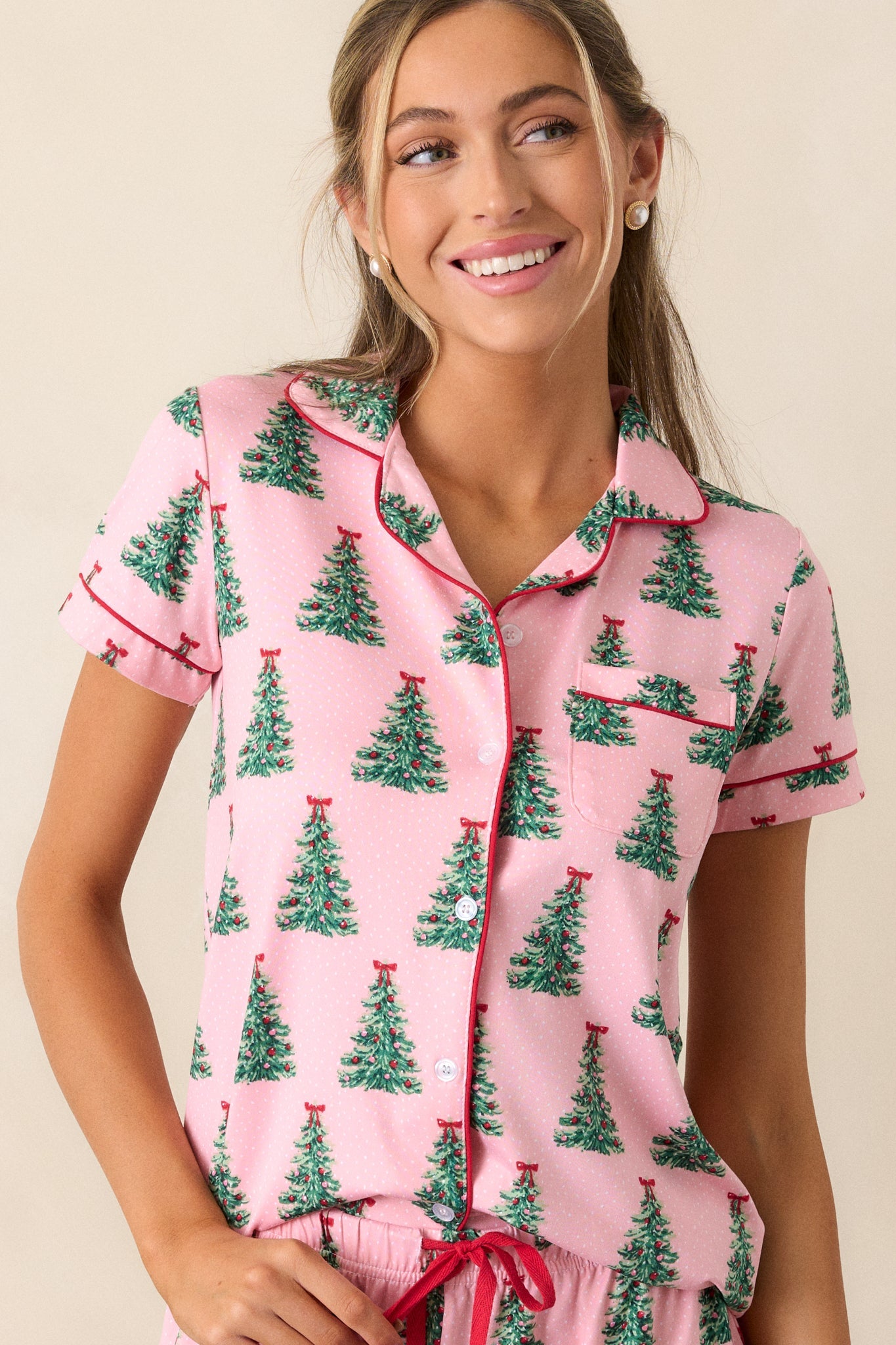 Cozy up in our Evergreen Memories Pink Pajama Top. Made with ultra-soft fabric, this top will keep you comfortable all night long. Its delicate pink color and tree pattern add a touch of holiday flare to your sleepwear collection. Get a good night's rest while looking effortlessly stylish. This pink pajama top features a collared neckline, red trimming, functional button front, a beautiful Christmas tree pattern, and short sleeves.