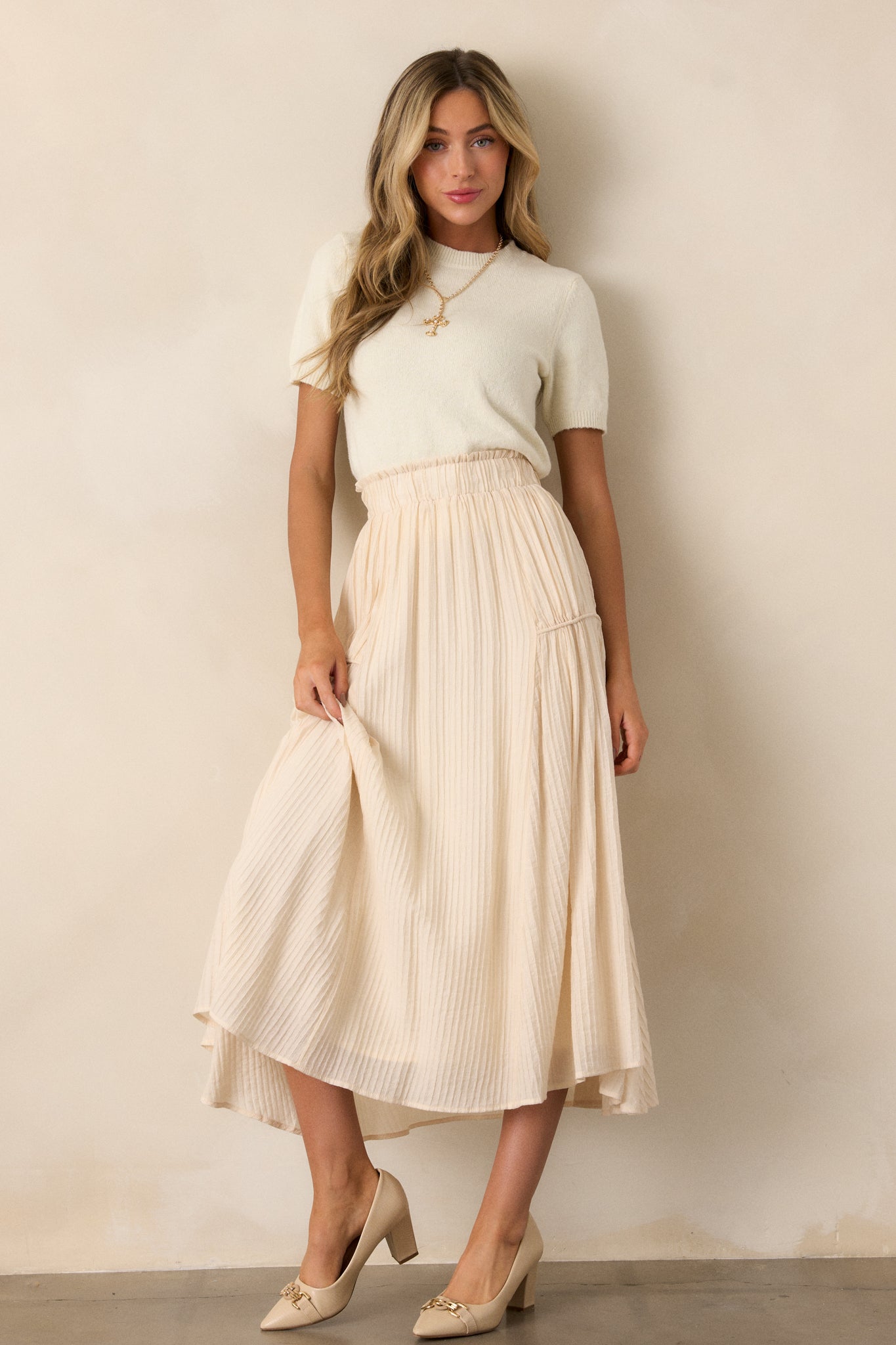 Stay comfortable and stylish during all your daily adventures with our Everyday Hustle Ivory Short Sleeve Knit Top. Made with a soft and durable material, this top will keep you looking and feeling your best all day long. Perfect for any casual occasion, this top is a must-have addition to your wardrobe. This ivory top features a high rounded neckline, a soft knit fabric, a wide ribbed hem, and short sleeves with a ribbed hem.