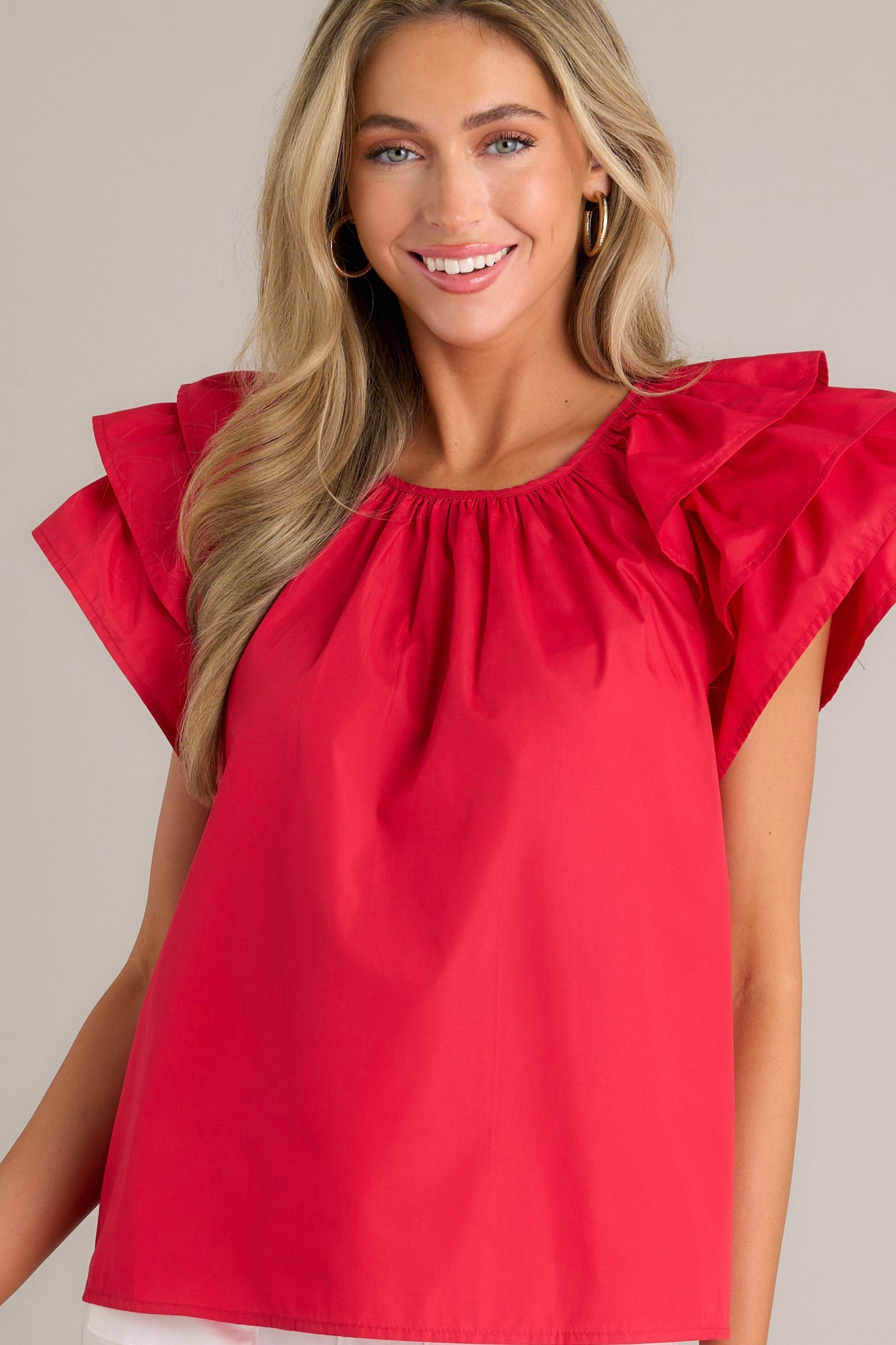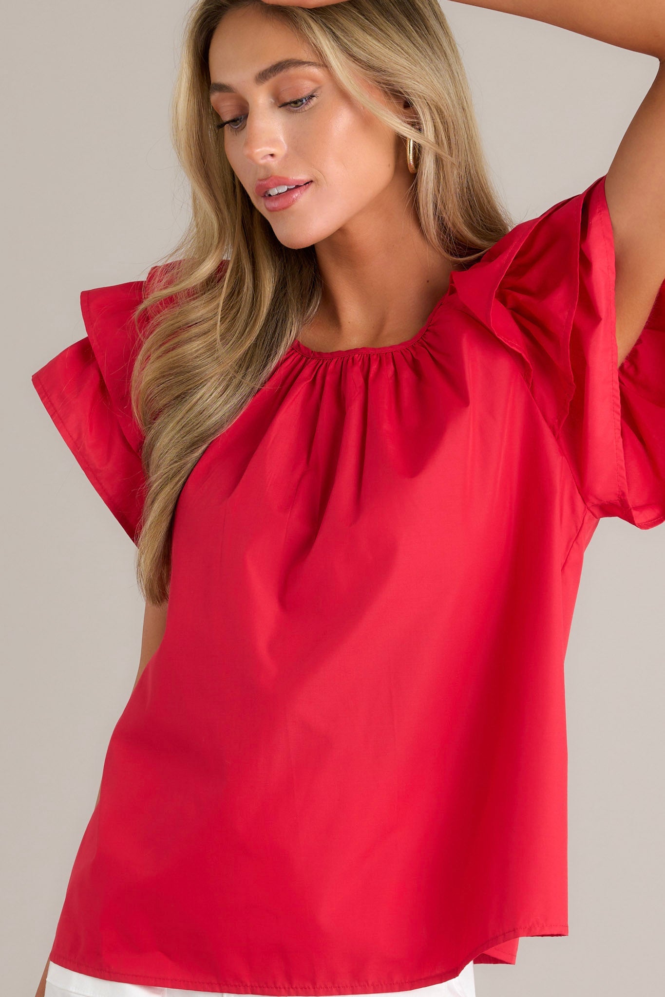 Introducing our Everyday Radiance Red Ruffle Sleeve Top - the perfect way to add some color to your wardrobe! Made with lightweight, breathable fabric, this top will keep you feeling cool and comfortable all day long. So go ahead and embrace your radiant self! This red top features a rounded neckline, gathering at the neckline, a keyhole with a button closure, and ruffled short sleeves.