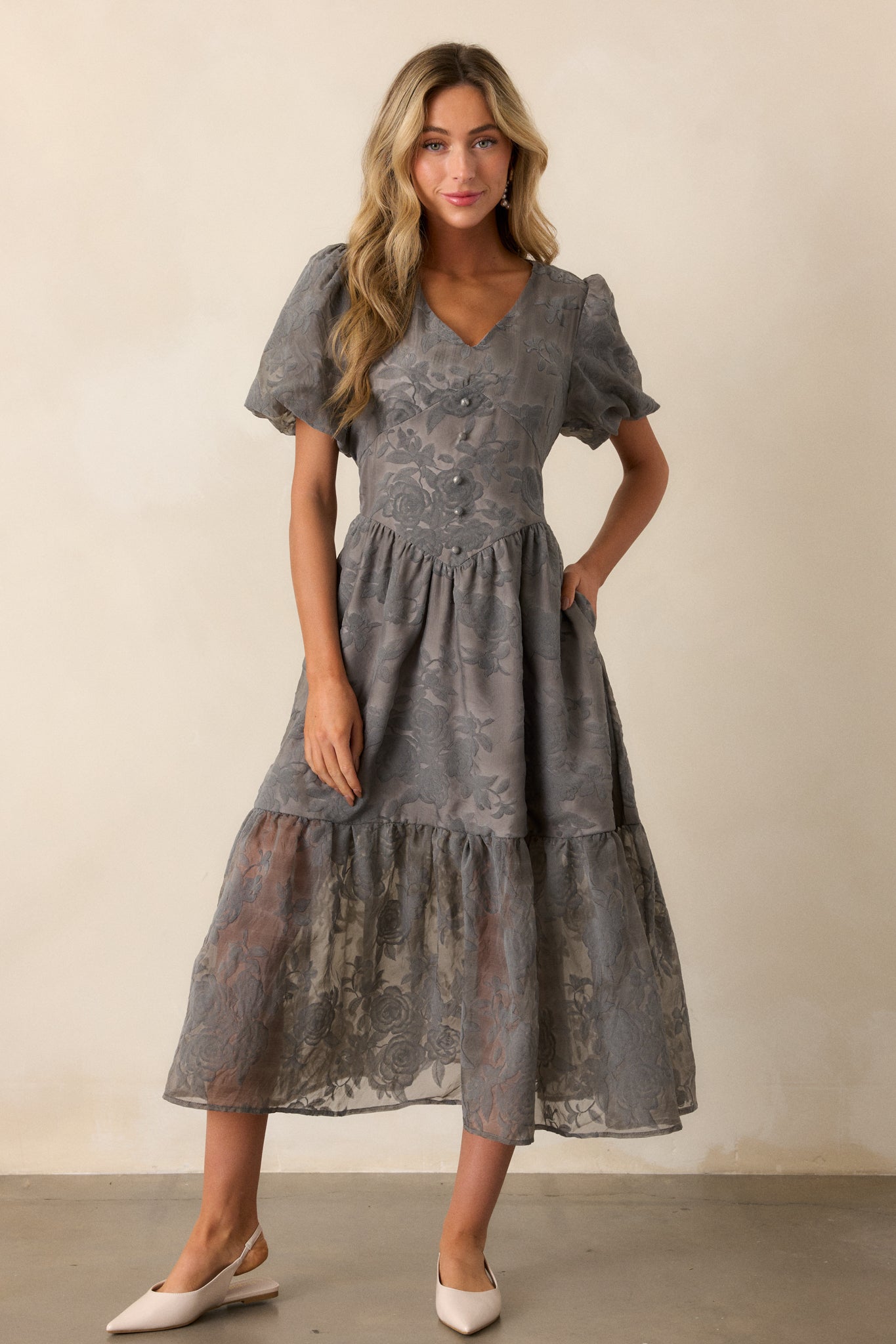 Adorn yourself in the enchanting beauty of our Faded Blossoms Grey Floral Puff Sleeve Midi Dress. Comfortable and stylish with puff sleeves and a flowy silhouette, this dress is perfect for any occasion. The subtle floral print adds a touch of elegance, making you feel confident and beautiful. This grey floral dress features a v-neckline, faux corset waist with button detailing, a flowy skirt with a slightly sheer bottom tier, and short puff sleeves.