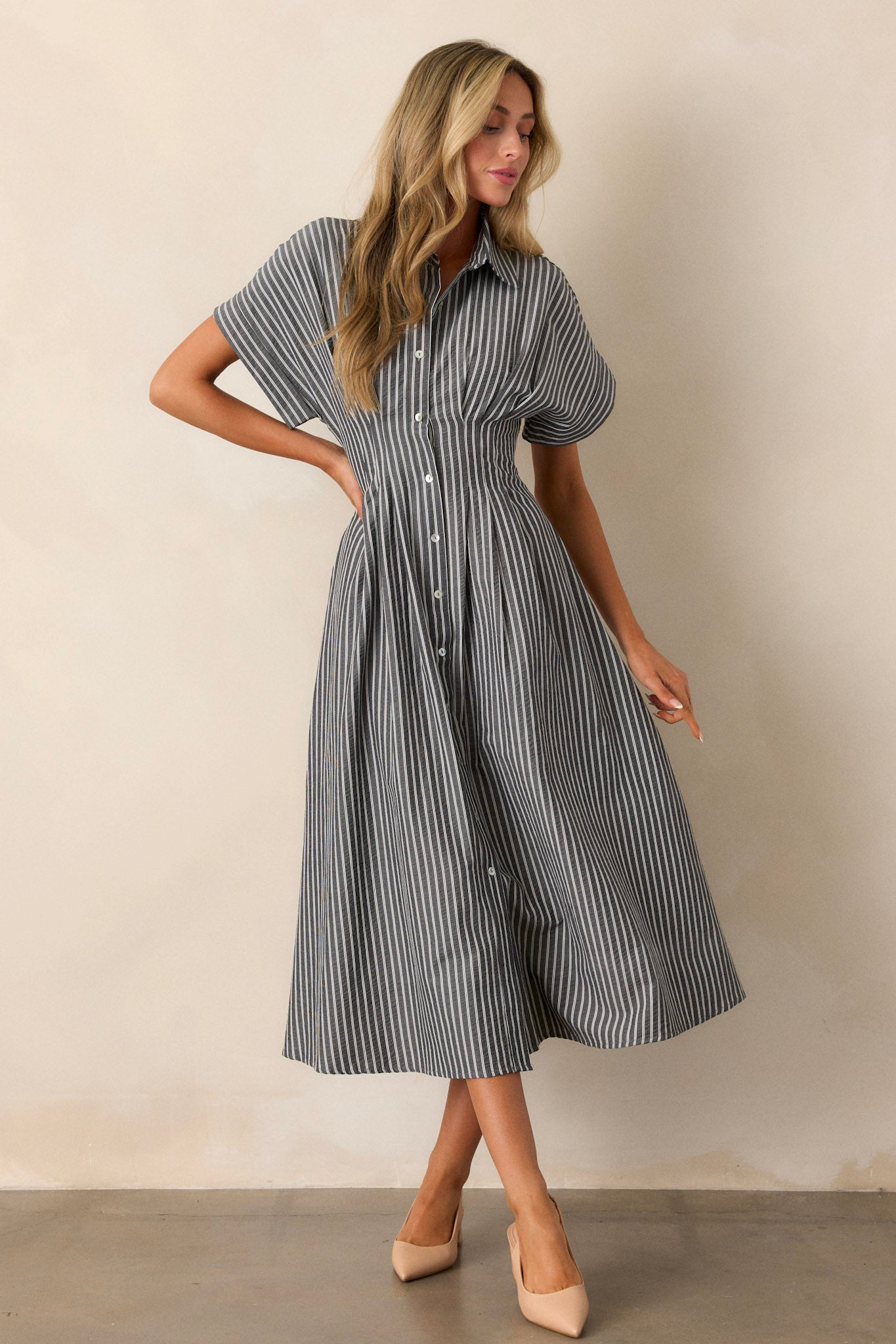 Elevate your style with our Falling Into Place Black Stripe Short Sleeve Midi Dress. This stunning dress features a unique black stripe design and a flattering midi length. Its lightweight fabric ensures comfort while its versatile design makes it perfect for any occasion. Get ready to turn heads in this must-have dress! This black dress features a stripe pattern, a functional button front, functional pockets, a collar neckline and short sleeves.