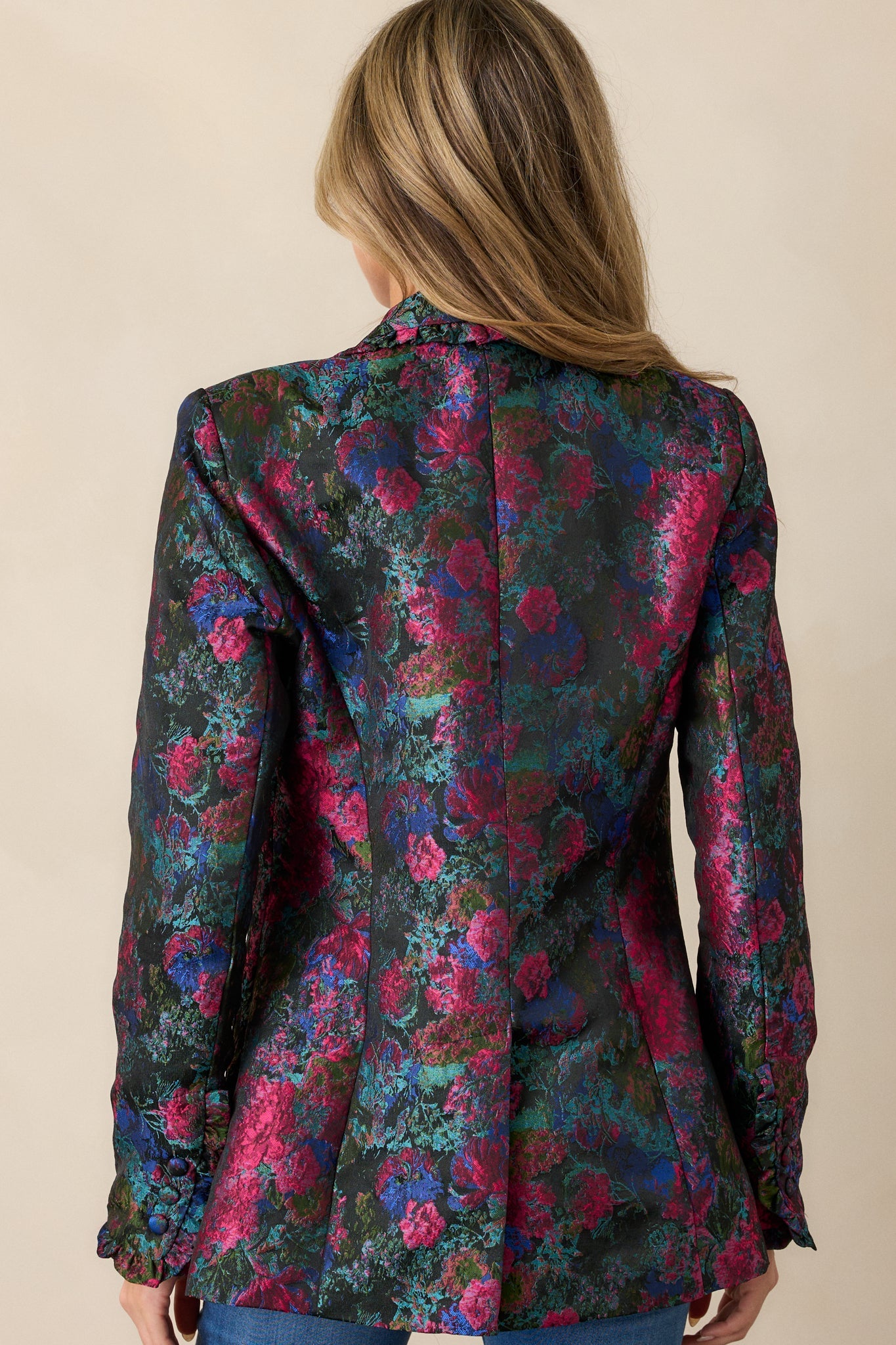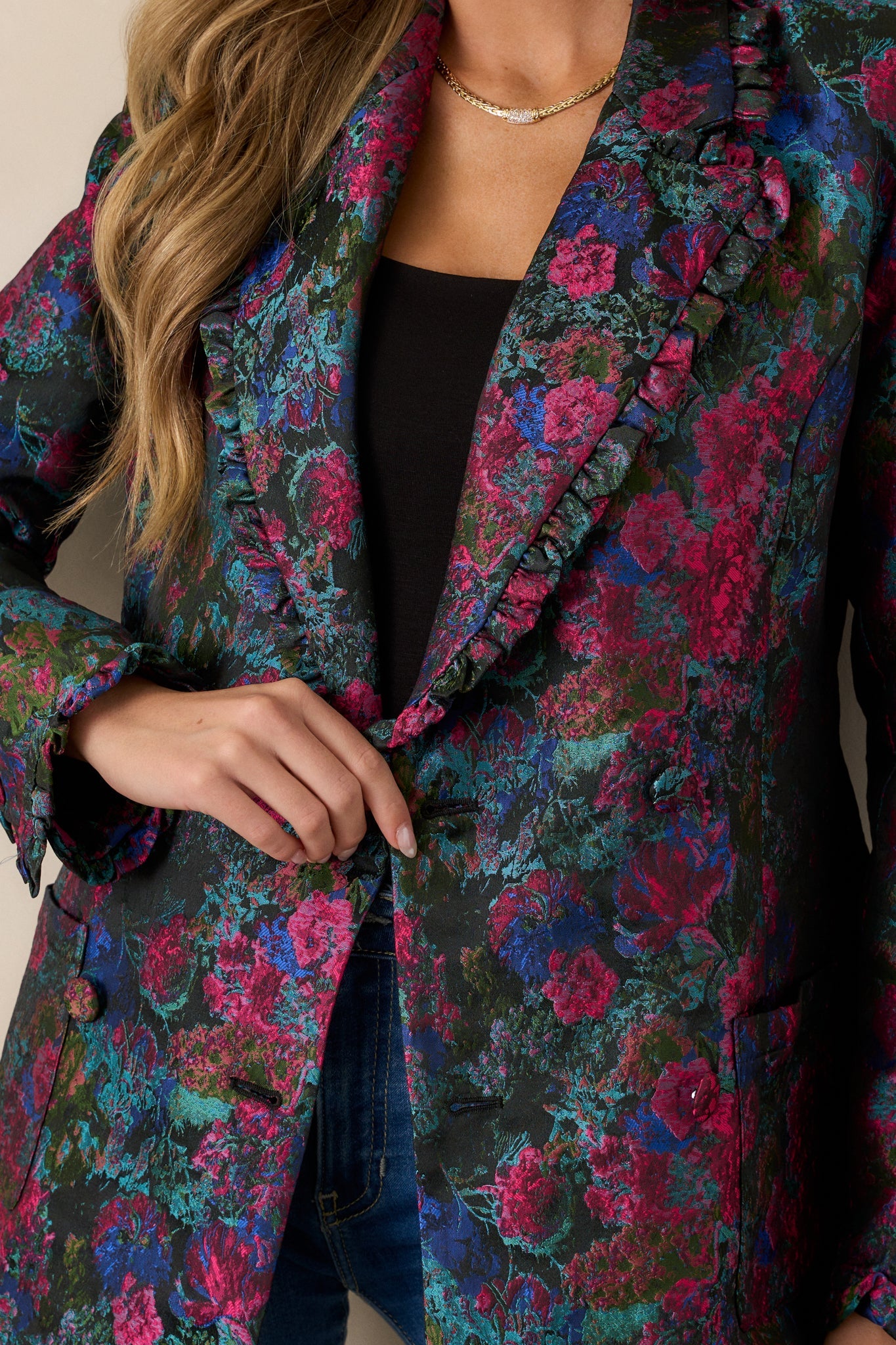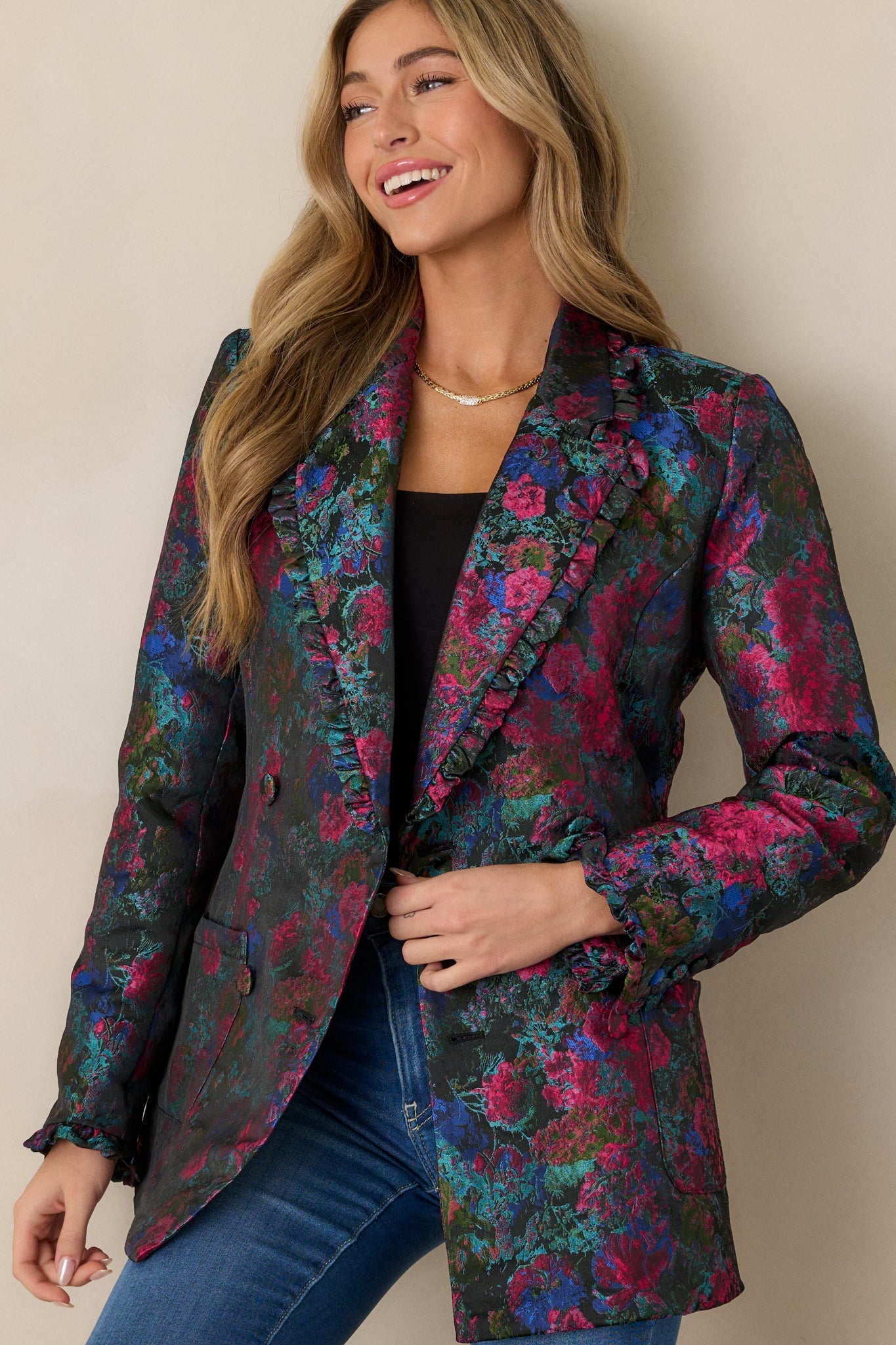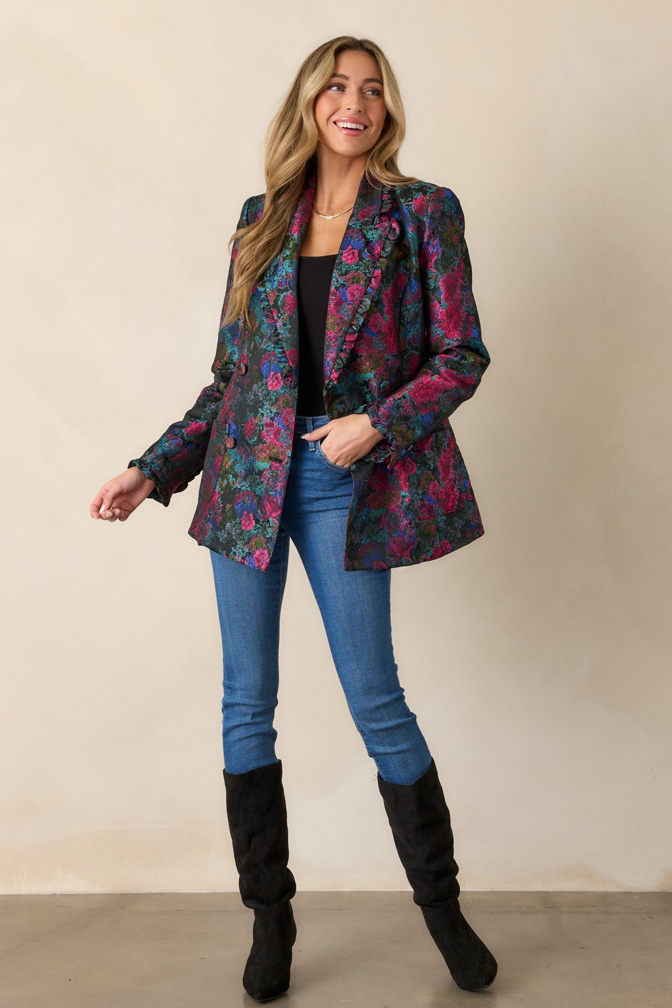Elevate your style with our Feel The Vibe Navy Floral Jacquard Blazer. Crafted from high-quality jacquard fabric, this blazer features a unique floral design that adds a touch of sophistication to any outfit. Perfect for a day at the office or a night out, you'll love the versatility and comfort of this blazer. This navy blazer features a lapel collared neckline, a jacquard fabric, colorful floral design, two functional hip pockets, long sleeves, and ruffle trim detailing throughout.