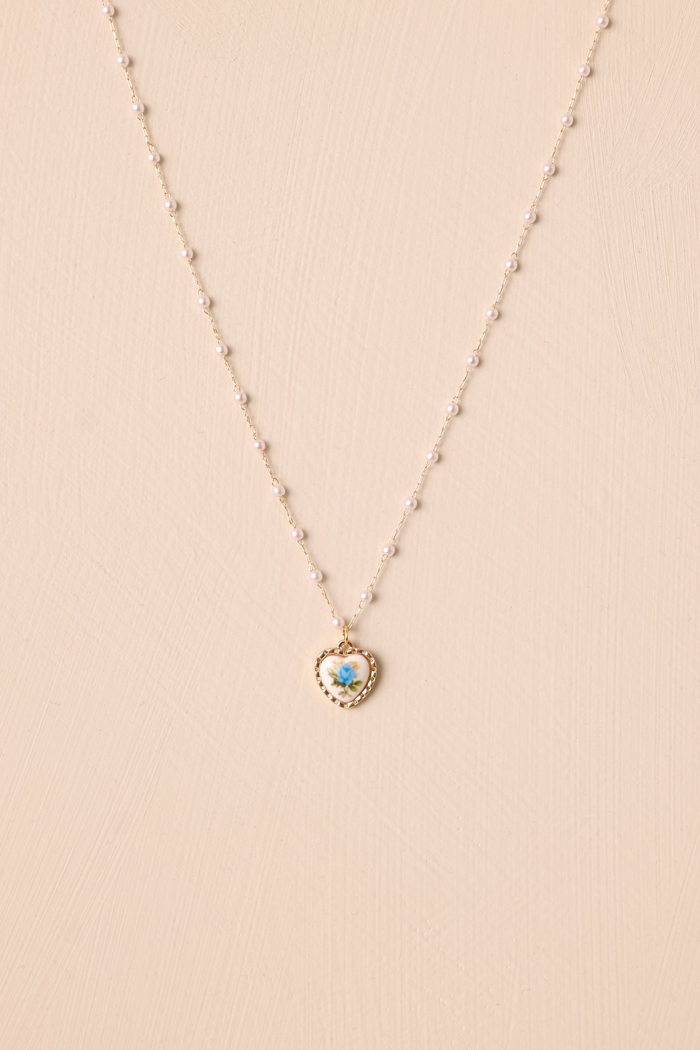 Bring a sense of charm and elegance to your look with the Feeling Connected Blue Floral Heart Faux Pearl Necklace. Perfect for meaningful moments or adding a touch of grace to your day, this piece complements any setting with its timeless and romantic feel. This necklace features small faux pearls evenly spaced along a gold chain, and an ivory heart pendant with a blue floral print, and a lobster claw closure.