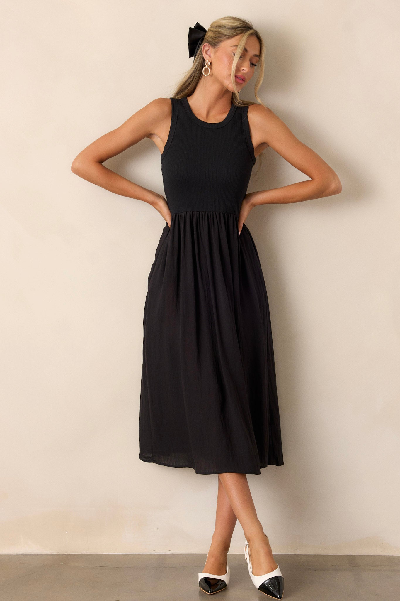 Unleash your boldness in the Find The Answer Black Ribbed Midi Dress! Featuring a sleek black design, this dress is ready to take on any challenge. Bring out your daring side and find the answer to your fashion needs with this must-have piece! This sleeveless black dress features a crew neckline, a stretchy ribbed bust, a cinched waist, and flowing mid-length skirt.