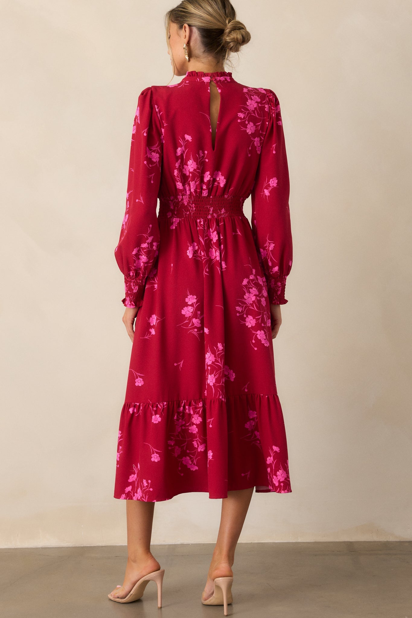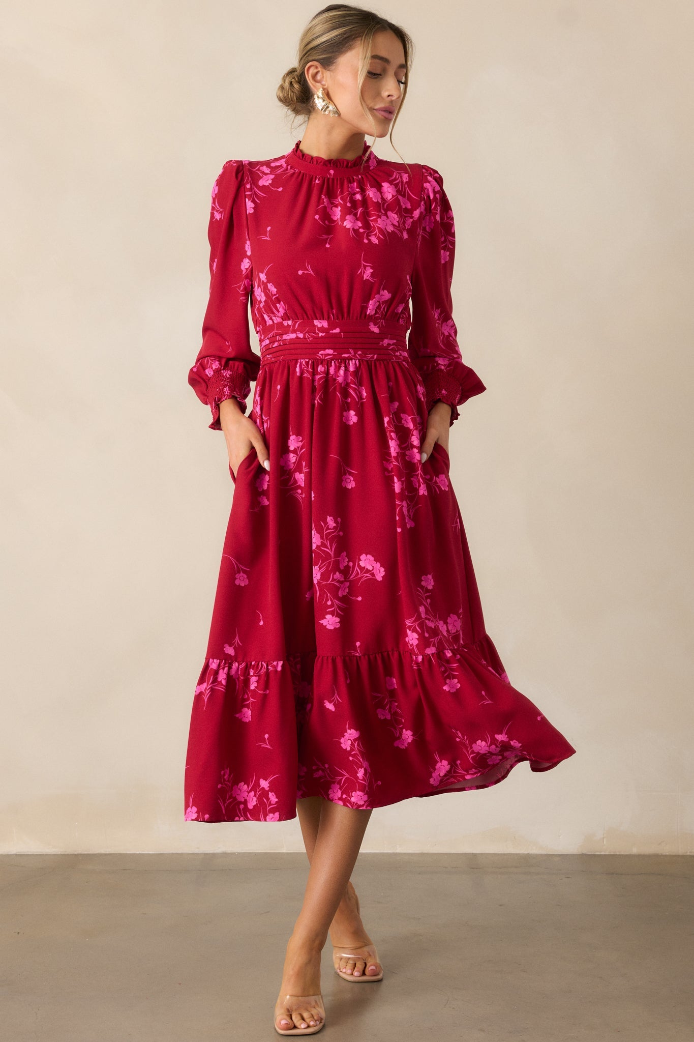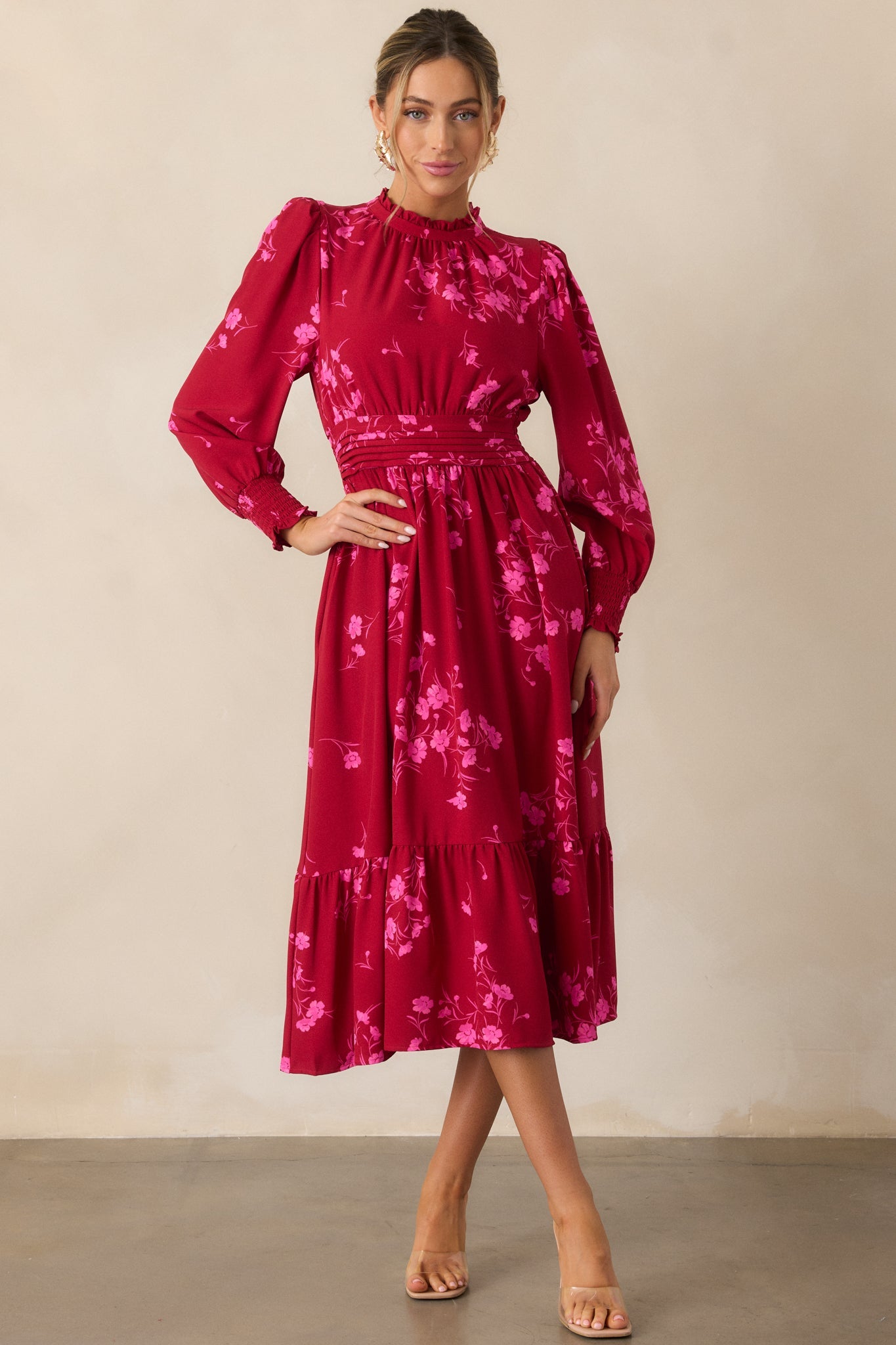 Introducing the Flower Shop Stop Cherry Pink Floral Long Sleeve Midi Dress - the perfect combination of elegance and comfort. Made with soft, lightweight fabric, this dress is perfect for any occasion. The vibrant cherry color and midi length will make you stand out in any crowd. Elevate your wardrobe with this must-have dress! This pink & red dress features a a high ruffle detail neckline, pleated waistband, midi length, floral pattern, tiered bottom detailing, discrete back zipper and long sleeves with smocked wrist detailing.