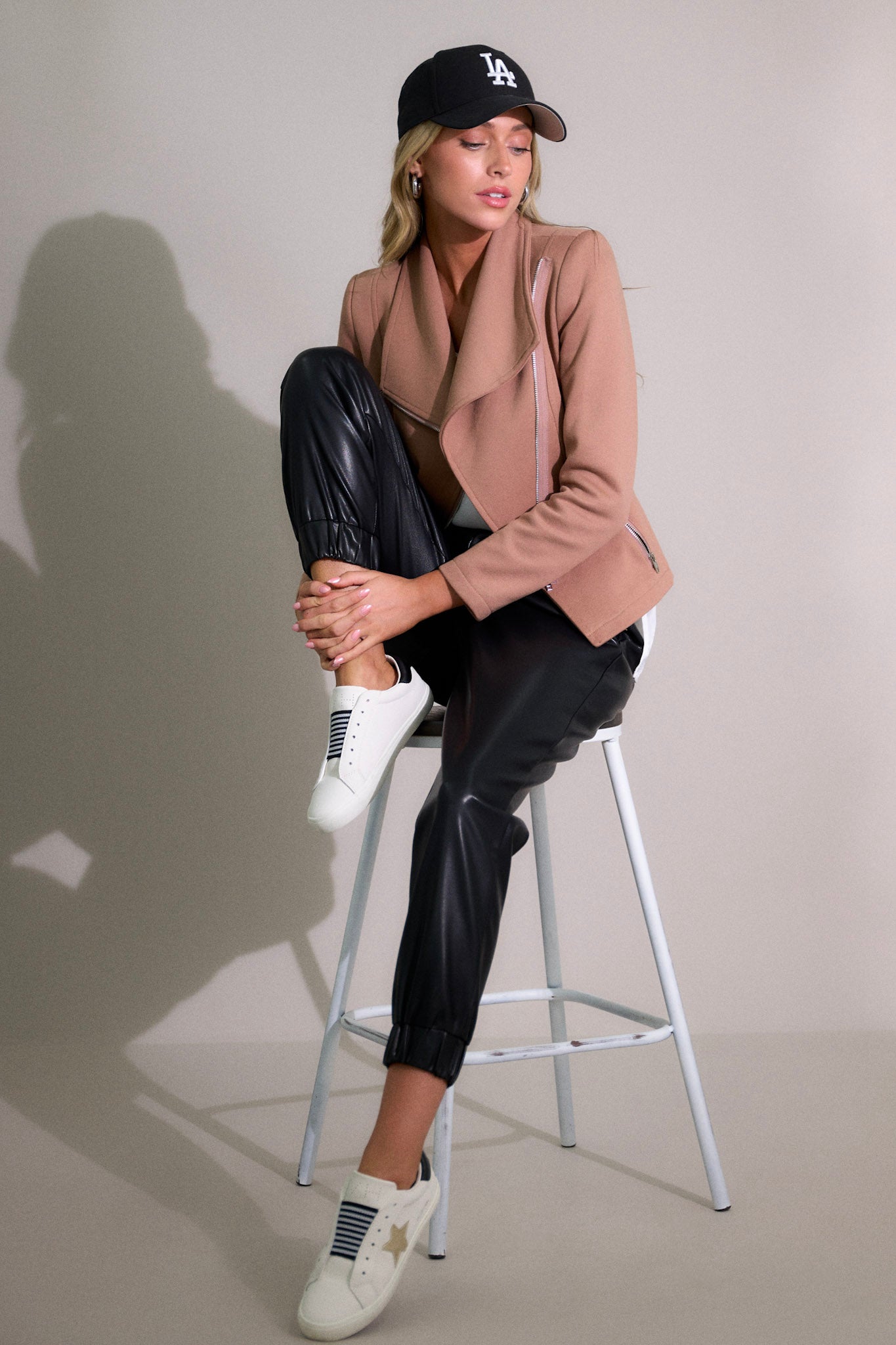Get ready to rev up your style with the For All Mocha Moto Jacket! This canvas style jacket features shoulder pads for a sophisticated look, while keeping you comfortable. Upgrade your wardrobe with this must-have piece. This mocha tan moto jacket features shoulder pads, a cross zipper closure, functional waist pockets with zipper closure, lapels, and silver hardware.