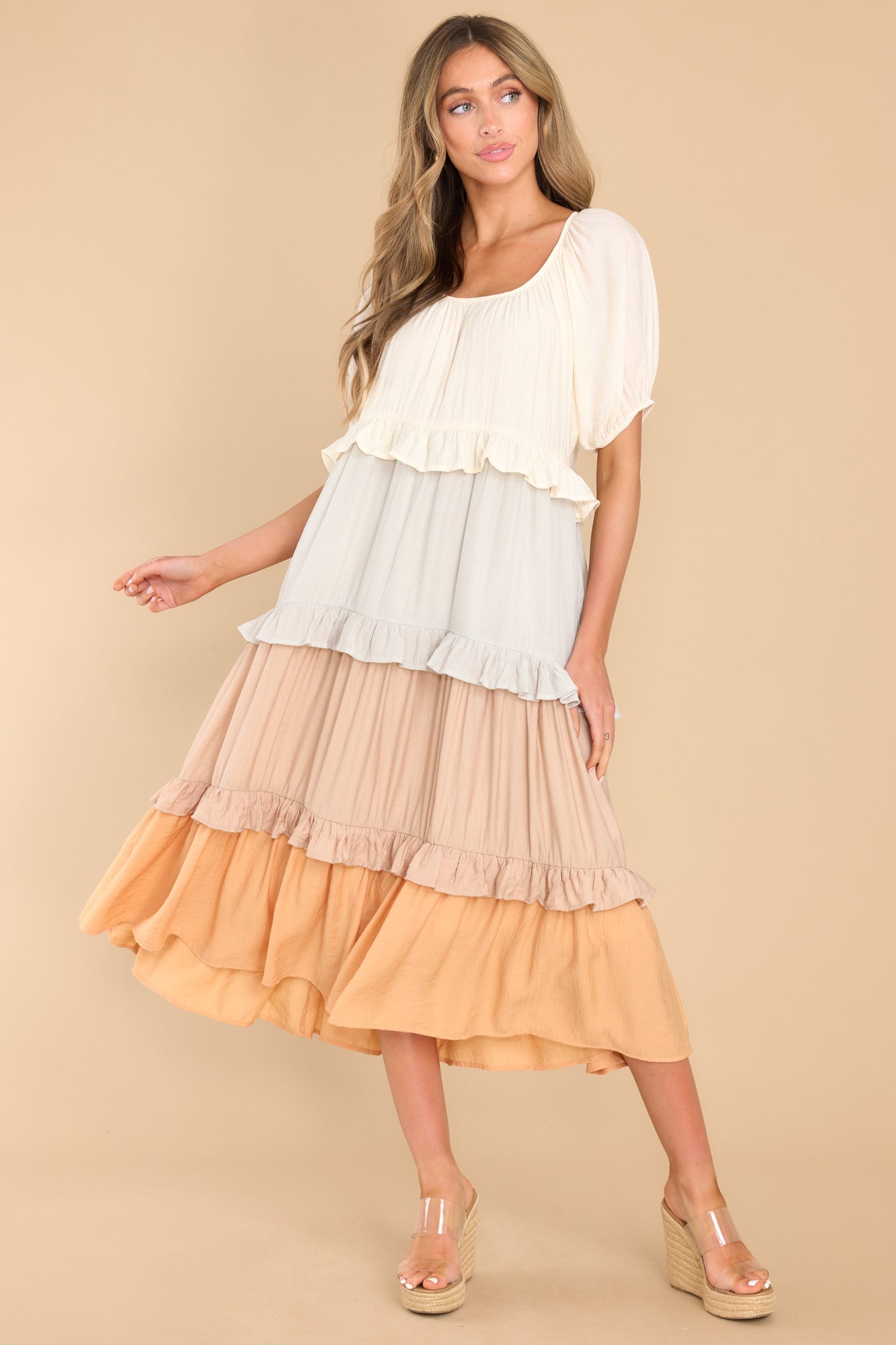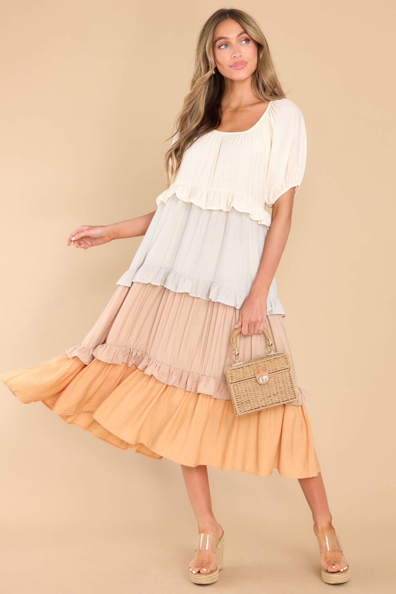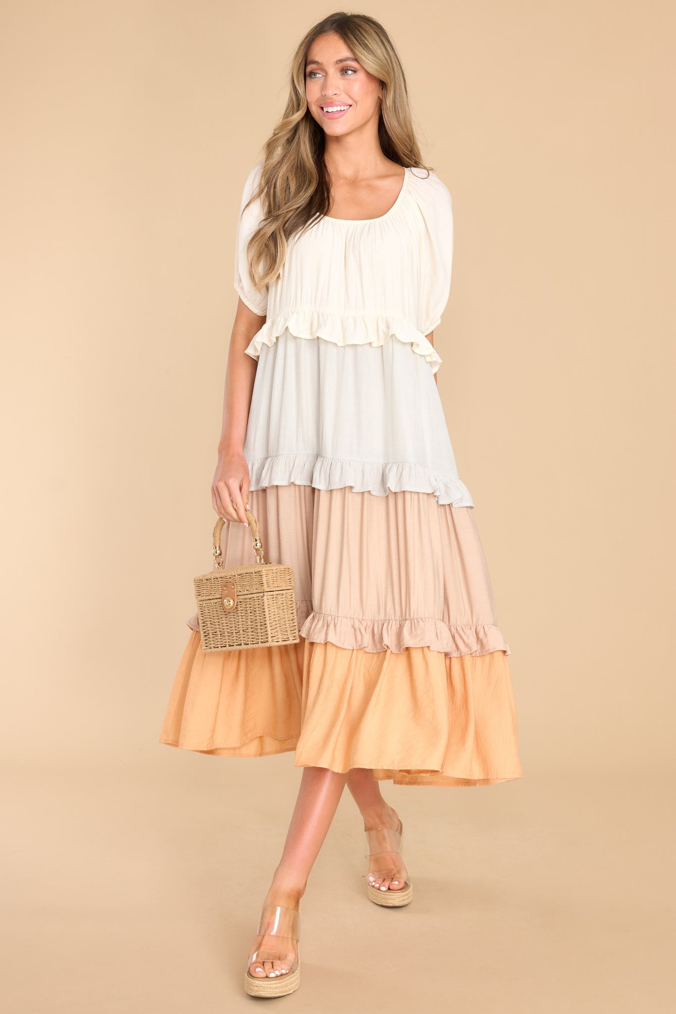 For My Sake, please tell me what you think of this natural multi midi dress? Do I look as happy as I feel? This is truly a delightful little sundress that is sure to cheer up the gloomiest day! This dress features a scoop neckline, puff sleeves with elastic around the cuffs, waist pockets, and a flowy tiered skirt. Model is wearing a small. • 100% Polyester • Hand Wash Cold • Lined 100% Polyester • Imported.