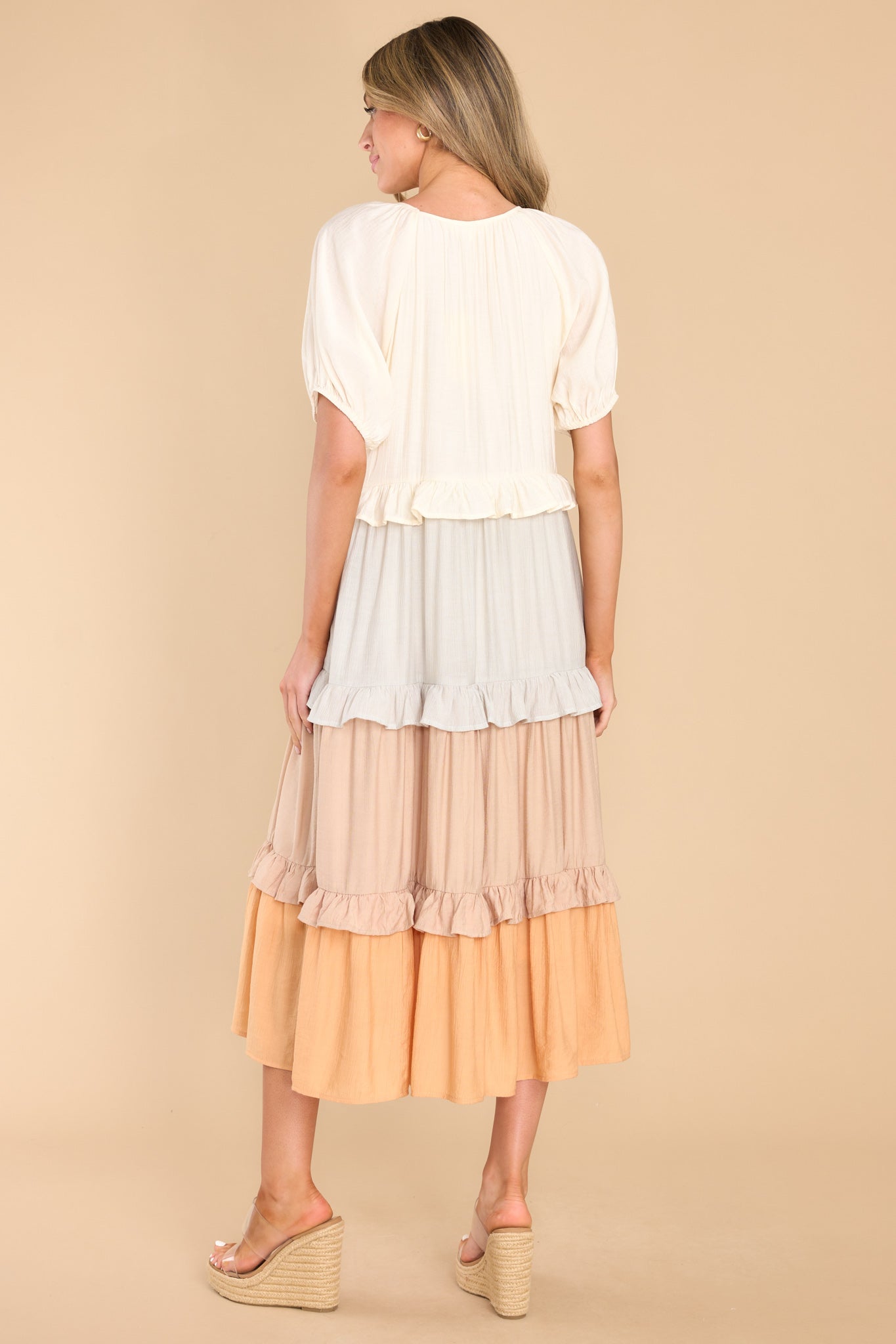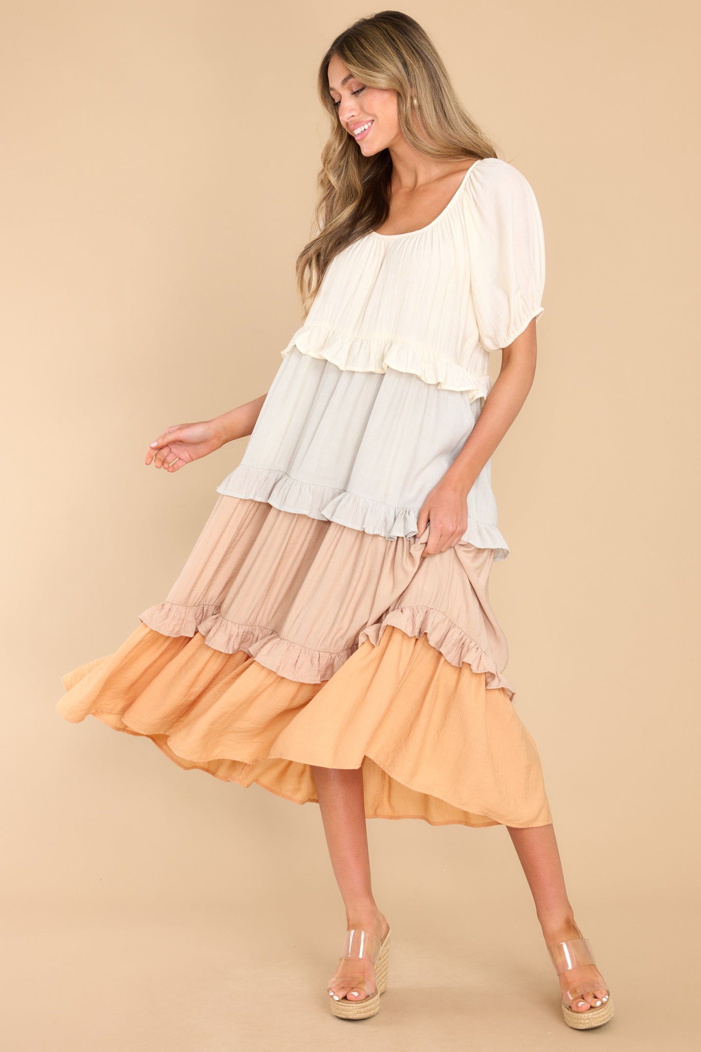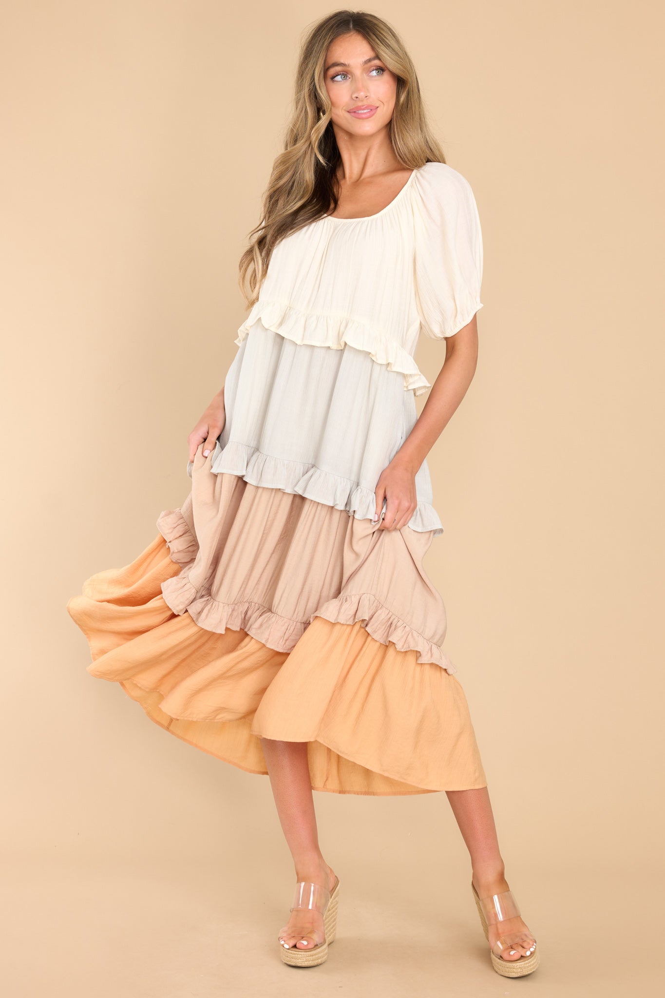 For My Sake, please tell me what you think of this natural multi midi dress? Do I look as happy as I feel? This is truly a delightful little sundress that is sure to cheer up the gloomiest day! This dress features a scoop neckline, puff sleeves with elastic around the cuffs, waist pockets, and a flowy tiered skirt. Model is wearing a small. • 100% Polyester • Hand Wash Cold • Lined 100% Polyester • Imported.