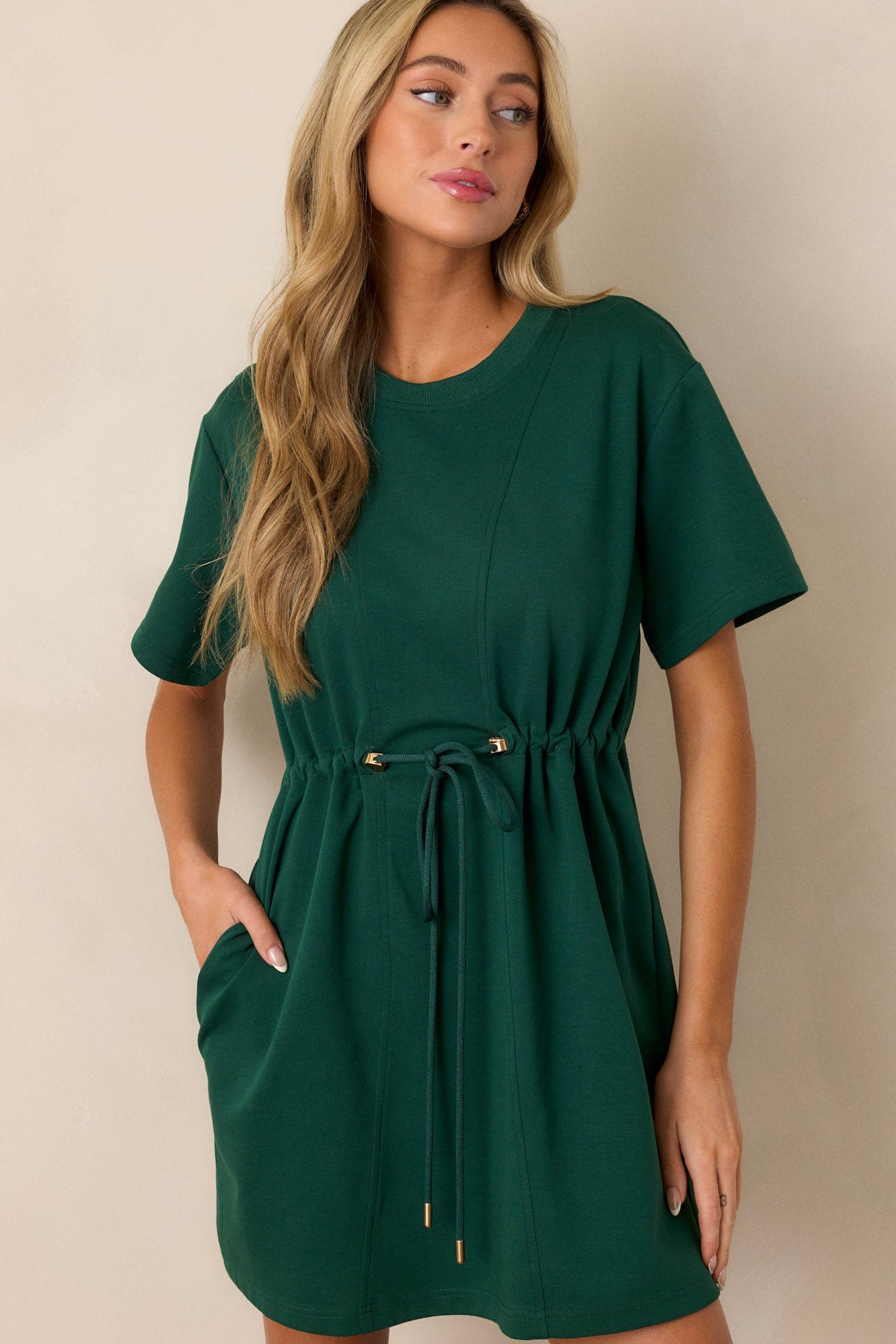 Effortlessly stylish and comfortable, our For The Day Hunter Green Short Sleeve Mini T-Shirt Dress is the perfect choice for any casual occasion. With its mini length and short sleeves, this dress is designed for easy wear and a flattering fit. Elevate your everyday look and make an impression with this versatile and trendy piece! This hunter green mini dress features a crew neckline, a drawstring waist with gold heart shaped charms on the strings, gold aglets, functional hip pockets, and short sleeves.