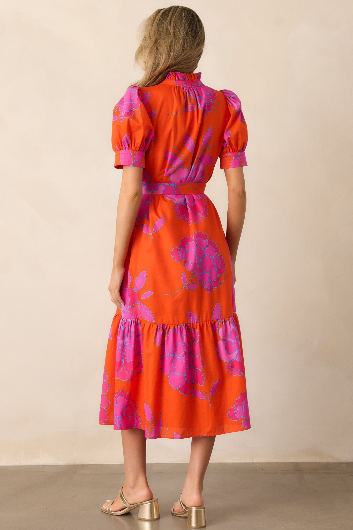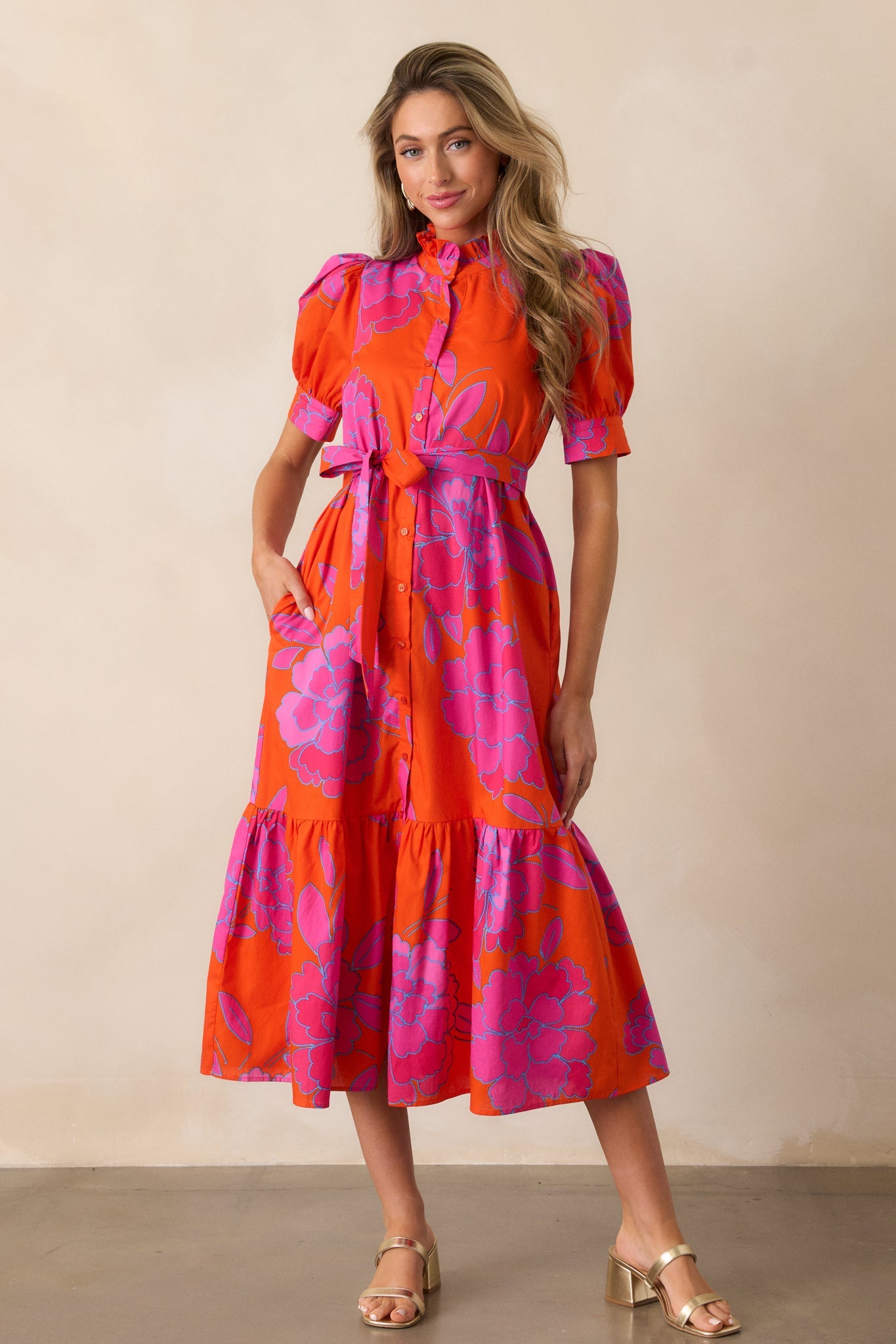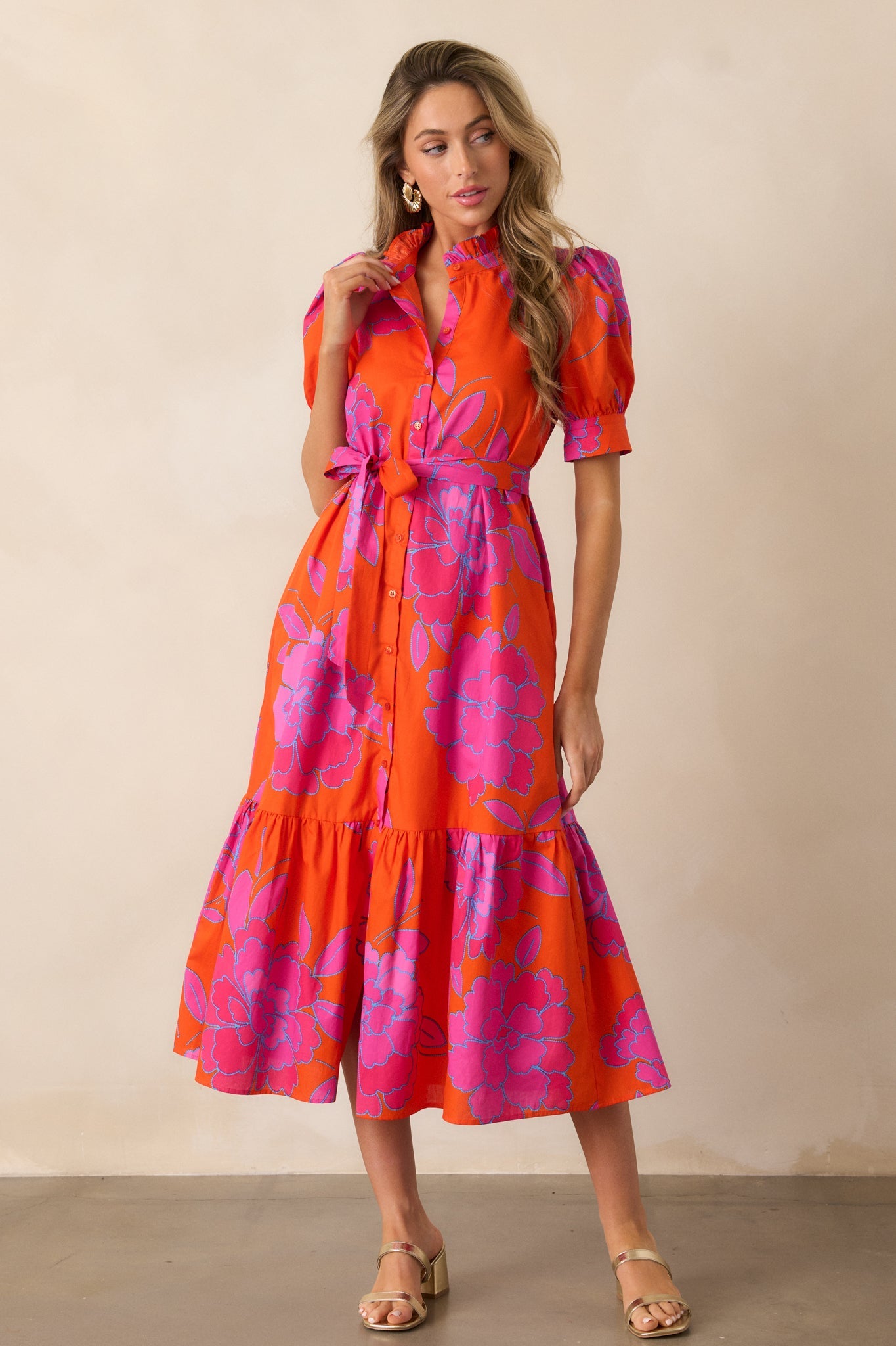 Fly free and feel the breeze in our 100% cotton orange floral midi dress. With a button front and midi length, this dress is perfect for any occasion. Stay cool and comfortable while standing out in this vibrant and versatile piece. Effortlessly stylish, it's the ultimate must-have for any fashion-forward individual. This orange midi dress features a high ruffle collar, button front design, beautiful floral pattern, functional pockets, tiered skirt, removable self tie belt, and puff sleeves with stitch detailing.
