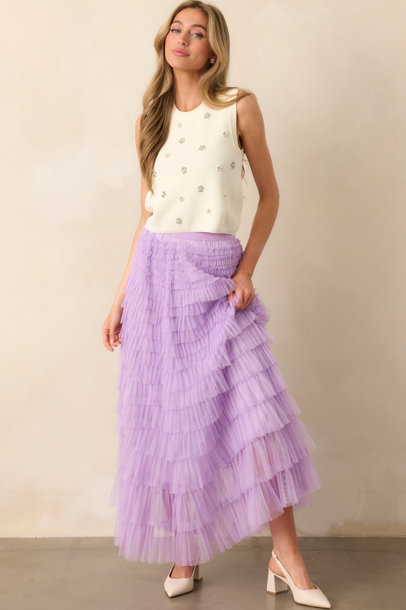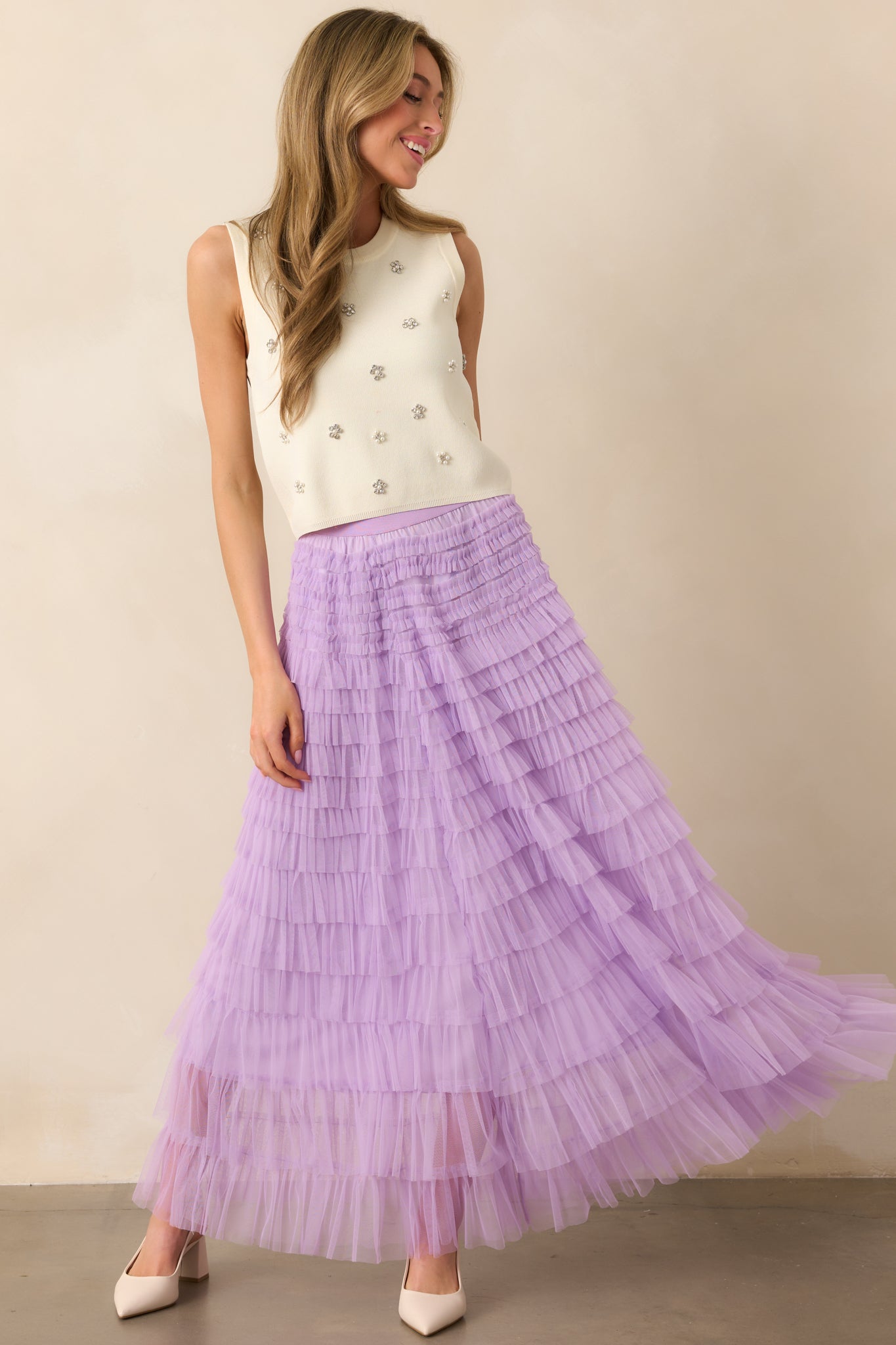 Indulge in the romantic and feminine charm of our Garden Gathering Lavender Tiered Ruffle Tulle Maxi Skirt. Made with delicate tulle and adorned with elegant ruffles, this skirt will gracefully sway with your every step. Perfect for any occasion, it's a must-have addition to your wardrobe. Enhance your style with this dreamy and enchanting skirt. This lavender skirt features an elastic waistband, tiered tulle design, and maxi length.