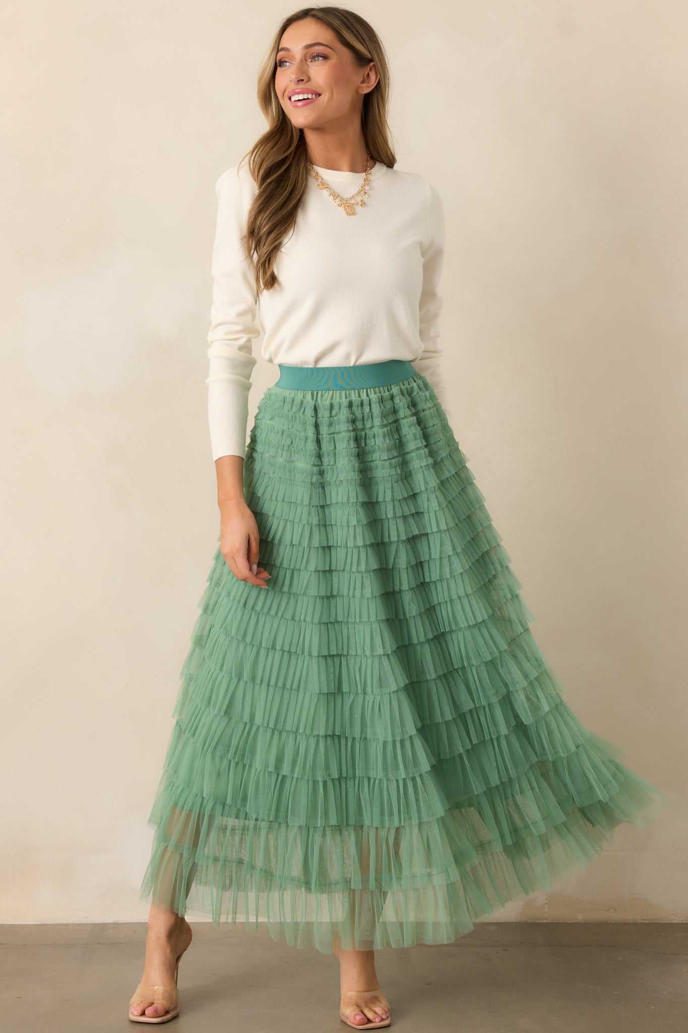 Indulge in the romantic and feminine charm of our Garden Gathering Sage Tiered Ruffle Tulle Maxi Skirt. Made with delicate tulle and adorned with elegant ruffles, this skirt will gracefully sway with your every step. Perfect for any occasion, it's a must-have addition to your wardrobe. Enhance your style with this dreamy and enchanting skirt. This sage skirt features an elastic waistband, tiered tulle design, and maxi length.