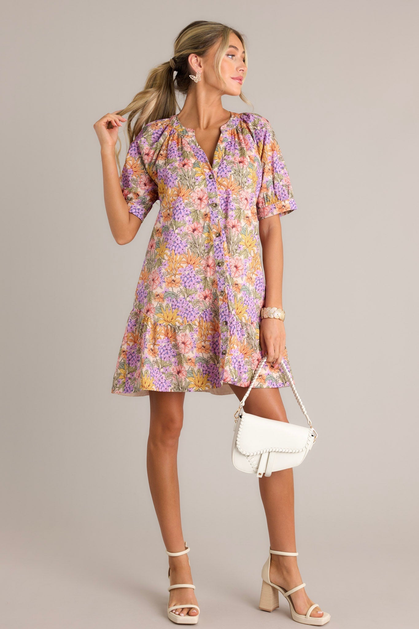 Get ready to bloom in the Garden Glow Lavender Mini Shirt Dress! Made with 100% cotton, this dress will make you feel light and breezy as you stroll through the garden (or just down the street). With a touch of lavender, it's the perfect dress for a sunny day. This lavender mini dress features a v-neckline, gathering in the chest, a functional button front, functional hip pockets, a scalloped tier, and button cuffed half sleeves.