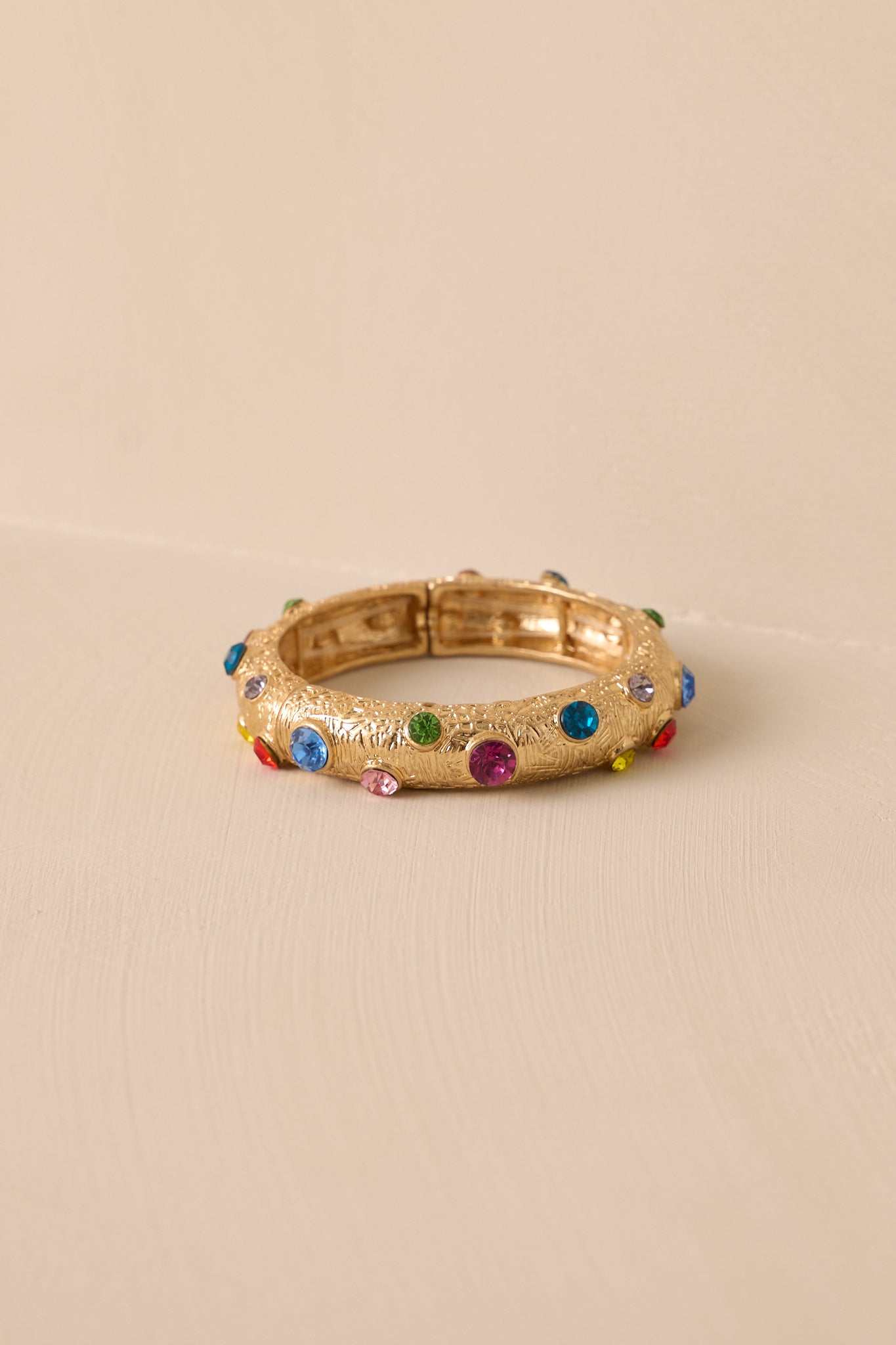 Shine bright like a diamond with our Gemstone Radiance Gold Multi Rhinestone Bracelet! This dazzling accessory features a radiant array of faux gemstones that will add a touch of glam to any outfit. Embrace your inner diva and sparkle all day (and night) long! This gold bracelet features textured material, multi-colored rhinestones, and elastic bands underneath to accommodate for as needed stretch.