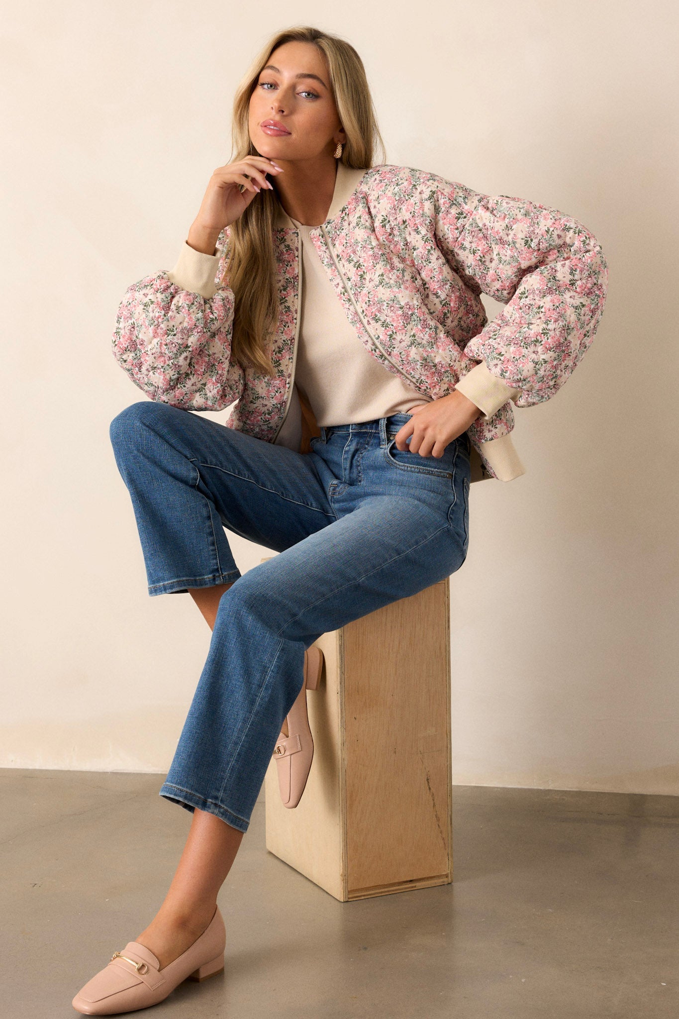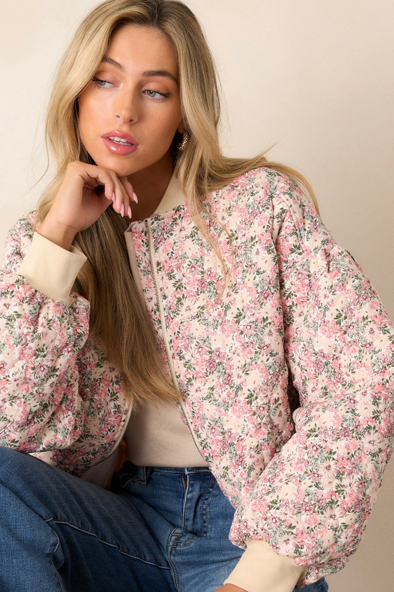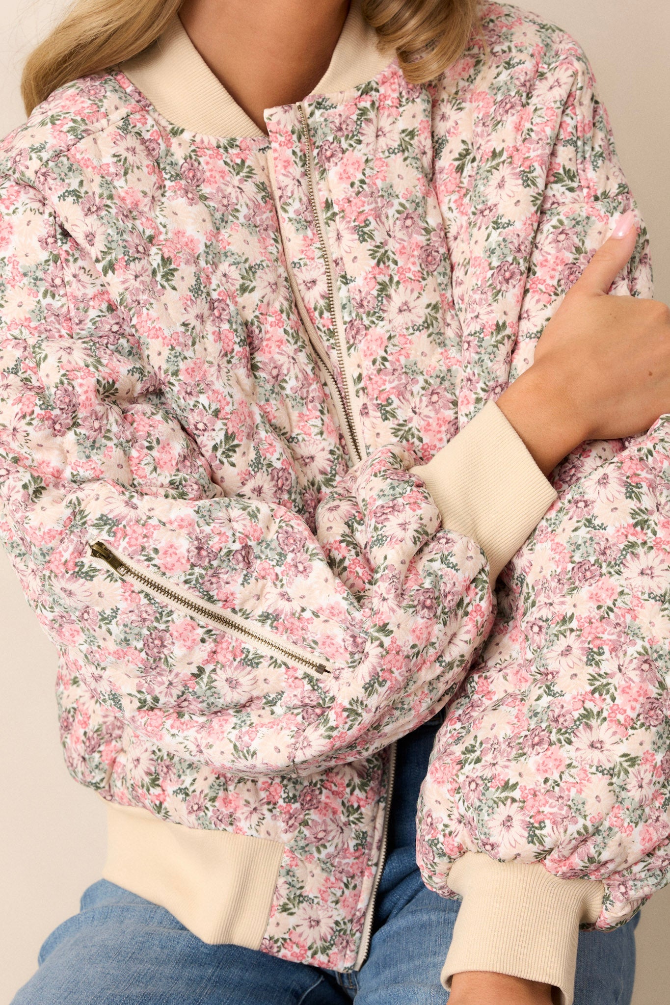 Introducing our Gentle Hues Pink Floral Quilted Bomber Jacket - a must-have for every fashionista! Stay stylish with this floral bomber jacket that brings a touch of femininity and warmth to any outfit. The perfect combination of chic and cozy, it's the ideal addition to your wardrobe. This pink floral jacket features a full zip front, functional waist pockets, a functional zipper pocket on the right sleeve.