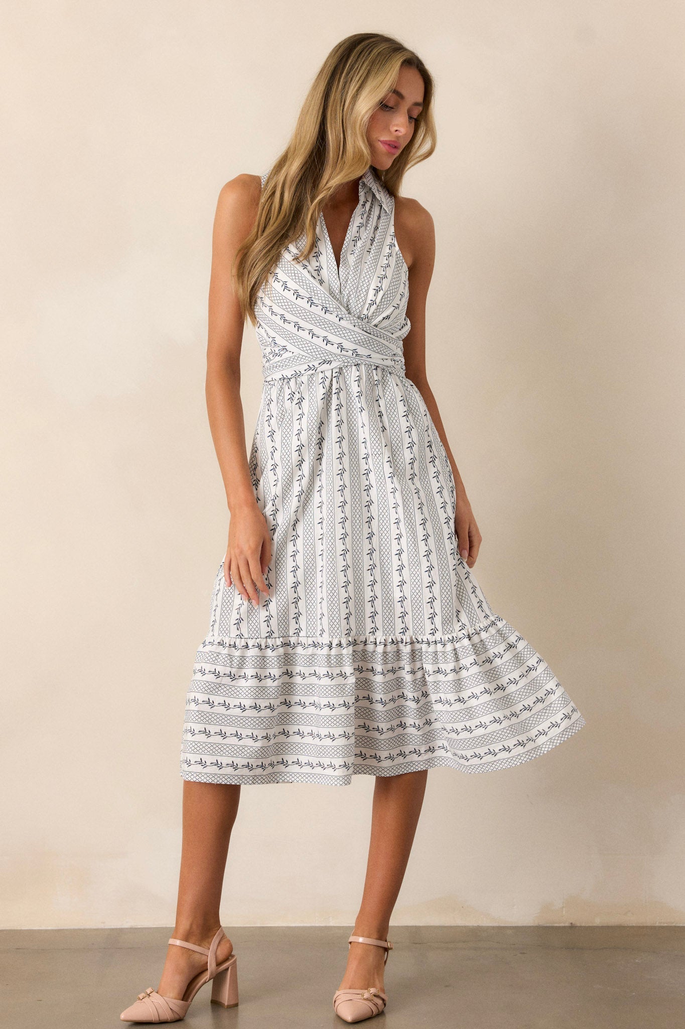 Get ready to be the life of the party with our Girl On The Go Ivory Midi Shirt Dress! With its stylish V-neck design and comfortable midi length, you'll be able to effortlessly move and groove all night long. Perfect for any occasion, this dress will have you looking and feeling fabulous. This ivory dress features navy blue floral print, a collared neckline, a self tie detail, and a ruffled bottom edge.