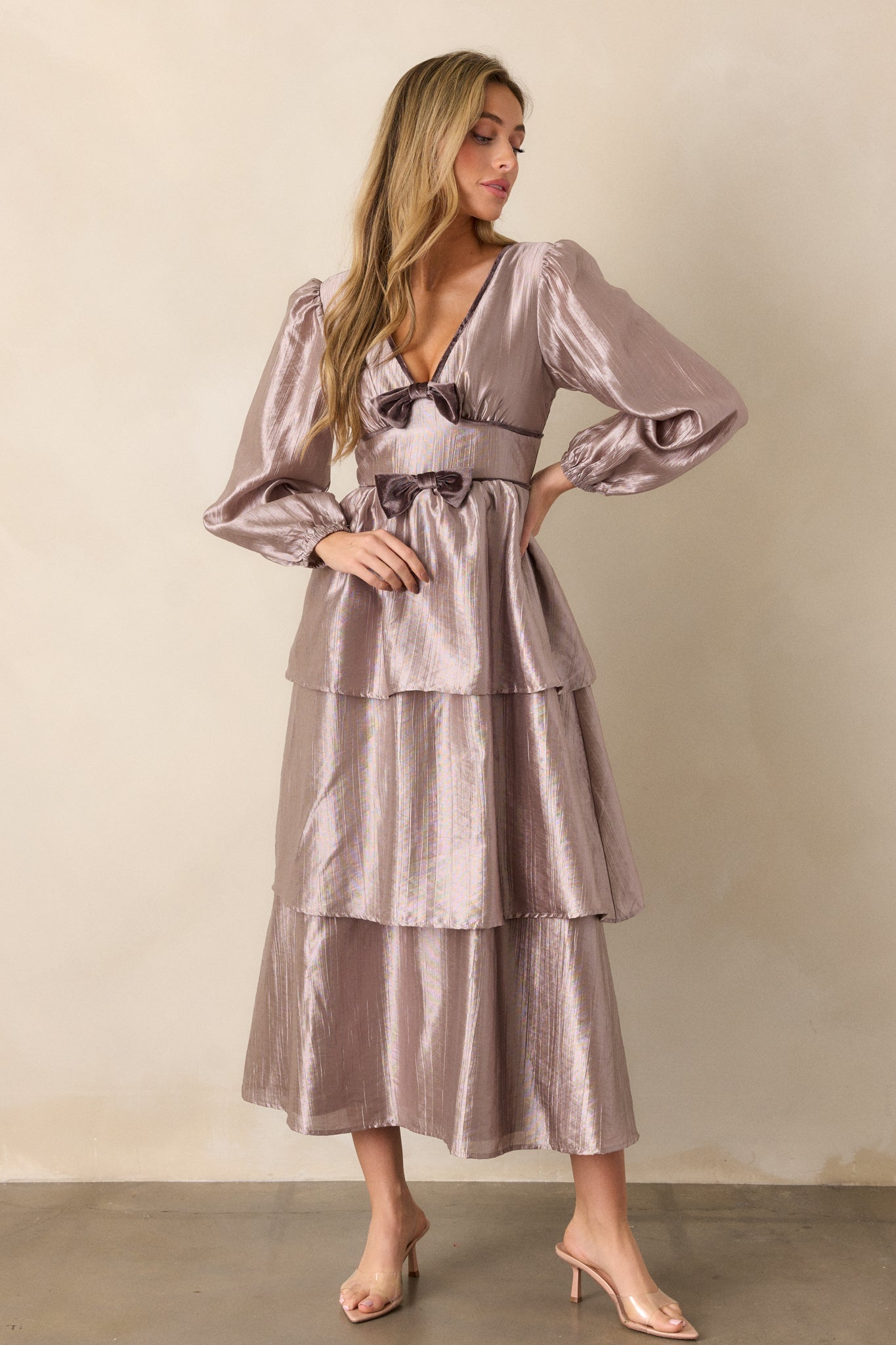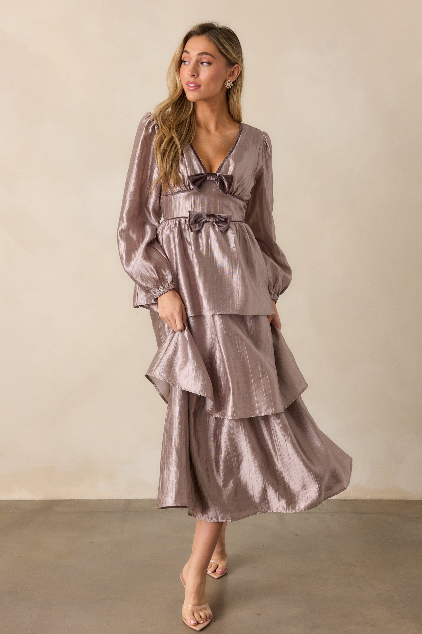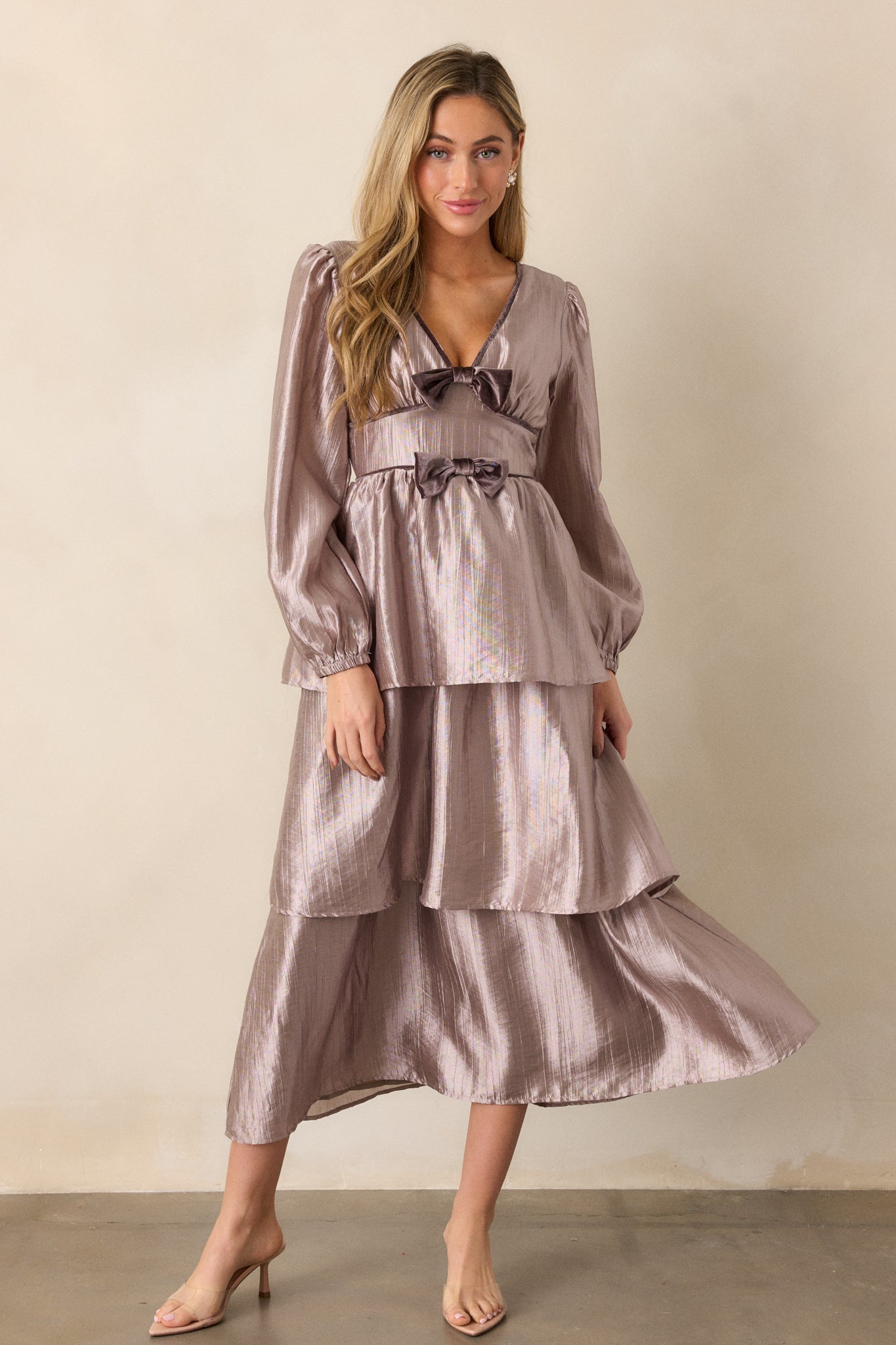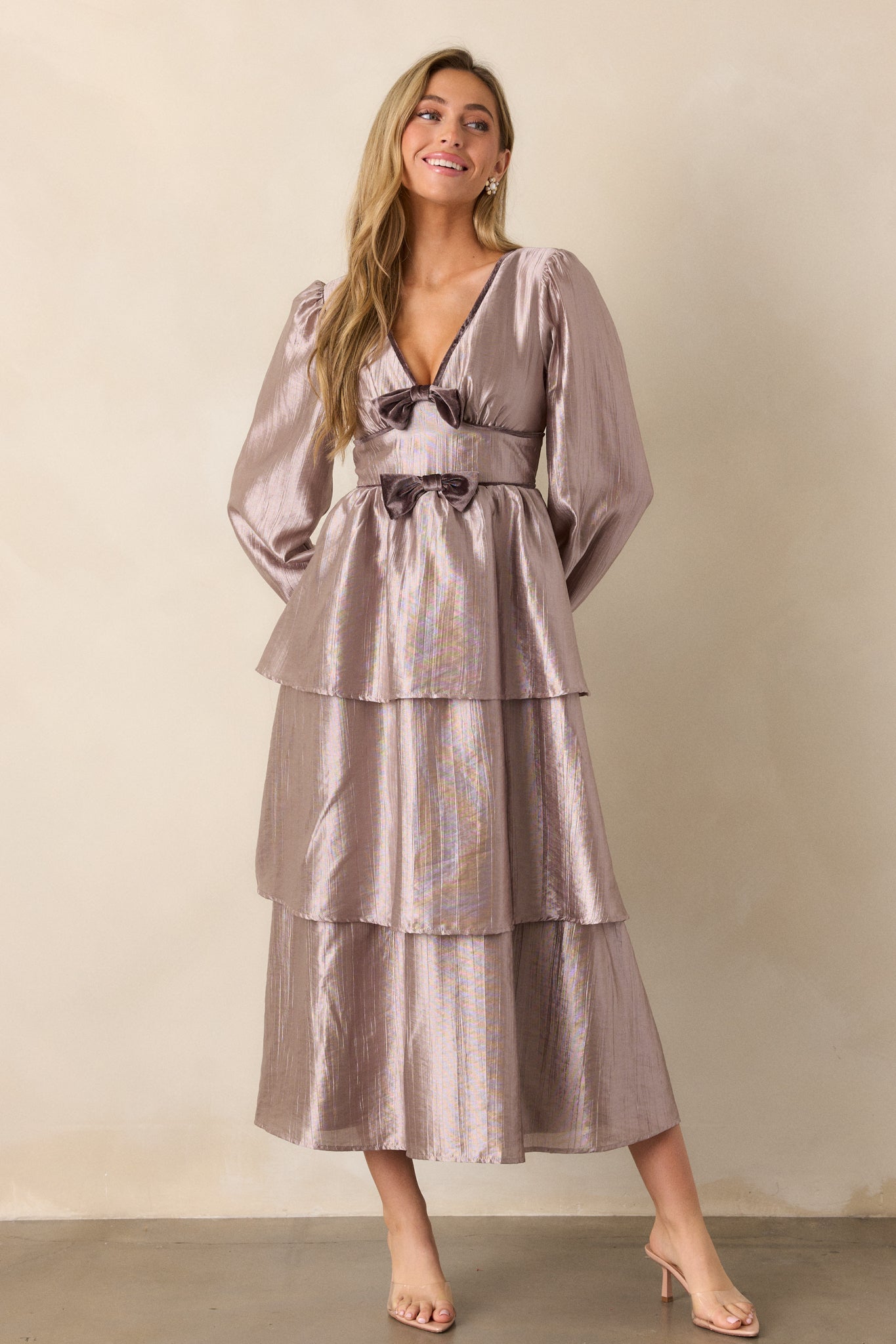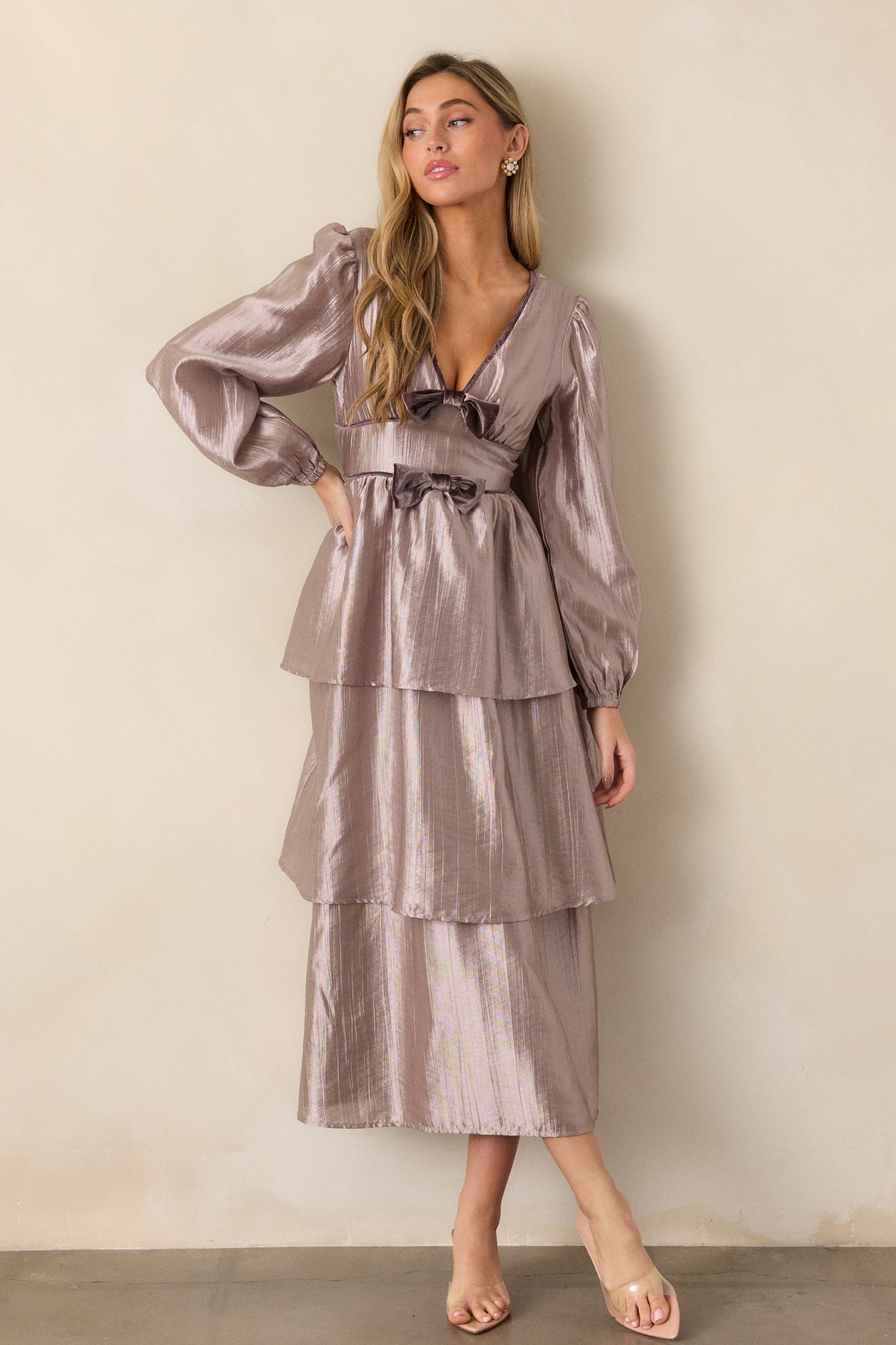 Get ready to turn heads with our Glamorous Gaze dress! The metallic grey tiered design creates a flattering silhouette, perfect for any occasion. Embrace your inner fashionista and feel confident with every step. Elevate your wardrobe with this stunning midi dress. This metallic grey dress features a v neckline, two velvet bow embellishments, velvet neck and waistline detailing, a tiered midi length skirt, a discrete back zipper and long lantern sleeves with elastic wrist cuffs.