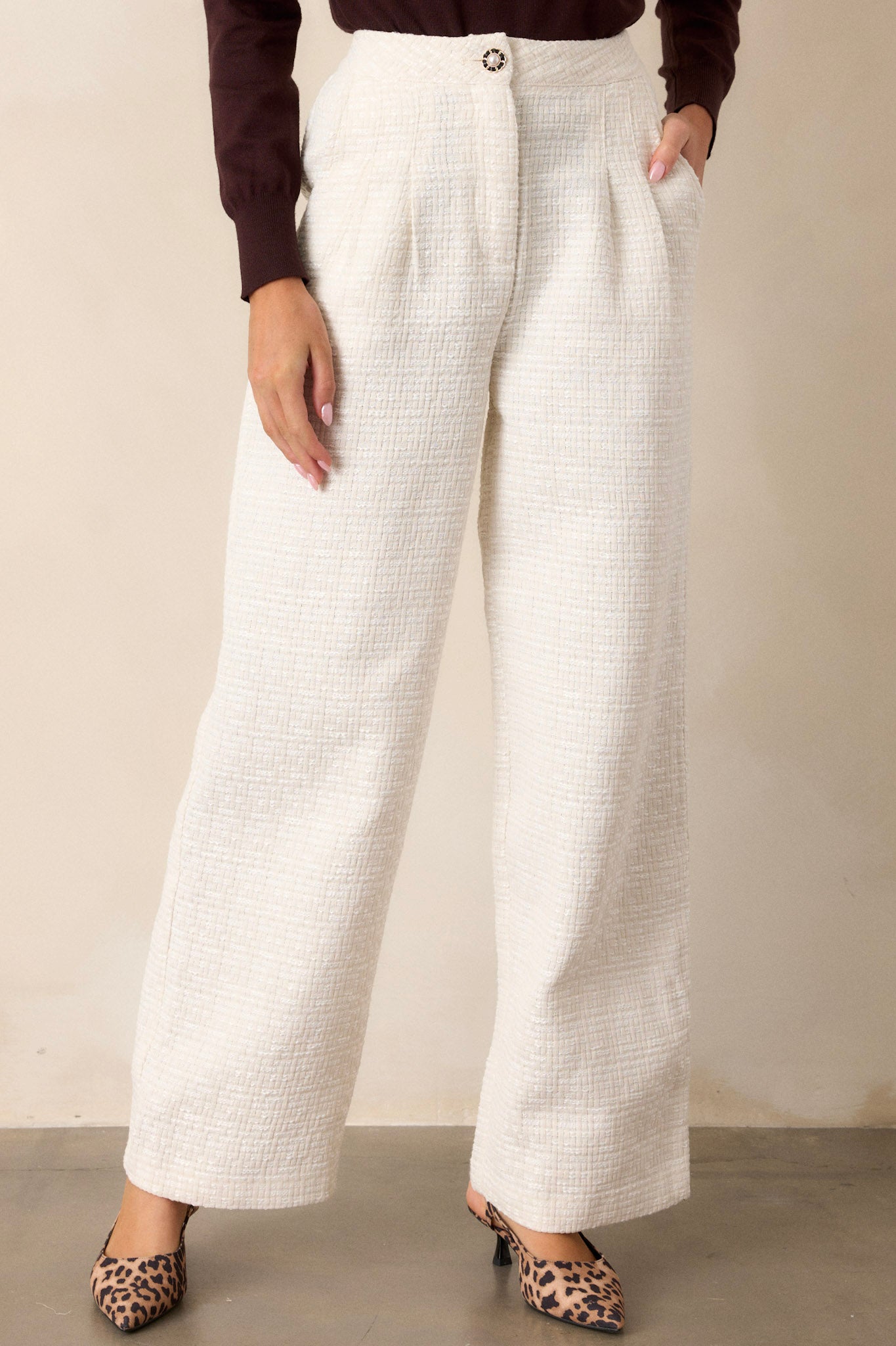 Stay stylish and comfortable with our Glass Half Full Black Tweed Pants. These ivory tweed pants are the perfect addition to your wardrobe, providing a sleek and classic look while also keeping you cozy. Make a statement and exude confidence with our versatile and must-have pants. These ivory pants feature two functional hip pockets, pleated detailing, a faux pearl button closure, and a tweed fabric.
