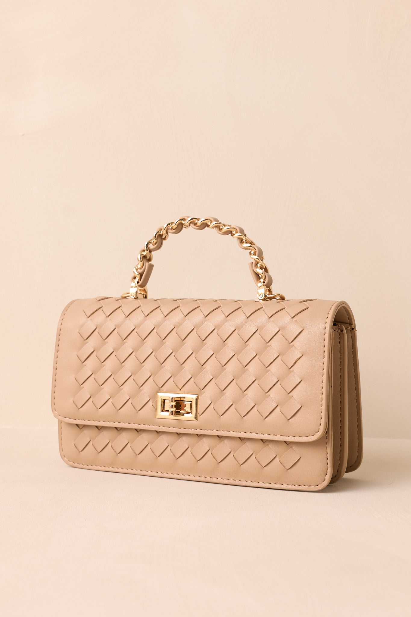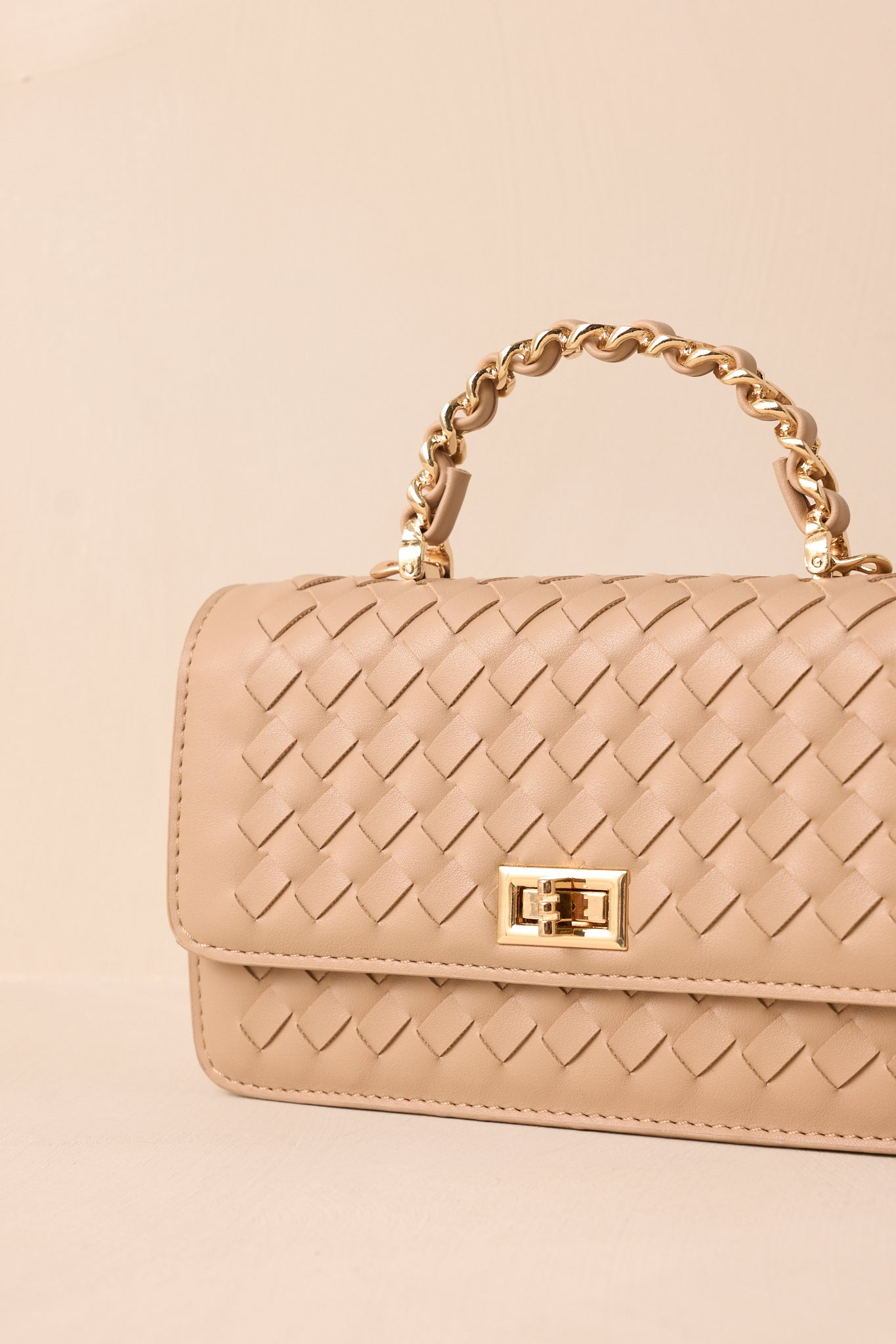 Get ready to elevate your style with our Glass Meadow Beige Woven Faux Leather Handbag! This handbag features a beautiful woven design and a chic faux leather finish. With its spacious interior and durable construction, it's the perfect accessory for any occasion. Upgrade your wardrobe and carry your essentials in style! This beige handbag features a rectangular shape, a woven faux leather material, gold hardware, a turn lock closure, two zippered inside pouches, a beige and gold chain woven optional shoulder strap and a thin beige and gold chain woven handle.