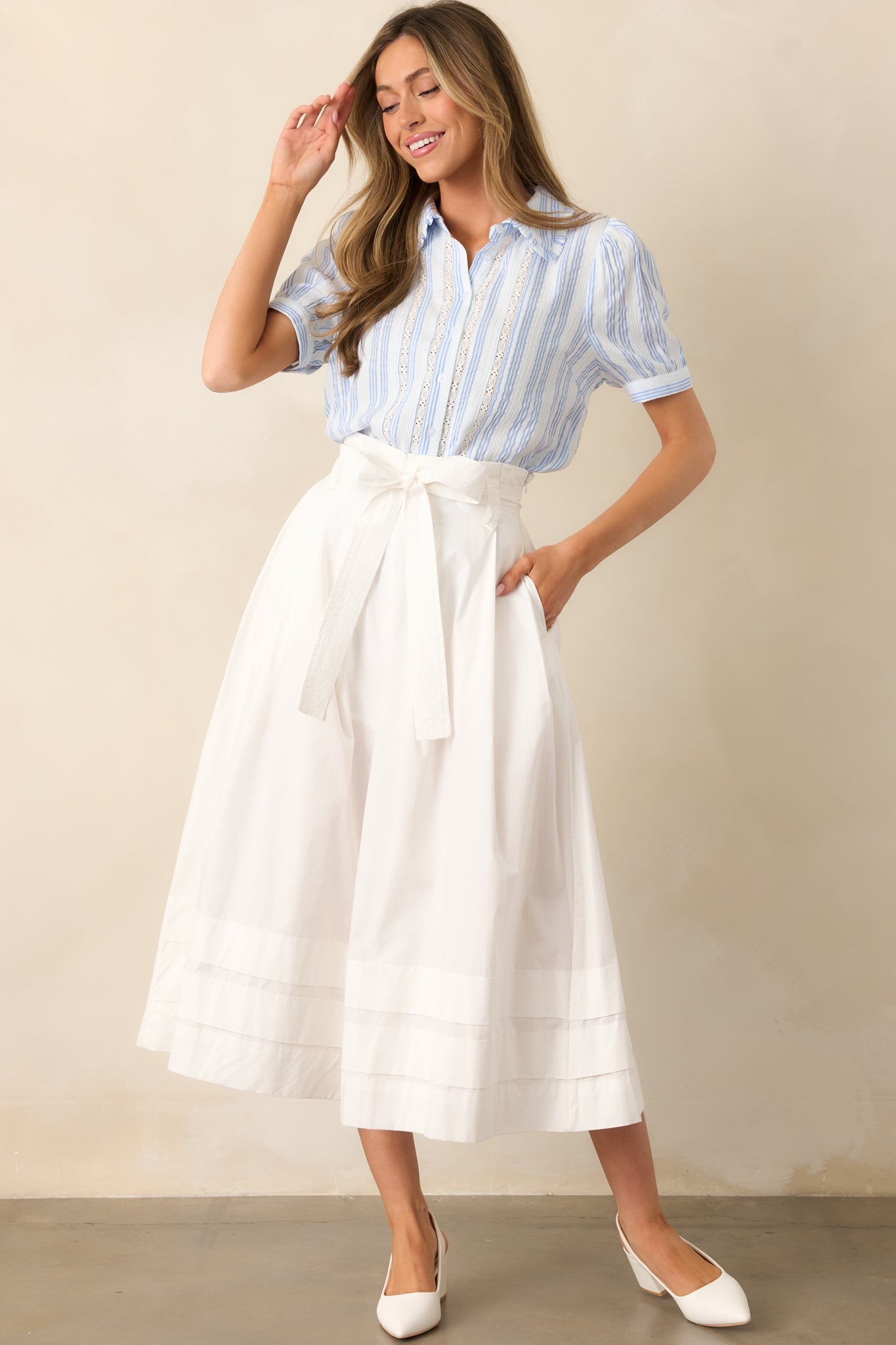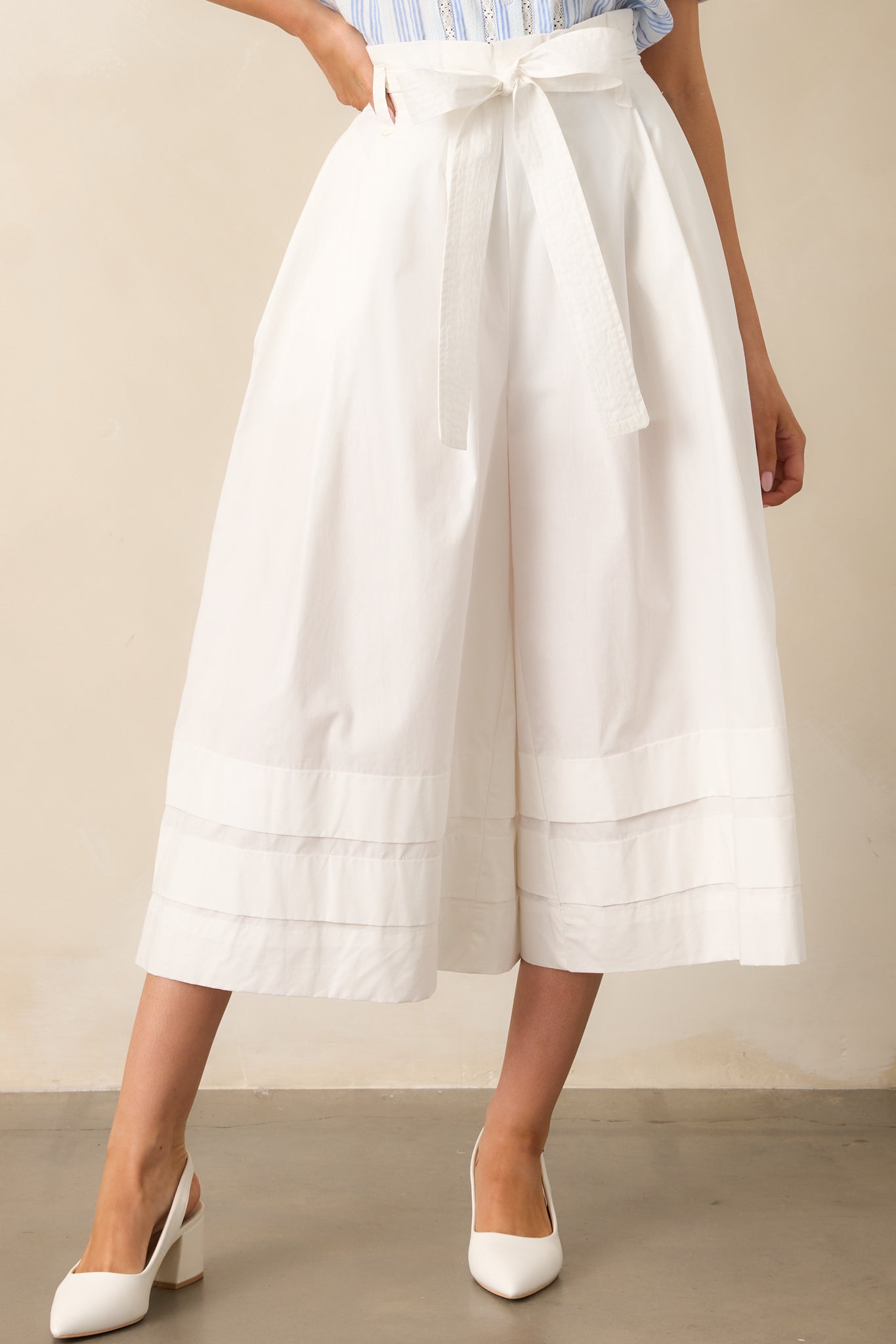 These Glimpse In Time 100% Cotton White Palazzo Pants are the perfect combination of style and comfort. With a wide leg design and cropped length, these pants will keep you looking stylish while also allowing for easy movement. The timeless white color is versatile and pairs well with any outfit. Stay in fashion with these unique and playful pants! These pants feature a high waisted design, a discrete side zipper, belt loops, a self-tie belt, functional pockets, a thick & folded hemline, and an extremely wide leg.