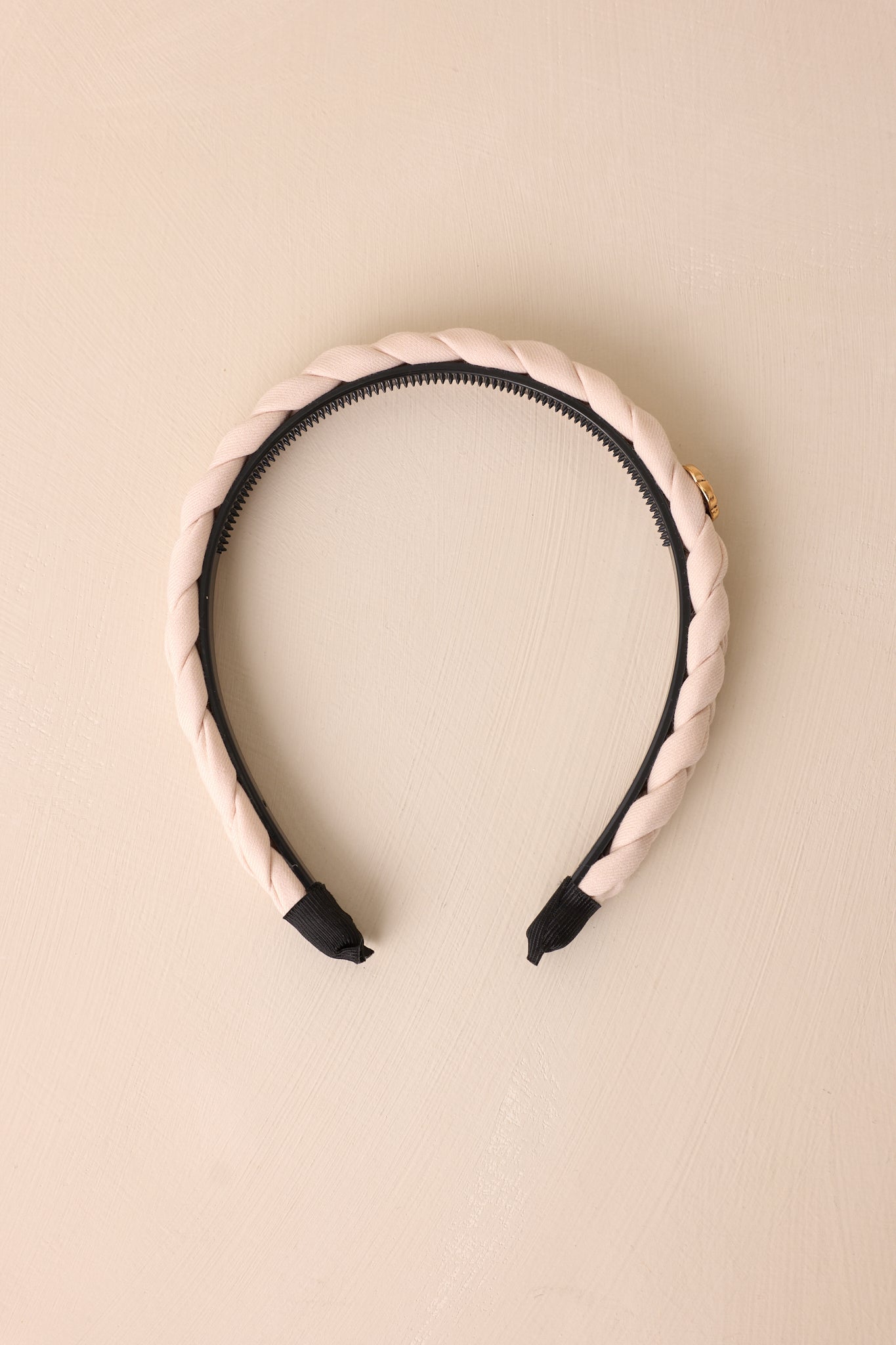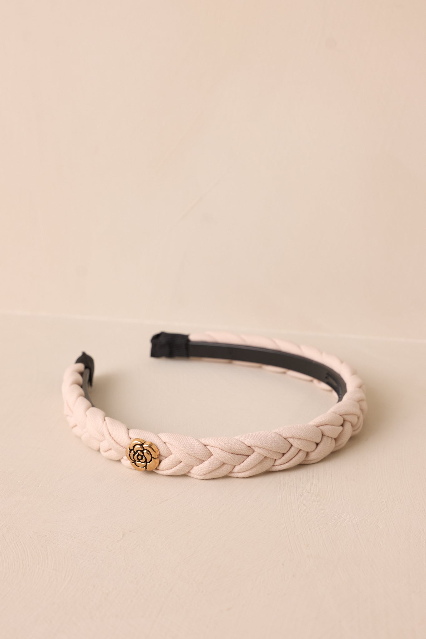 Experience comfort and style with our Glowing Rays Beige Braided Headband. Made of high-quality material, this headband features a beautiful braided design and a soft, comfortable fit. Perfect for adding a touch of fashion to your everyday look. This beige headband features a thin band, a light beige braided cloth design, black cloth endcaps, and gold floral pendant.