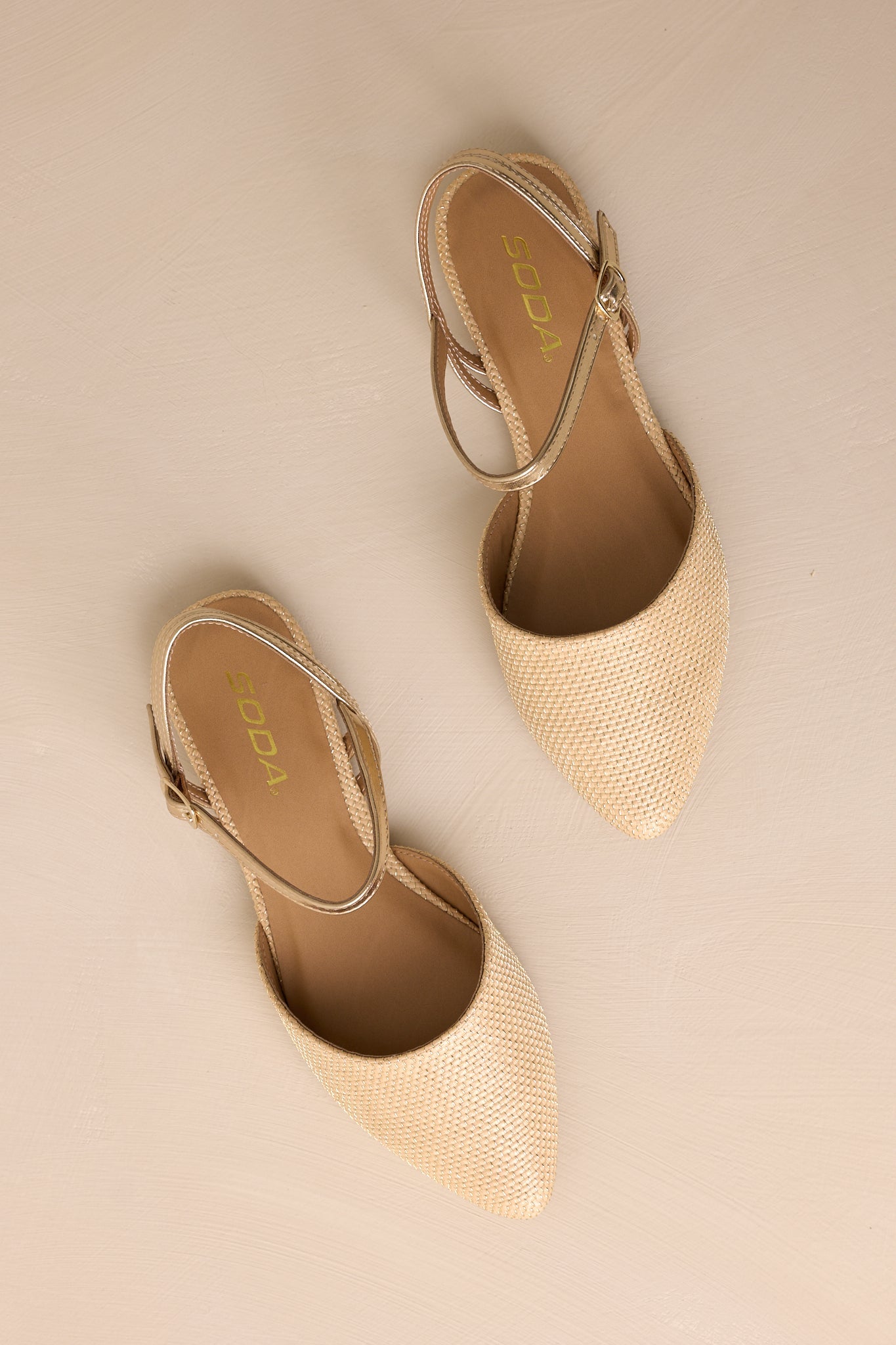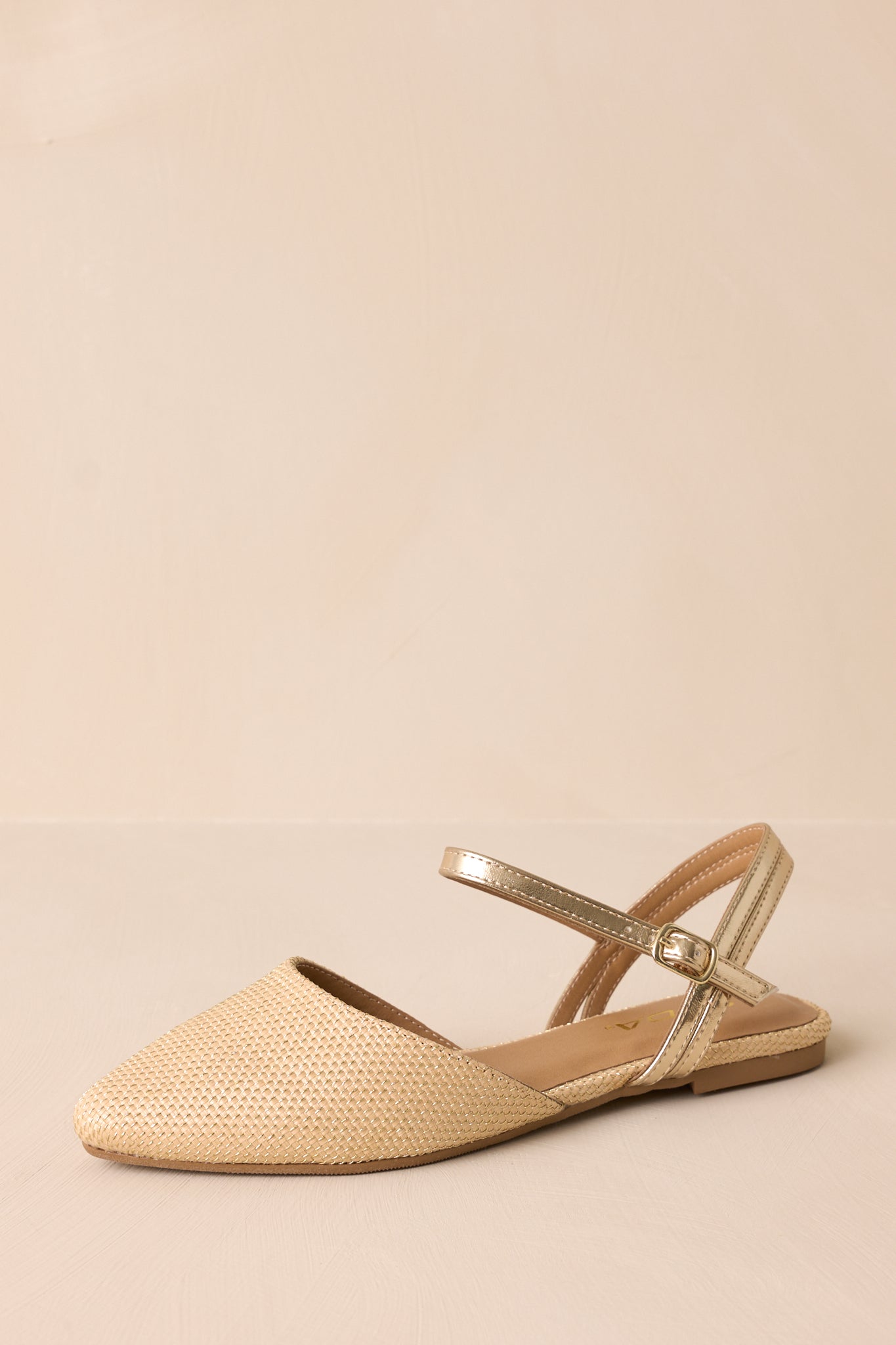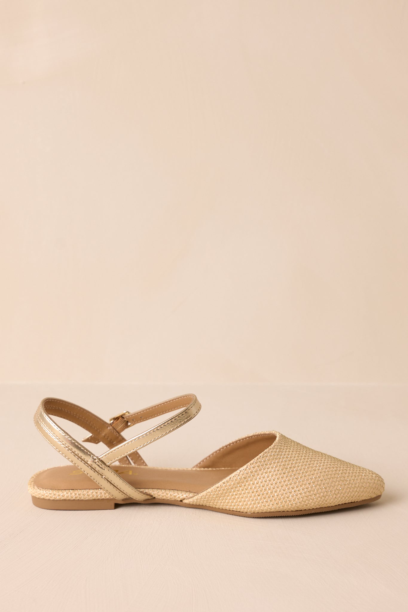 Step into stylish comfort with the Goddess Glide Beige Ankle Strap Flats. These chic yet playful flats feature a secure ankle strap and a stylish beige color that will effortlessly elevate any outfit. Glide through your day in cushioned comfort and effortless style with these flats. These beige flats feature braided gold detailing, a gold adjustable ankle strap and a cushioned sole.