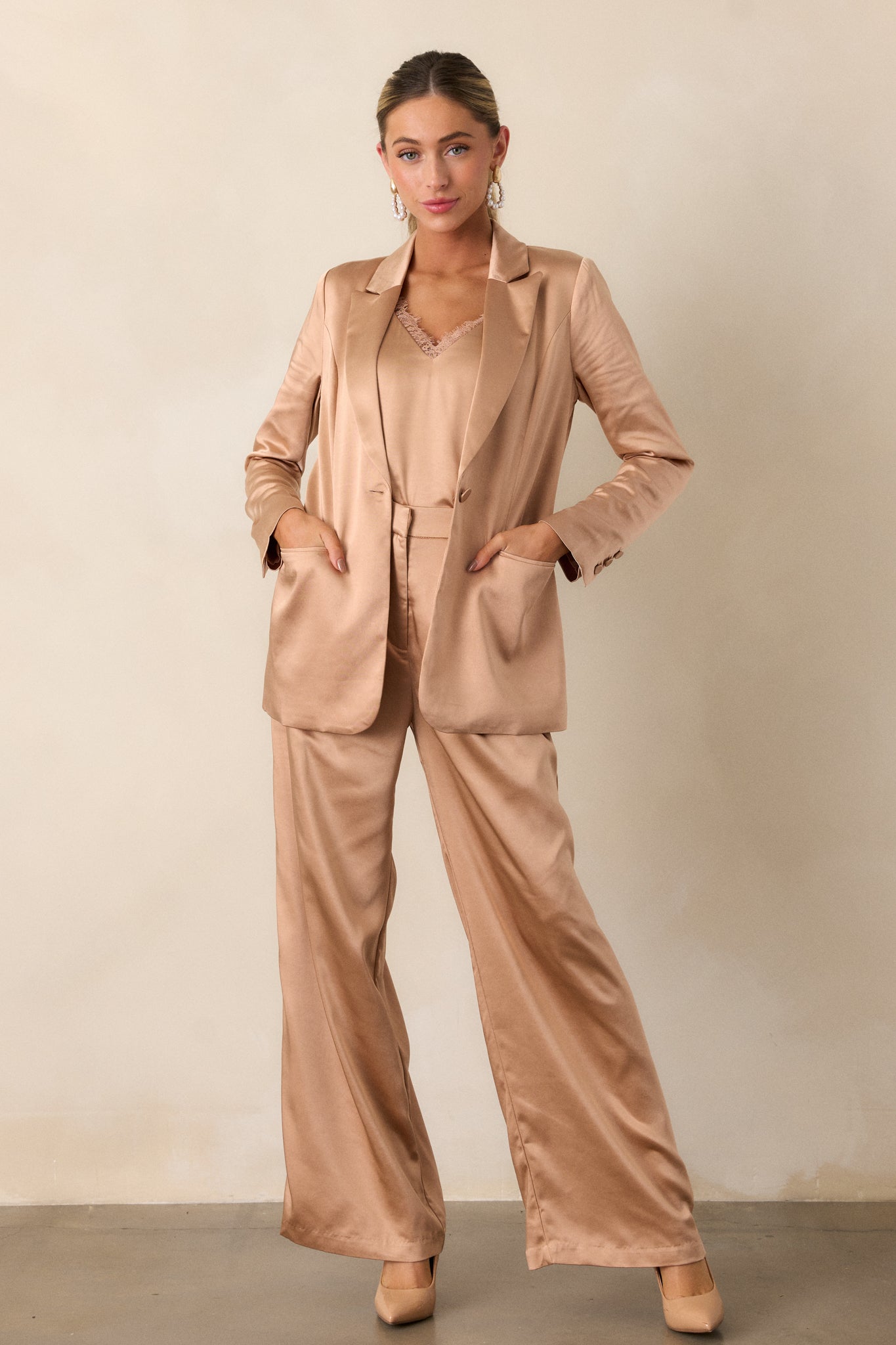 Elevate your style with our Going Places blazer! Made with a lightweight light copper satin fabric, this blazer is perfect for any occasion. Dress it up for a night out or wear it to the office for a touch of sophistication. You'll feel confident and stylish wherever you go. This light copper blazer features a collared and notched lapel neckline, functional button front, functional front pockets, vent back detailing, and long sleeves with button cuffs.