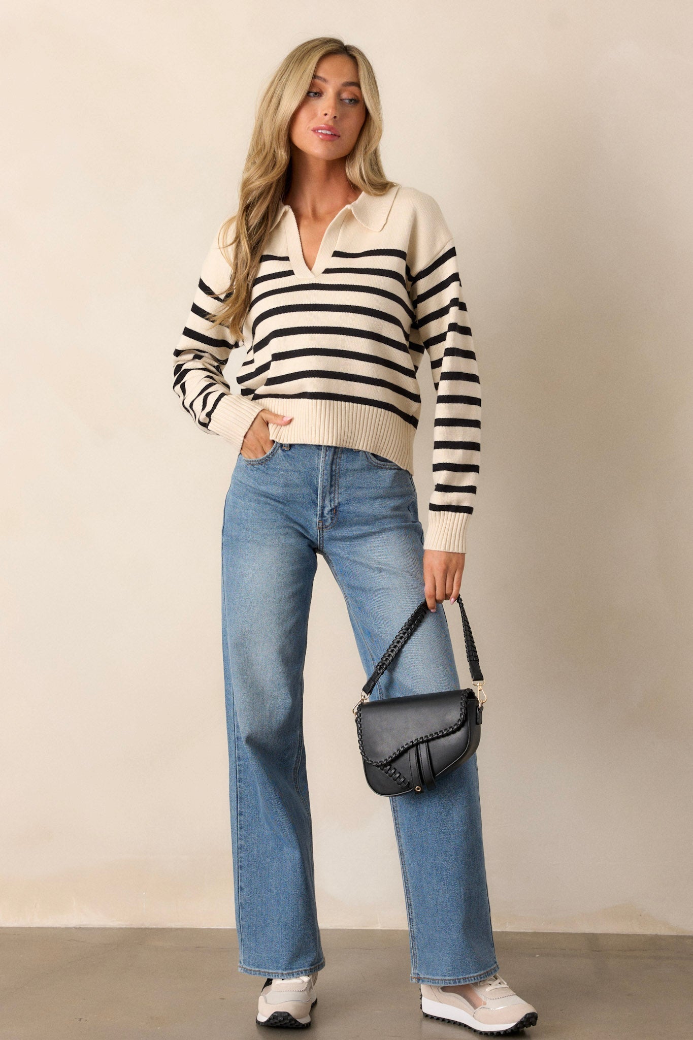 Get ready for some serious style points with the Got A Feeling Beige & Black Stripe Collared Sweater! This chic sweater features a classic stripe design. Perfect for any occasion, this sweater will have you feeling confident and stylish all day long. Don't miss out on this must-have addition to your wardrobe! This beige sweater features a v-neckline with a collar, classic black horizontal stripes, long sleeves, and a ribbed hem and cuffs.