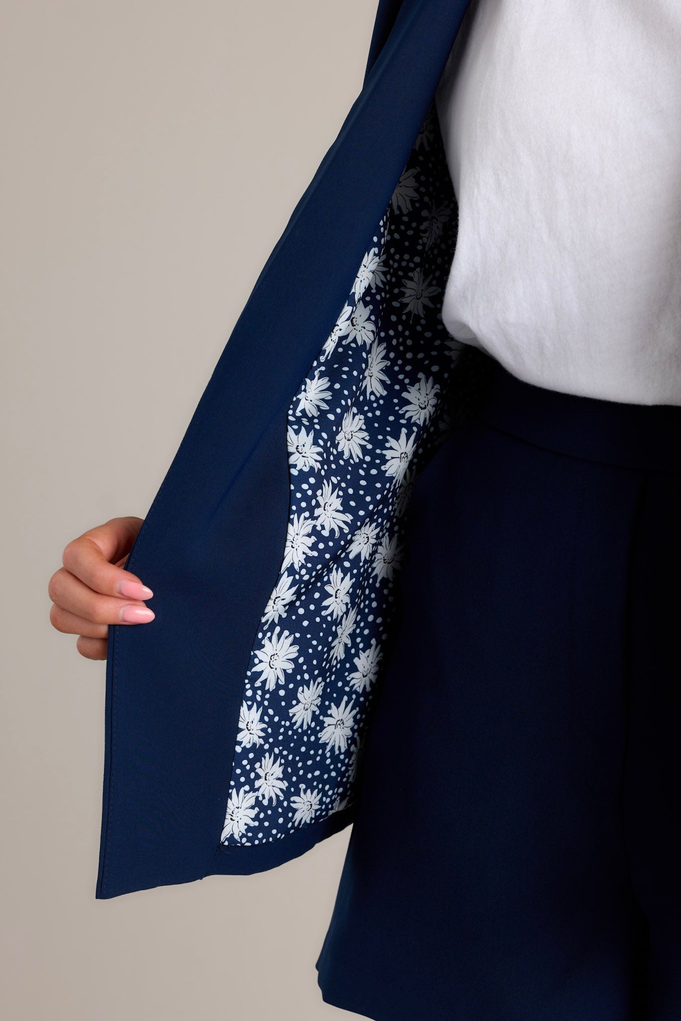 Introducing the Grace In Every Step Lightweight Navy Blazer - the perfect combination of style and comfort! With a sleek navy color and lightweight material, you'll feel effortlessly chic while also staying cool and comfortable. Perfect for the office to a night out, this blazer is sure to become your new go-to piece in your wardrobe. This navy blazer features a notched lapel collared neckline, shoulder padding, no button closure, functional pockets, a floral lining, and long sleeves.