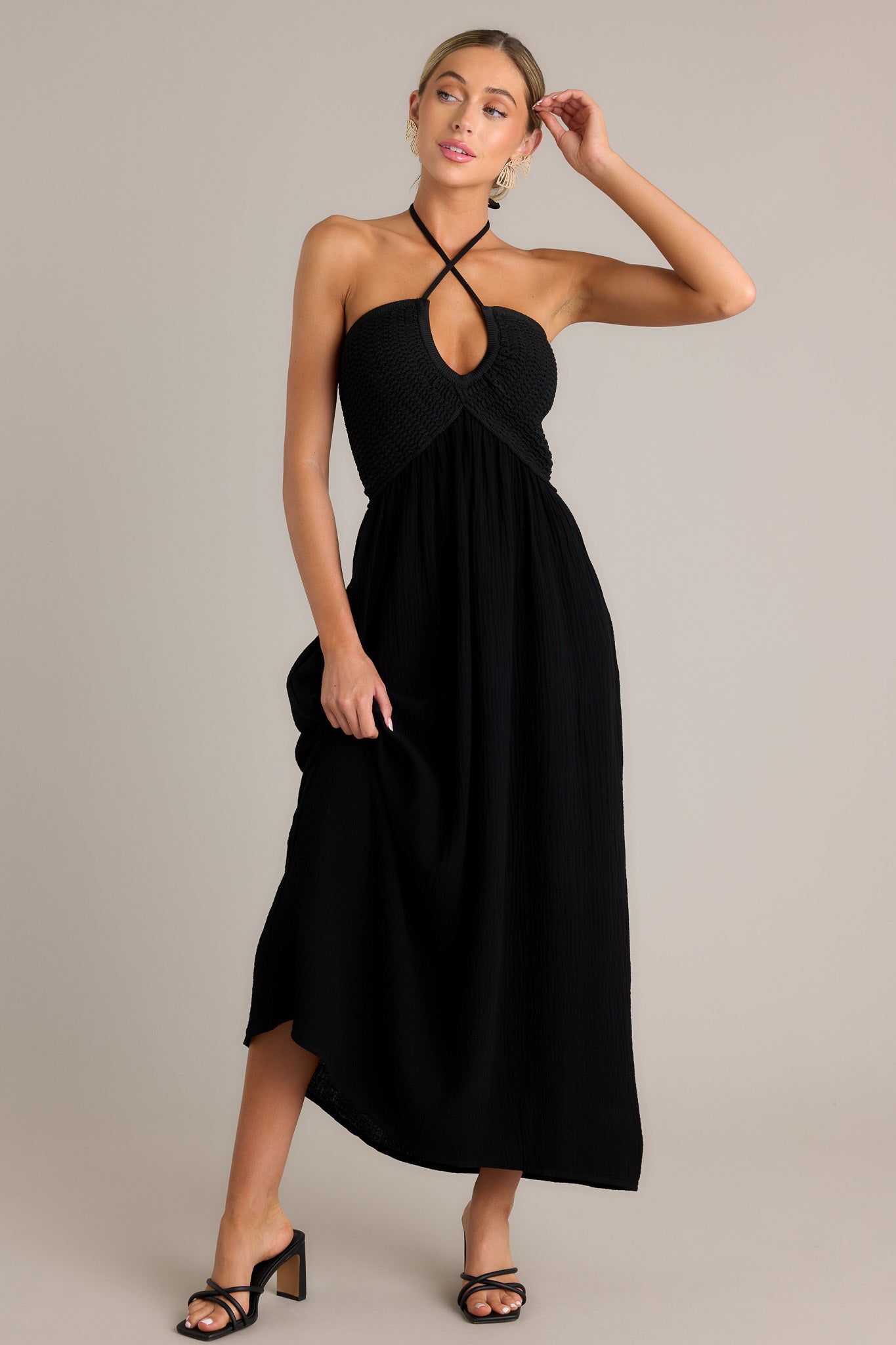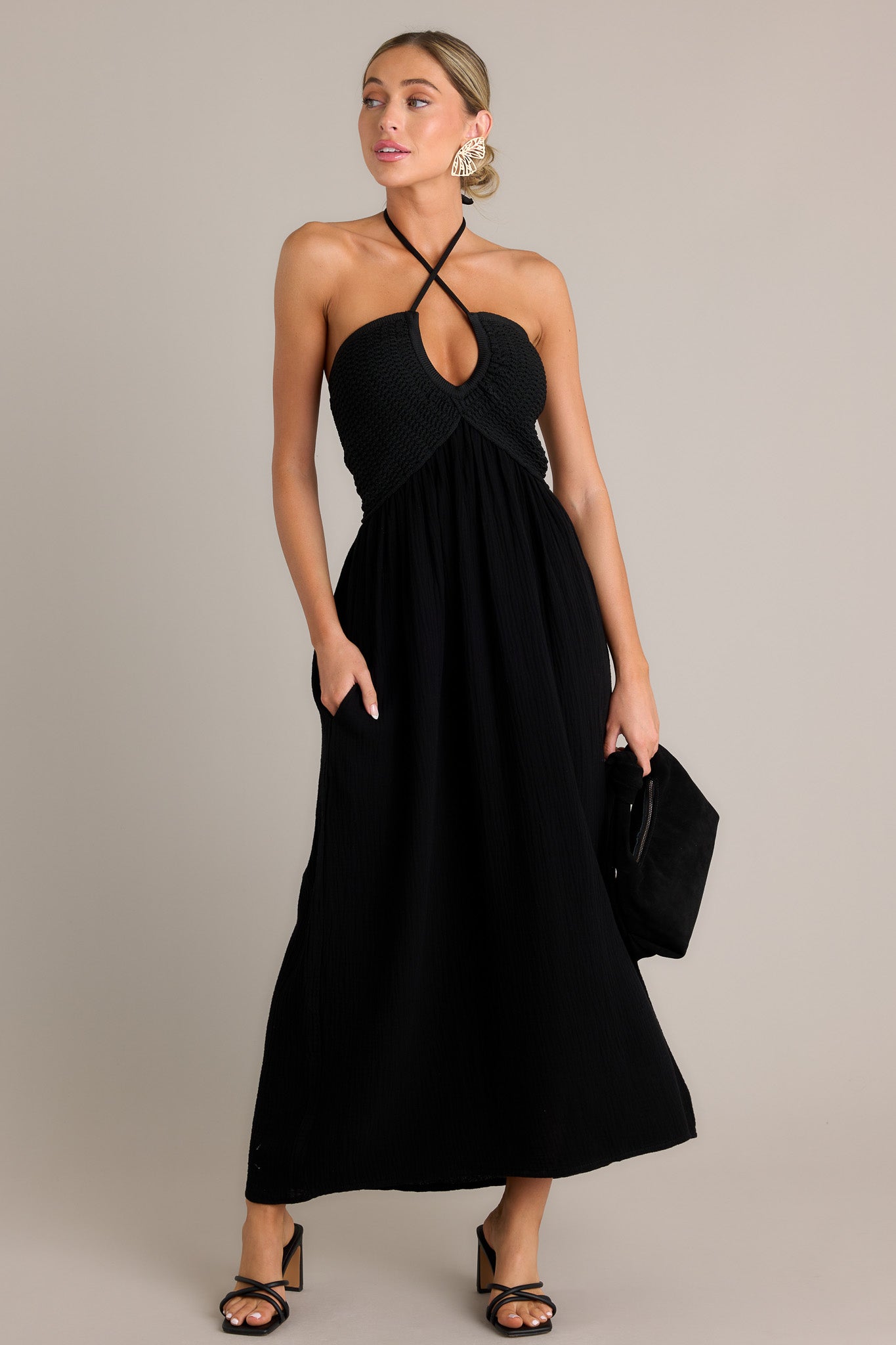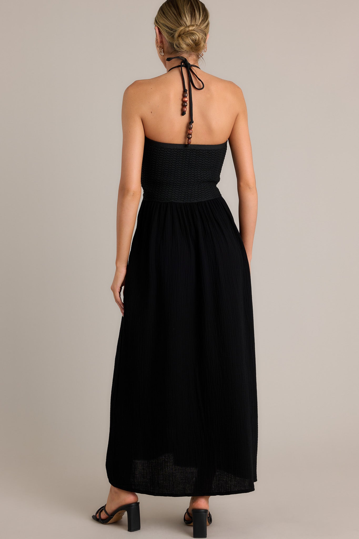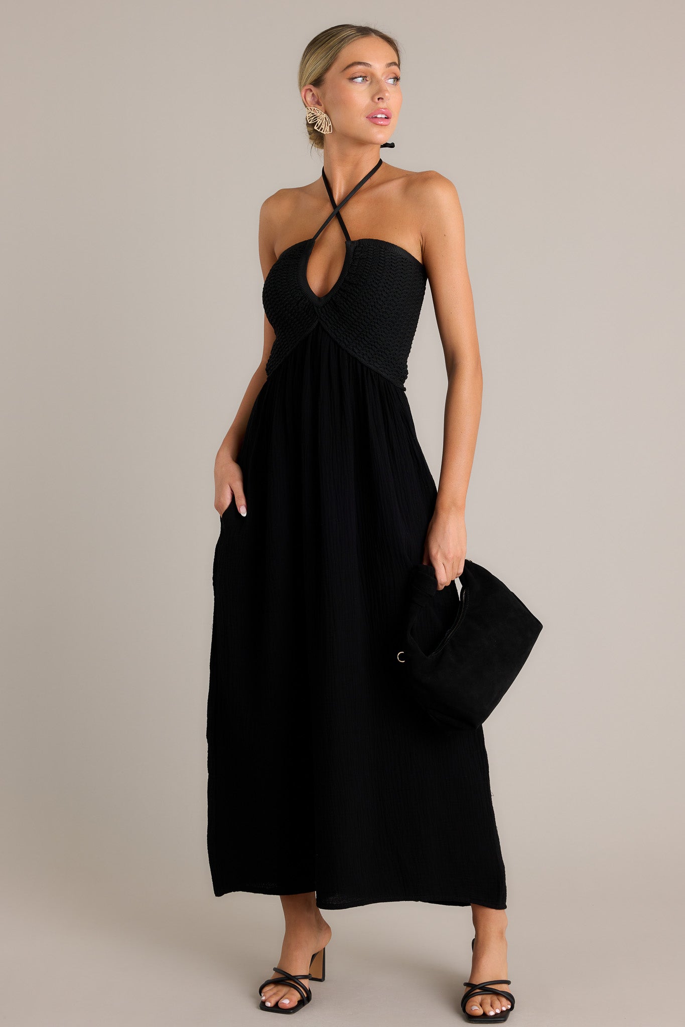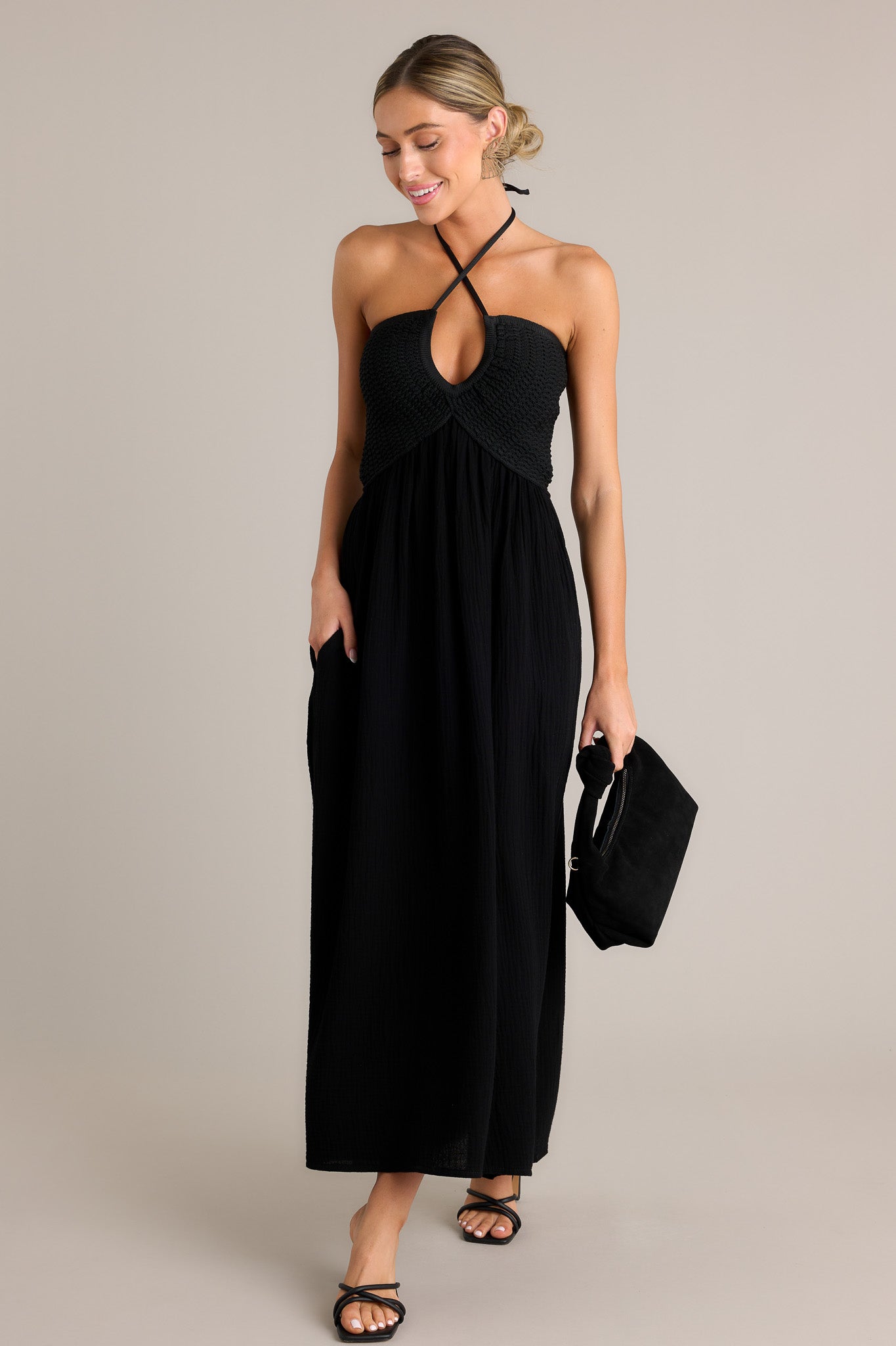 Float effortlessly through your day in the Graceful Flow Maxi Dress. Made from 100% cotton, this black dress offers ultimate comfort and style. With a flowing silhouette, it's perfect for any occasion. Make a statement and stand out in this unique and chic piece. This black maxi dress features a beaded self-tie halter neckline, a knitted bodice, functional hip pockets, and a flowing silhouette.