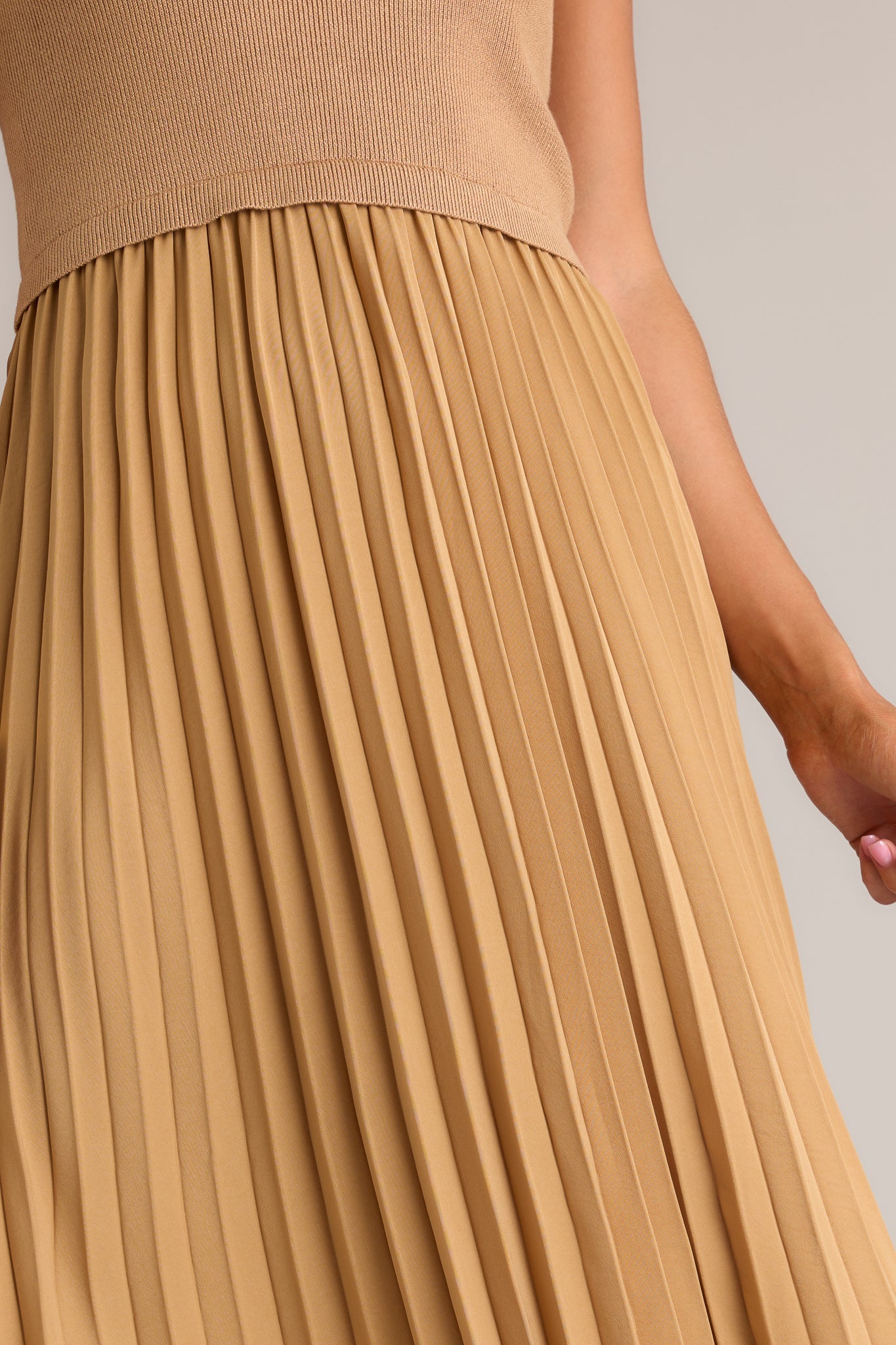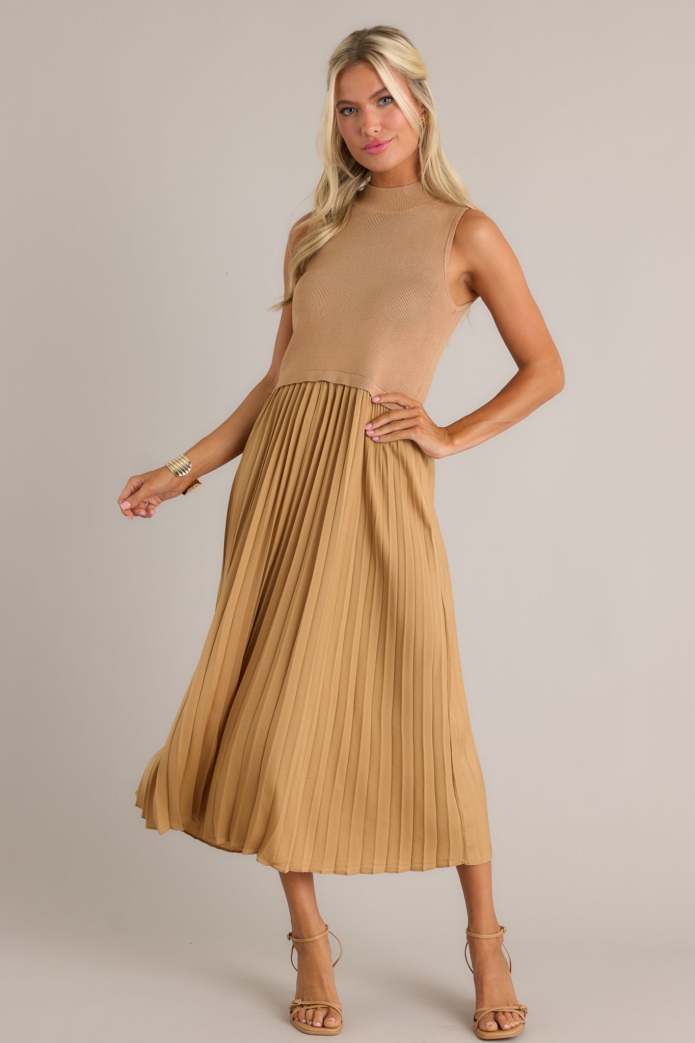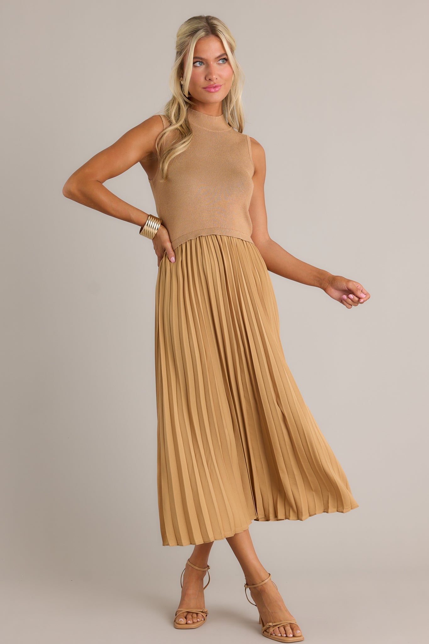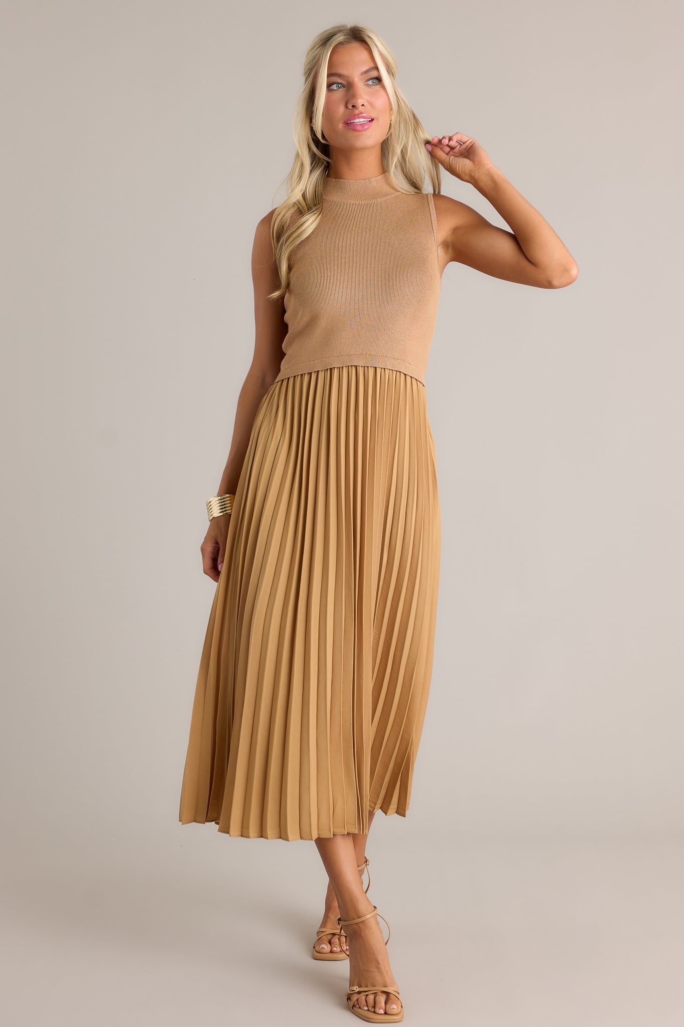 Add some elegance to your wardrobe with our Graceful Gather Mustard Sleeveless Maxi Dress. The beautiful gathers create a flattering silhouette, while the sleeveless design is perfect for warmer weather. Dress it up or down for any occasion, and stay stylish with this versatile piece. This mustard sleeveless dress features a high neckline, a ribbed knit bodice, a pleated skirt, a sleeveless design and a flowing silhouette.