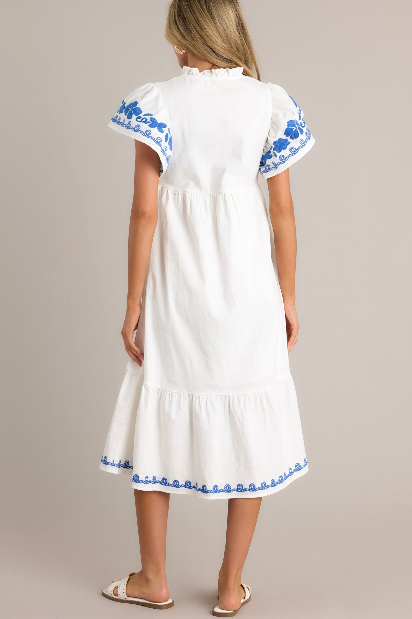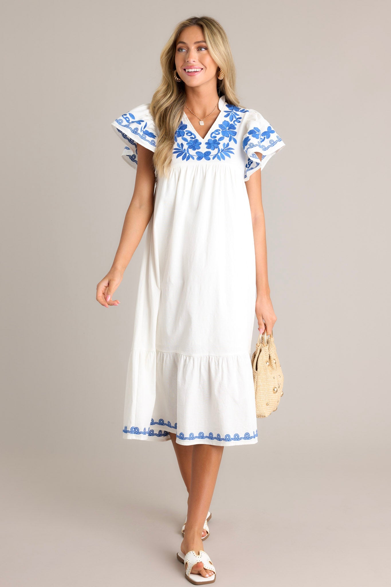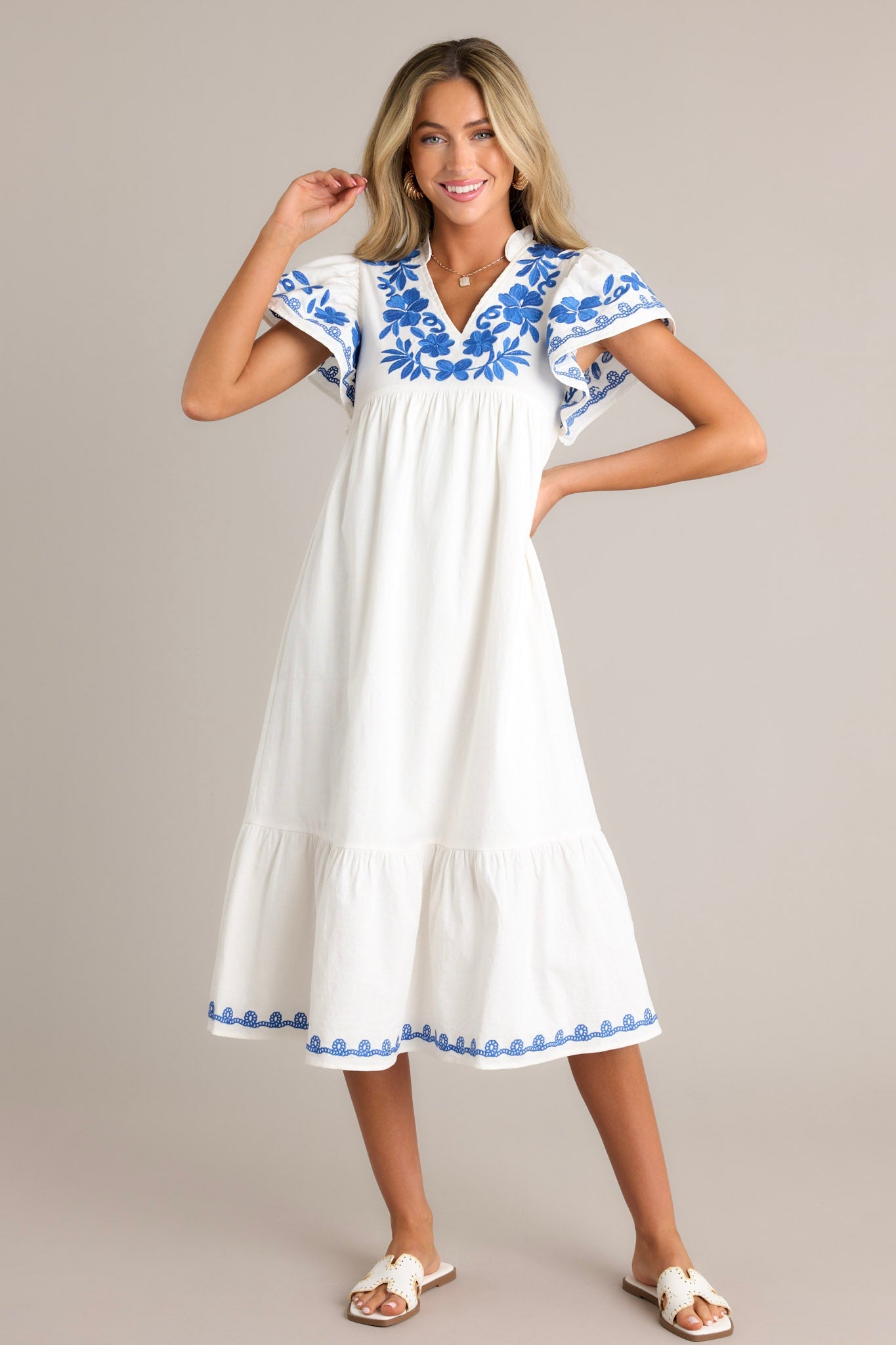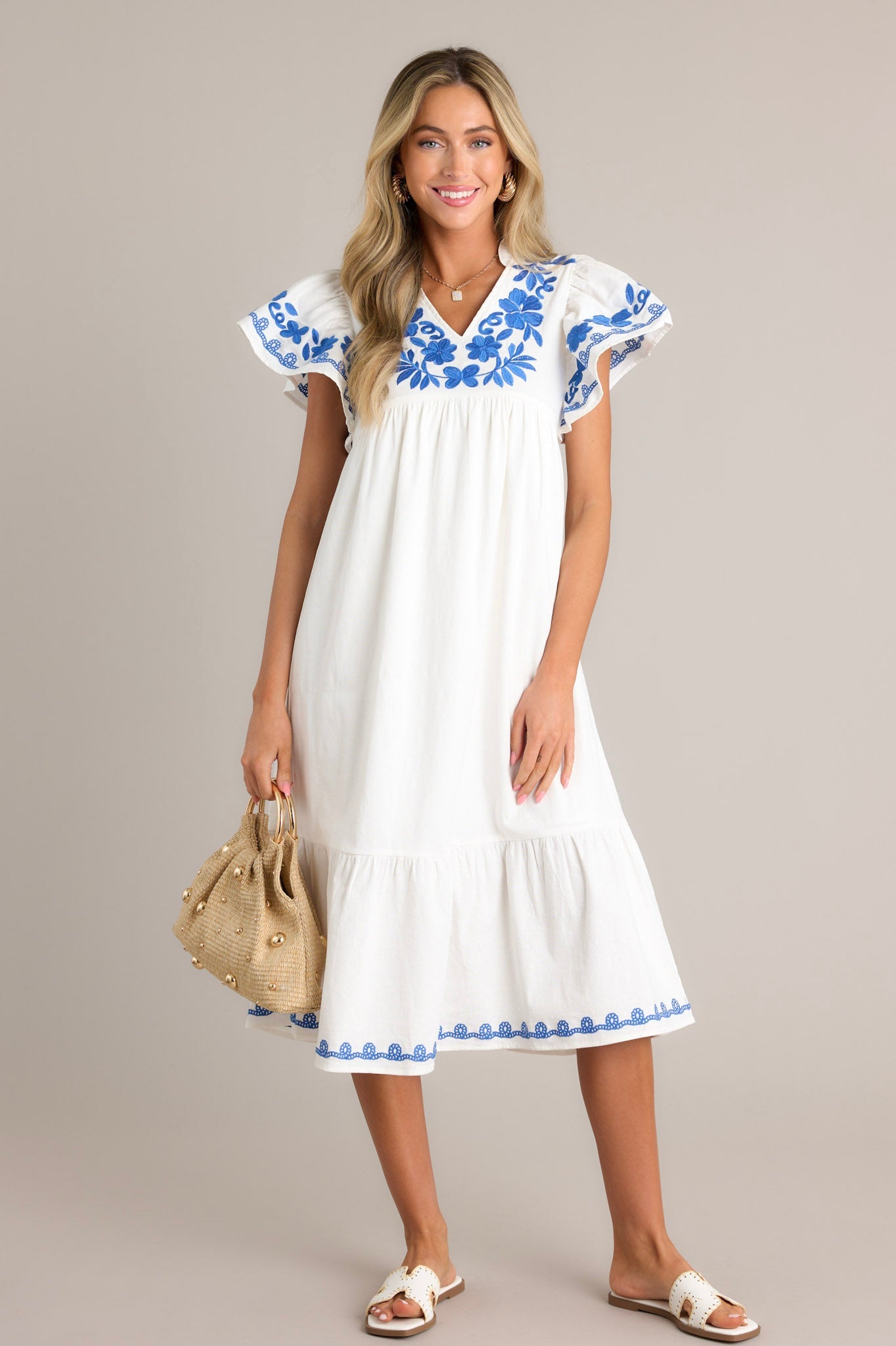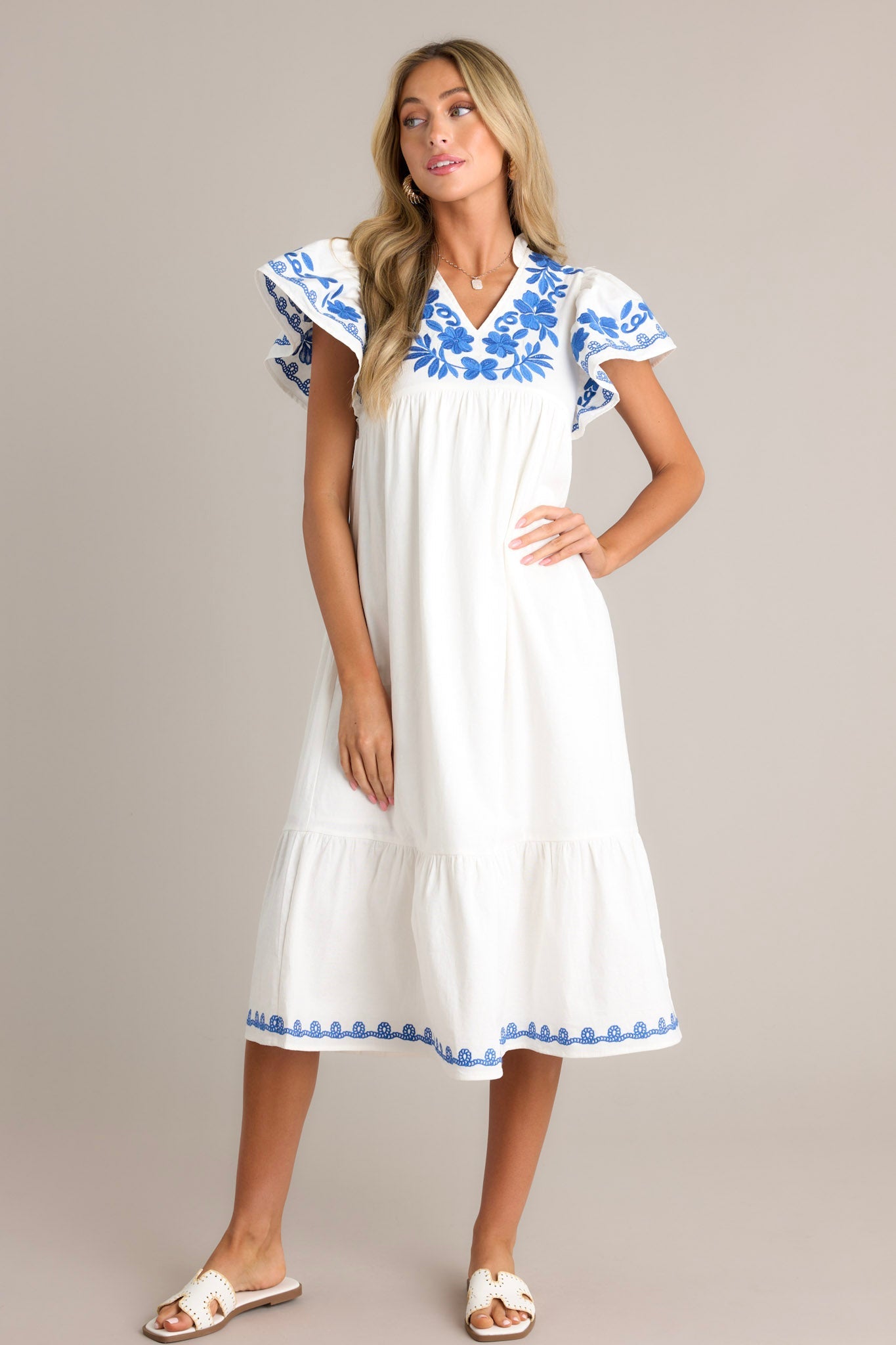 Be the epitome of elegance and playfulness in our Harmonic Bliss Ivory Embroidered Midi Dress. This dress features intricate embroidery and a midi length, perfect for any occasion. Get ready to turn heads and make a statement with this unique and charming dress! This ivory midi dress features a ruffled v-neckline, blue floral embroidery, a single tier, an embroidered hemline, and short embroidered flutter sleeves.