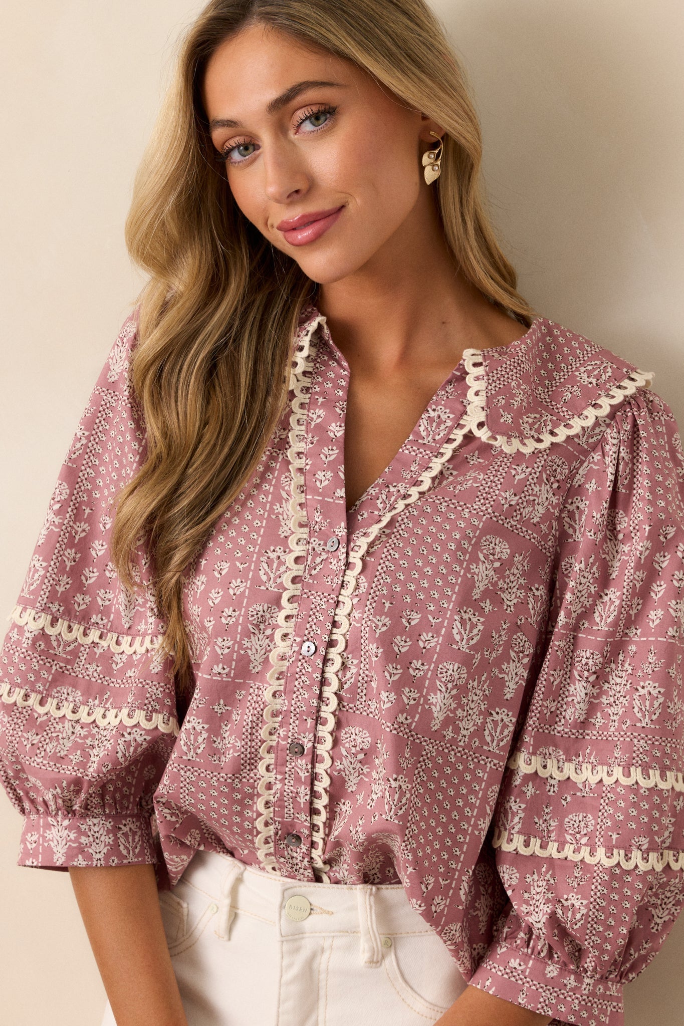 Introducing the Harmonious Petals 100% Cotton Dusty Pink Blouse! The subtle pink hue and delicate floral design will have you feeling confident and beautiful. Light and airy, it's comfortable and stylish for any occasion. Elevate your wardrobe today! This dusty pink blouse features a collared v-neckline, button up front, small scalloped hemming, a beautiful floral pattern, and 3/4 puff sleeves with scalloped detailing.
