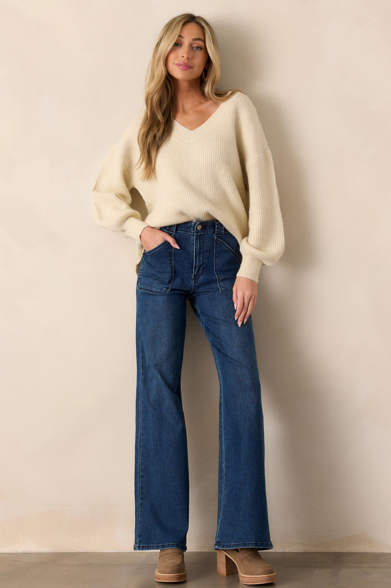 Step into ultimate comfort and style with our Hazy Days Dark Wash Wide Leg Jeans. These jeans feature a relaxed fit and wide leg design, perfect for a carefree and playful look. Whether you're lounging or out on the town, these jeans will keep you looking effortlessly cool. These dark wash jeans feature a high waisted design, classic button & zipper closure, belt loops, functional front patch pockets, and a flare leg.