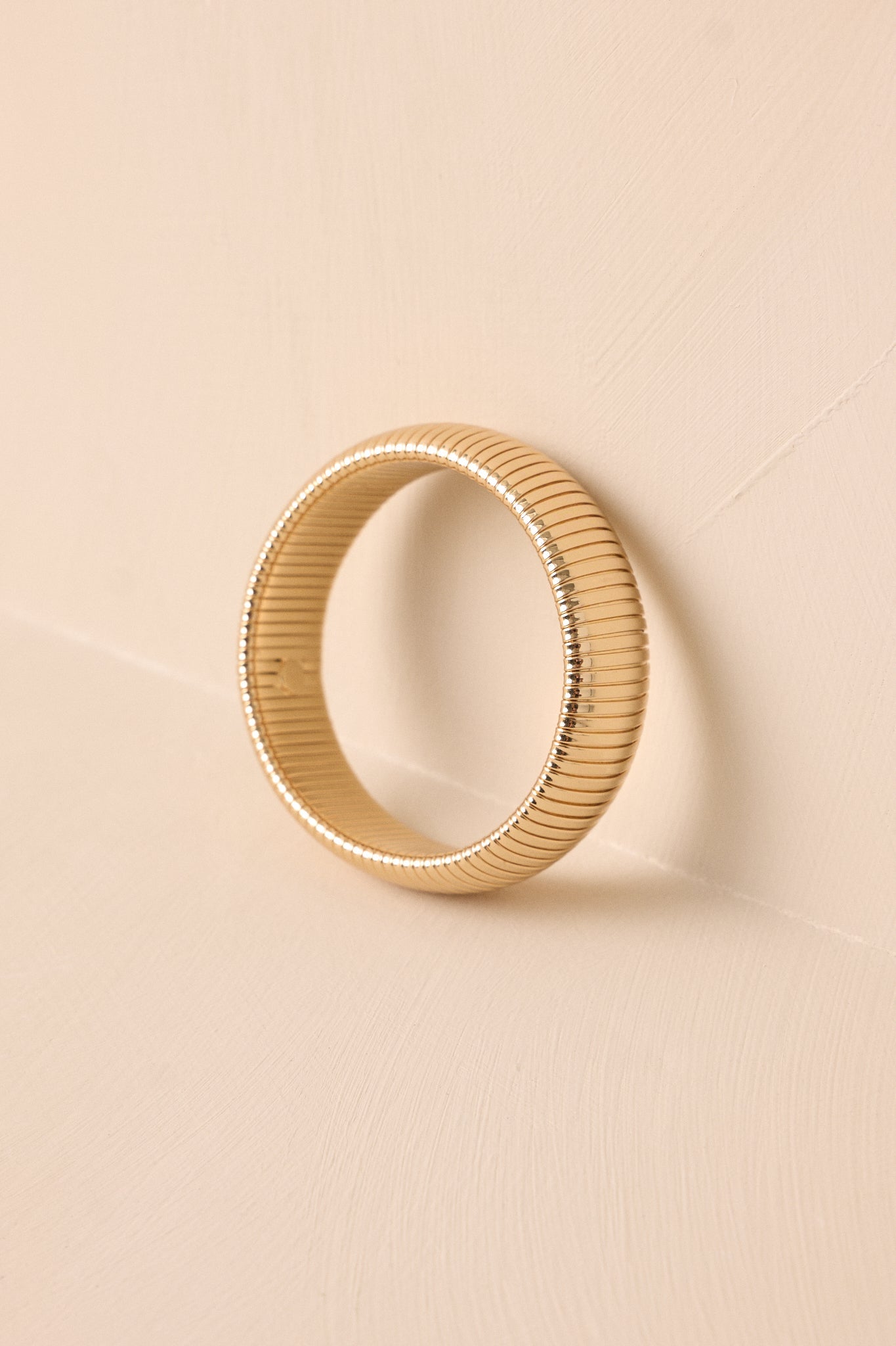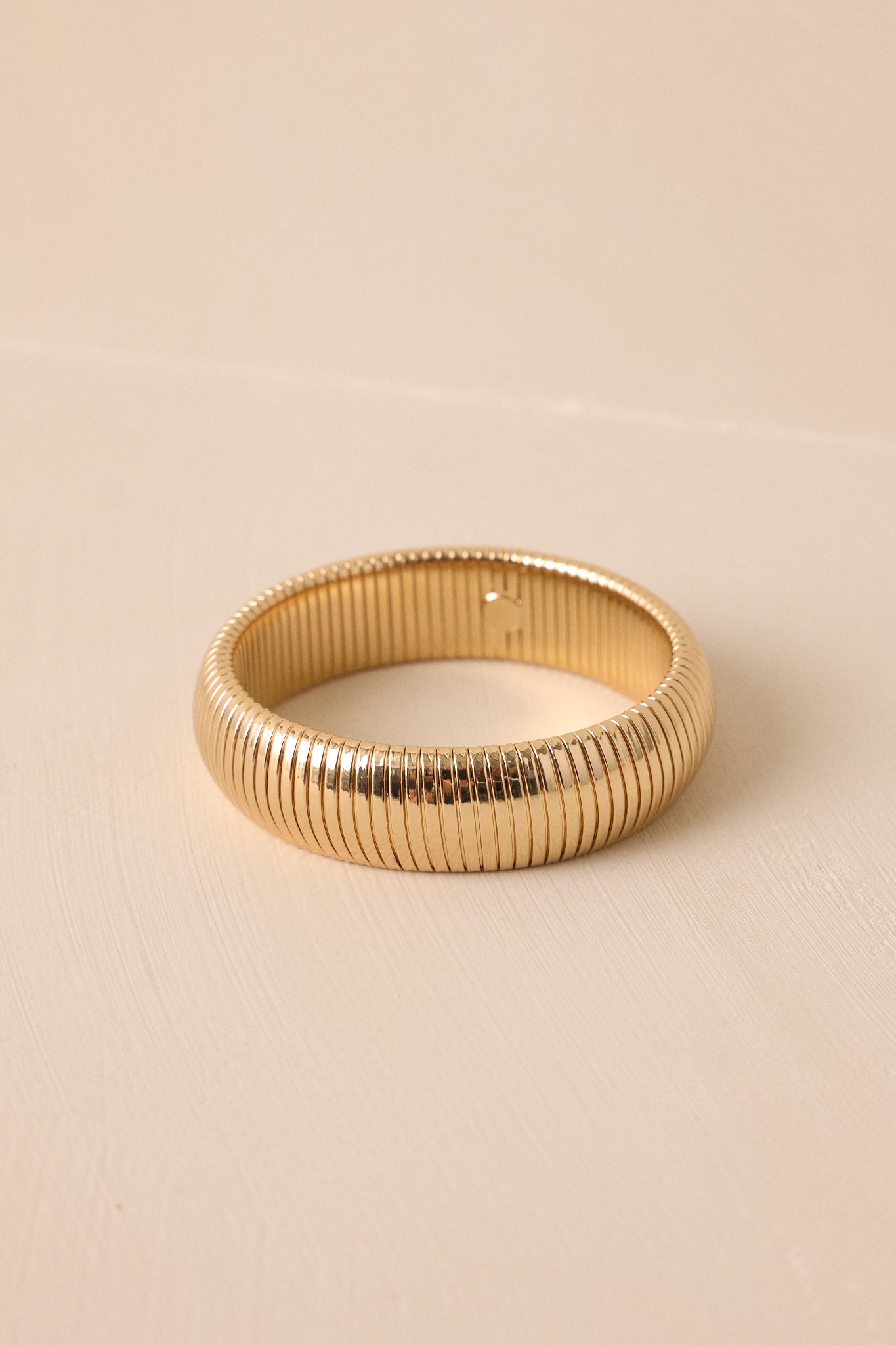 Add a touch of elegance to your outfit with our Heart of Glass Gold Omega Bracelet. Made with high-quality materials, this bracelet is hypoallergenic and suitable for everyday wear. Its intricate design and secure design make it a must-have accessory for any occasion. Elevate your style and show off your sophisticated taste with this timeless piece. This gold bracelet features gold hardware, thin horizontal beading and a closed design with minimal stretch to slide on.