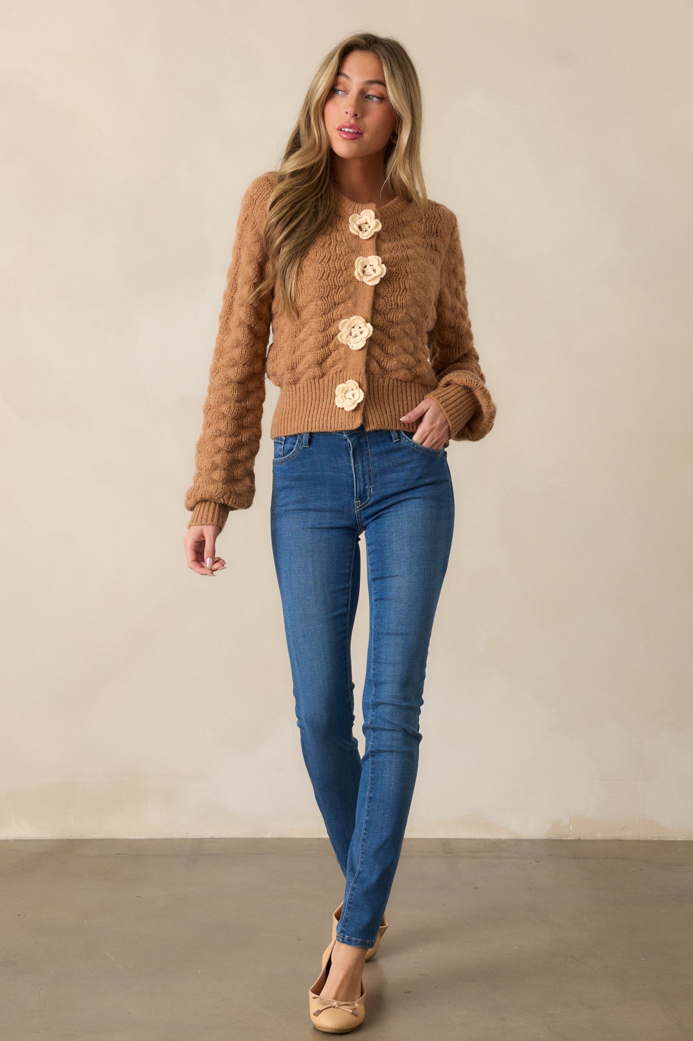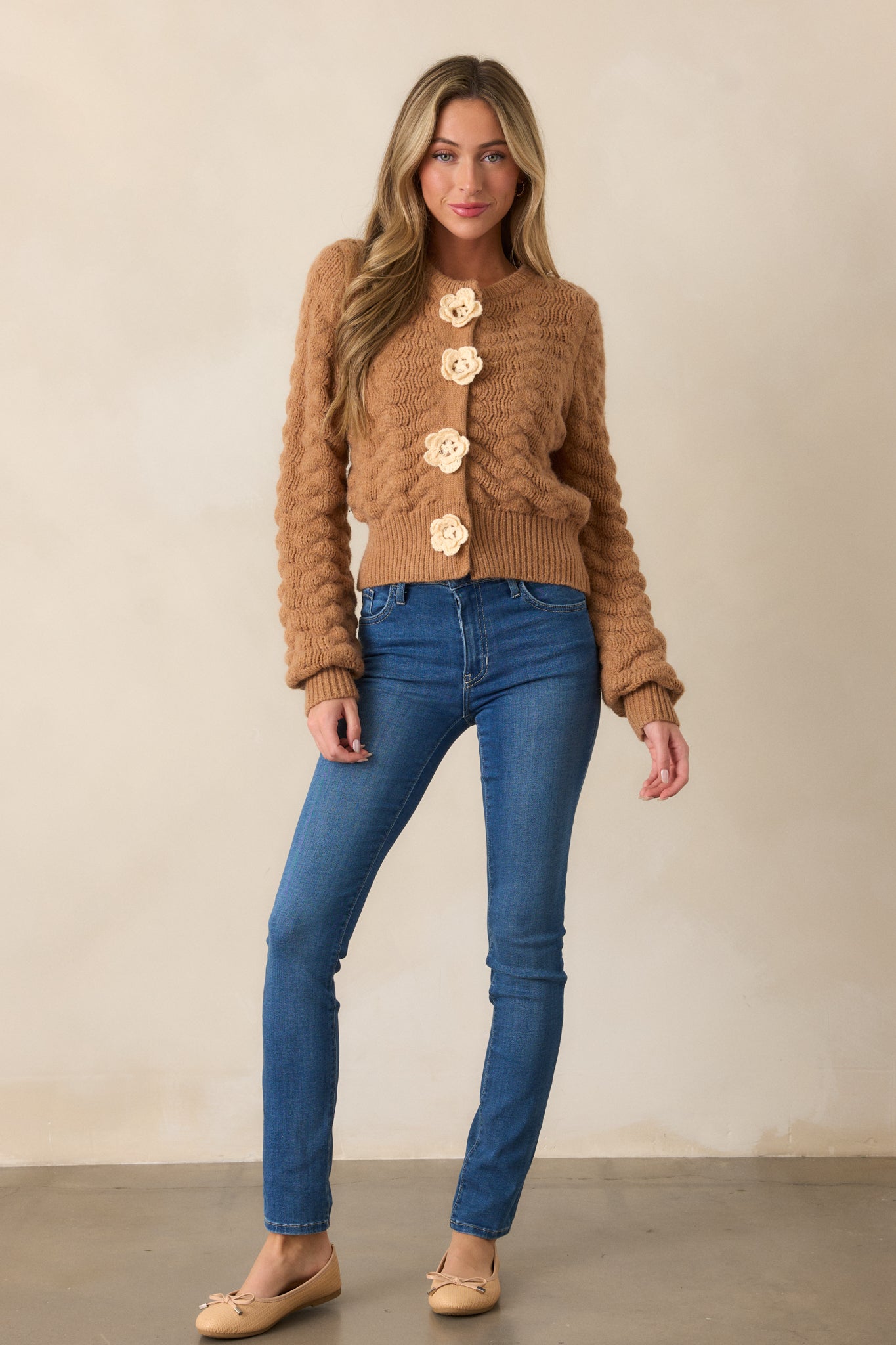 Stay cozy and stylish in our Hold Me Close Honey Cable Knit Cardigan. Its luxurious gold knit adds a touch of elegance while its cable detailing provides both comfort and texture. Perfect for any occasion, this cardigan will keep you warm and fashionable. This honey cardigan features a rounded neckline, four knit flower functional snap buttons, cable knit design, a thick ribbed knit hem and long sleeves with ribbed cuffs.