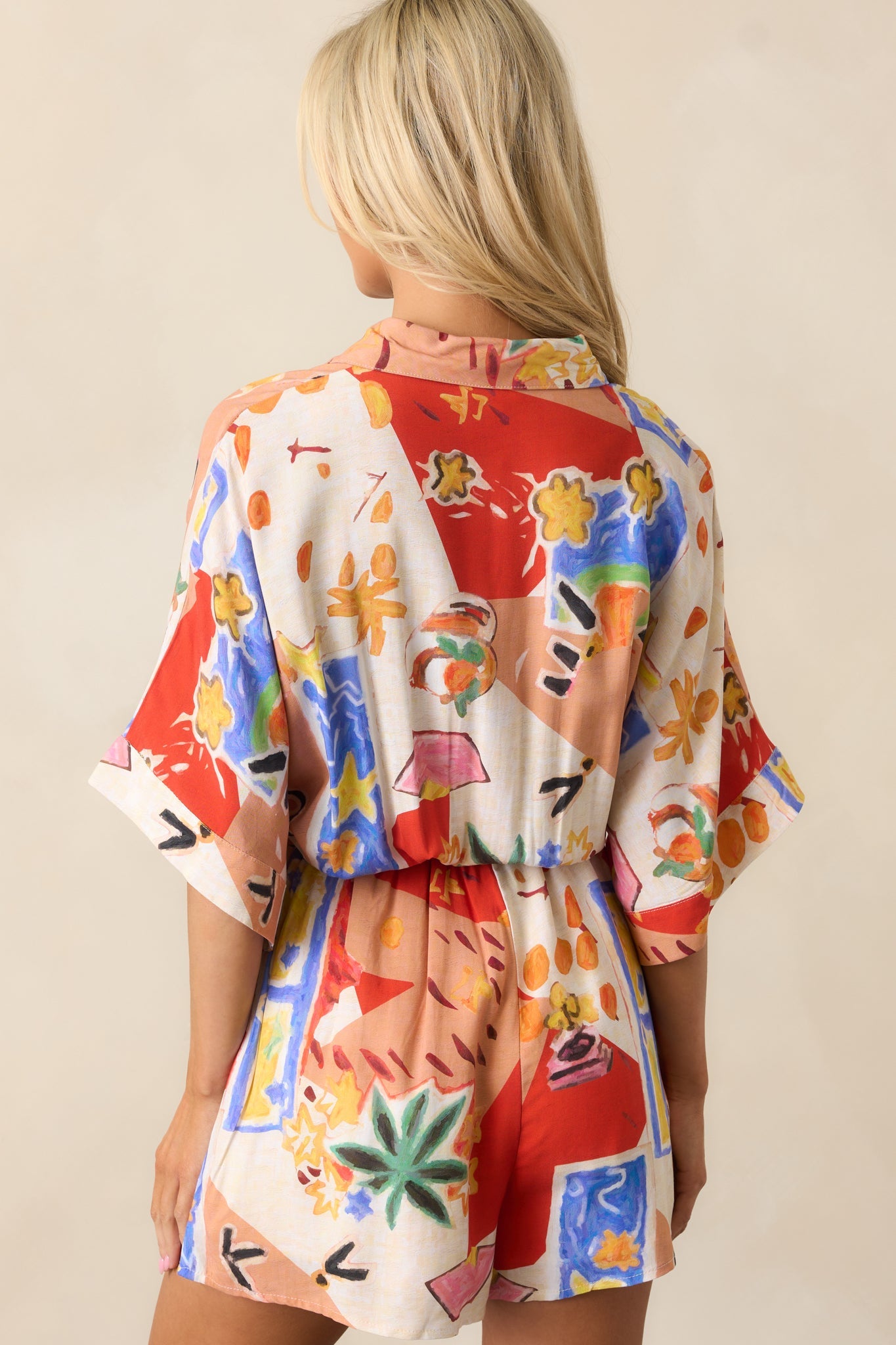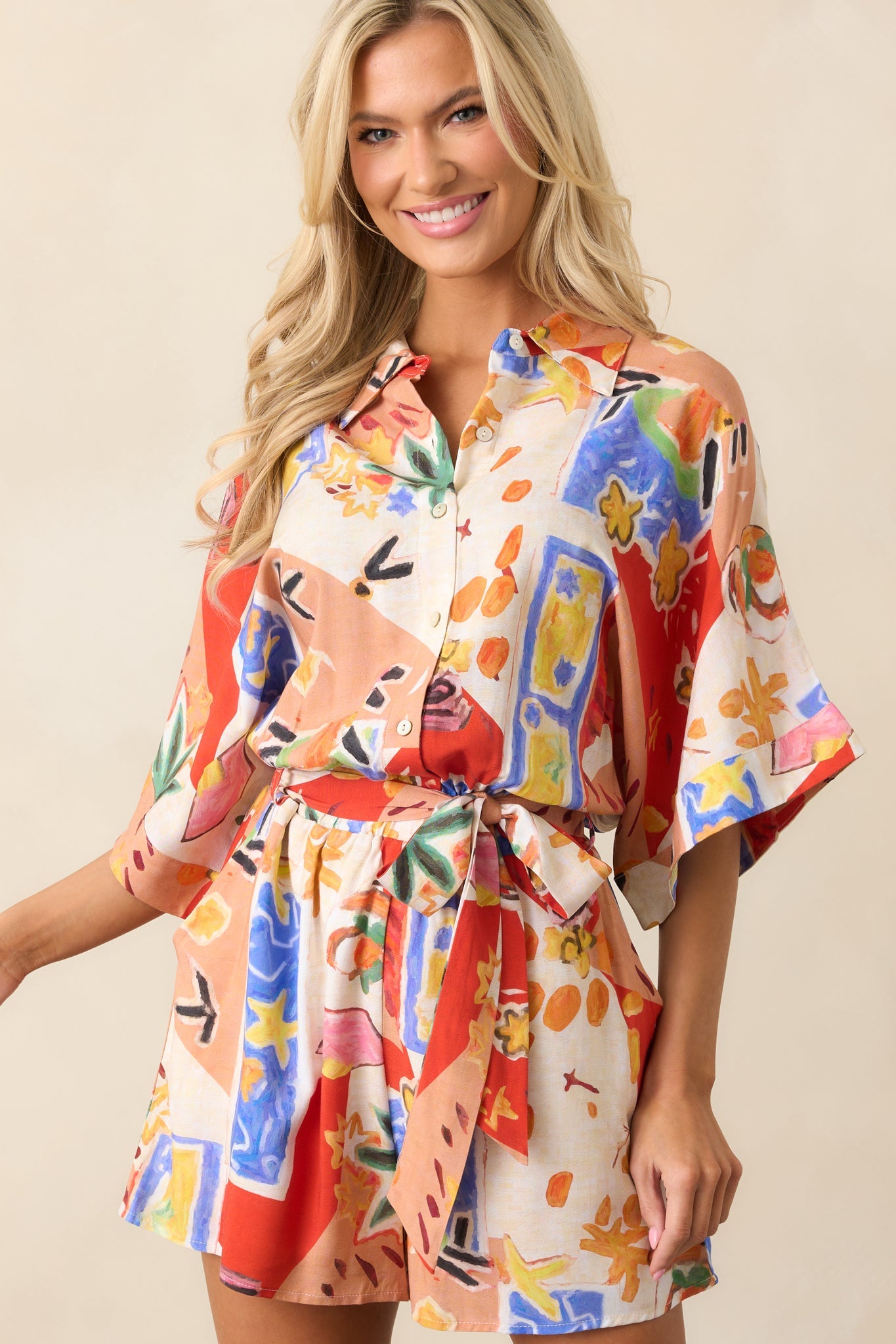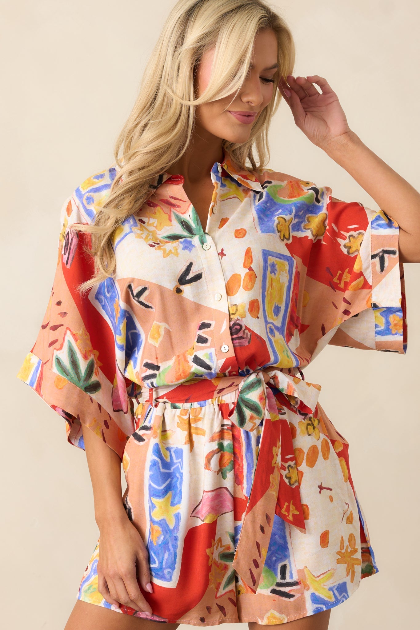 Looking for a stylish and comfortable romper? Look no further than the Horizon Escape Red Multi Tropical Print Romper. Made with a beautiful tropical print, this romper will keep you cool and fashionable all summer long. The lightweight fabric ensures maximum comfort. Perfect for any summer outing or vacation! This red romper features a collared neckline, button front design, vibrant tropical print, elastic waistband with self-tie belt, functional pockets, and short sleeves.